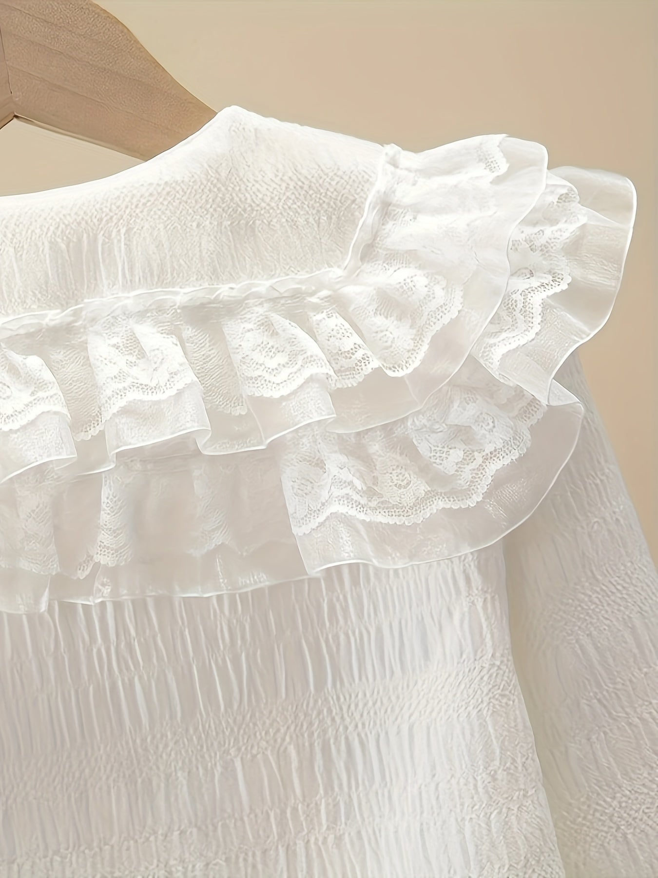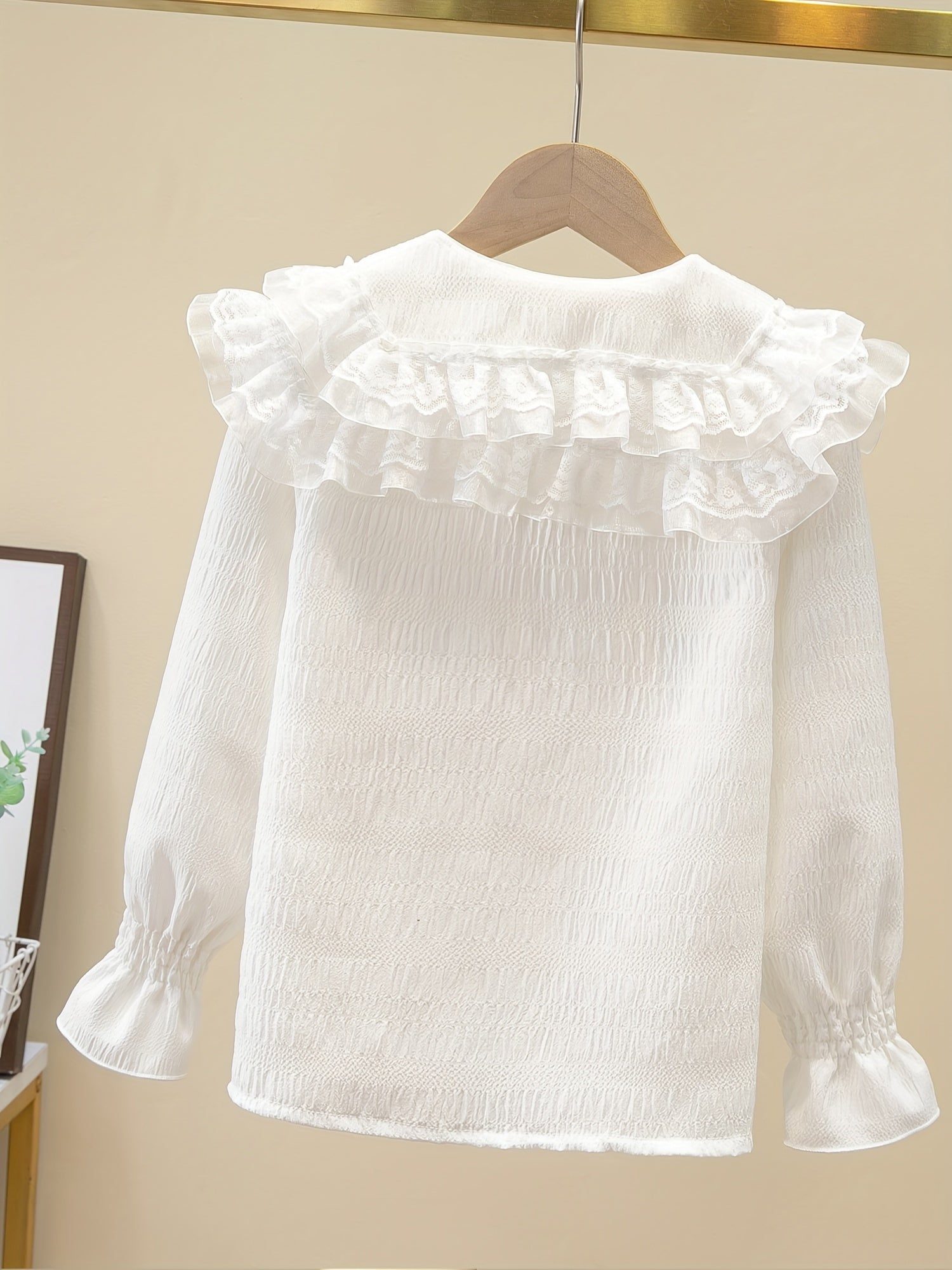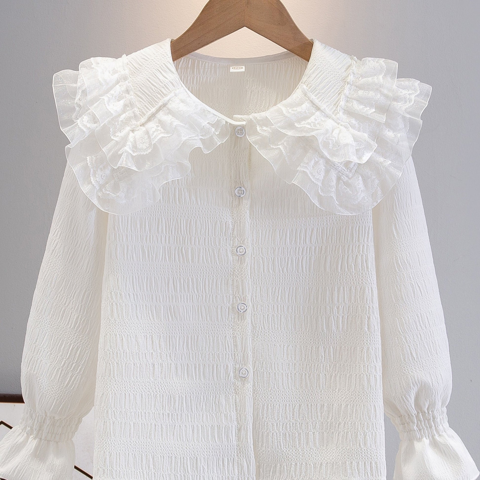 Девичья блузка с длинными рукавами из шифона с рюшами на воротнике однотонного цвета, идеально подходящая для милого академического стиля весной/осенью. Изготовлена из полиэстера, идеально подходит для повседневной носки.