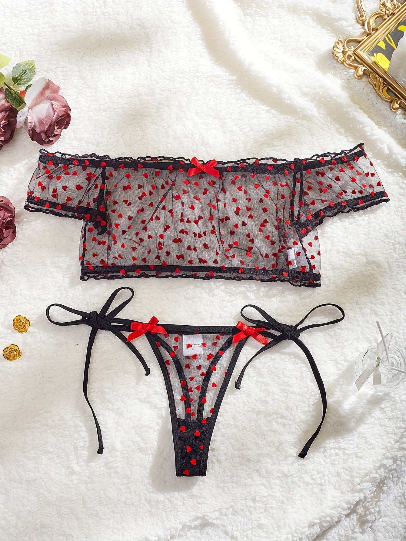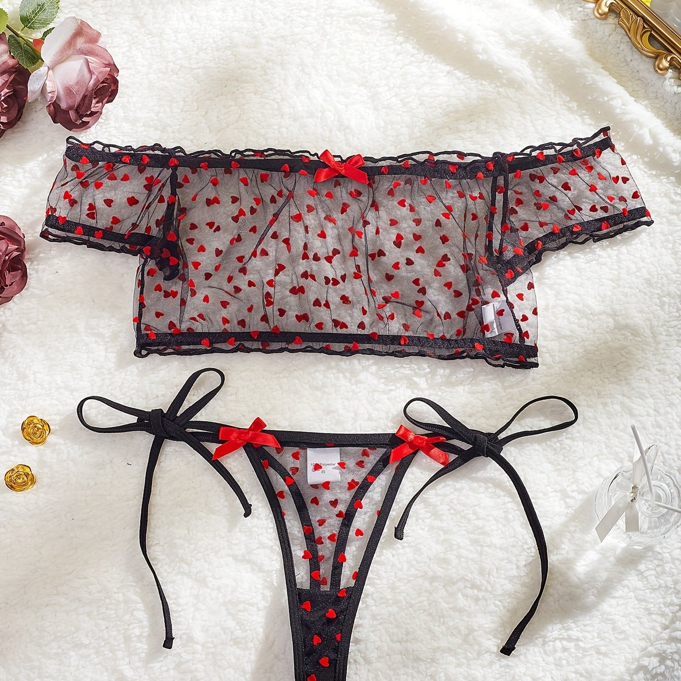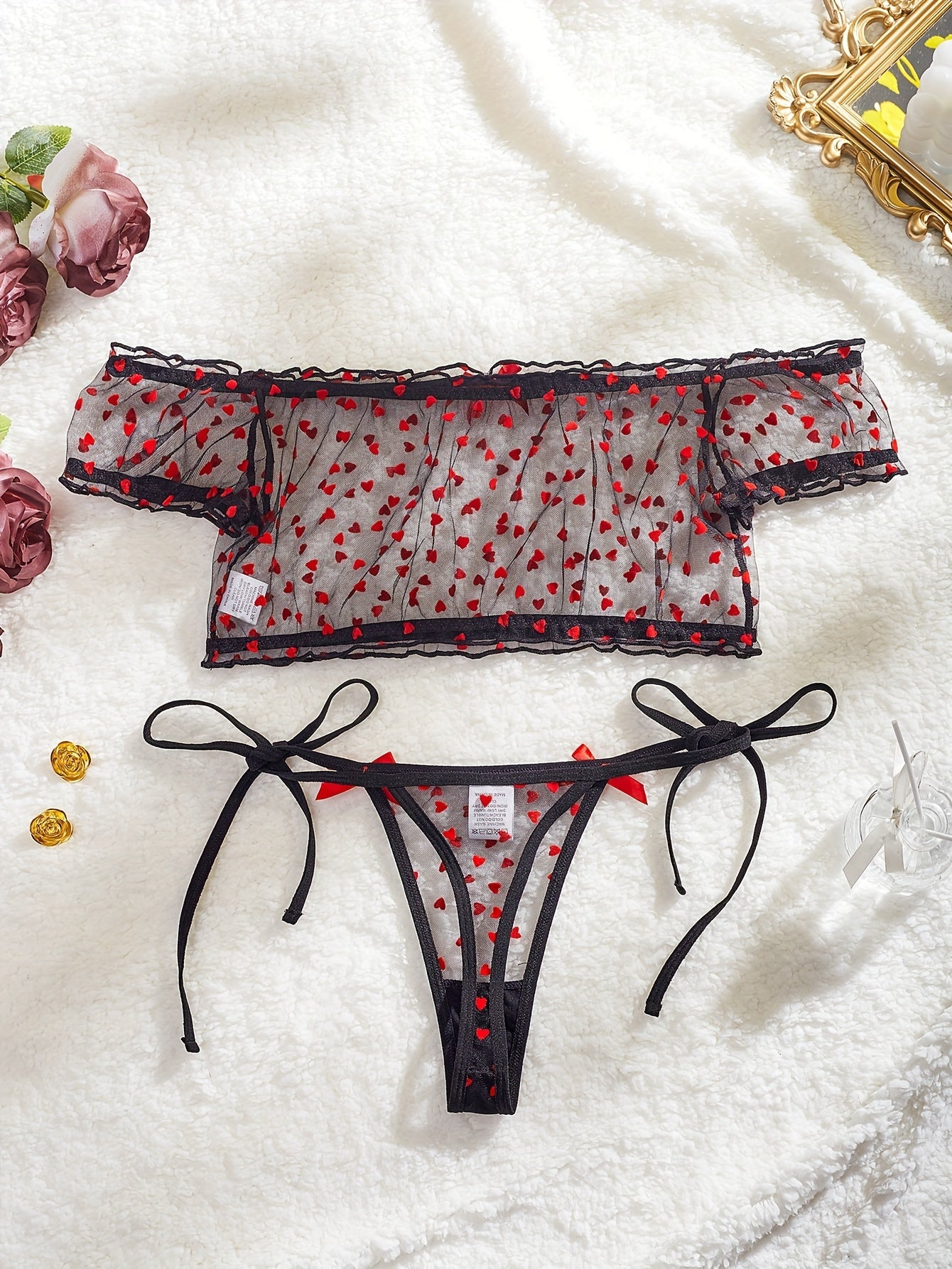 Комплект кружевного белья с сердечками, коротким рукавом и отделкой из рюшей, топ-кроп и стринги.