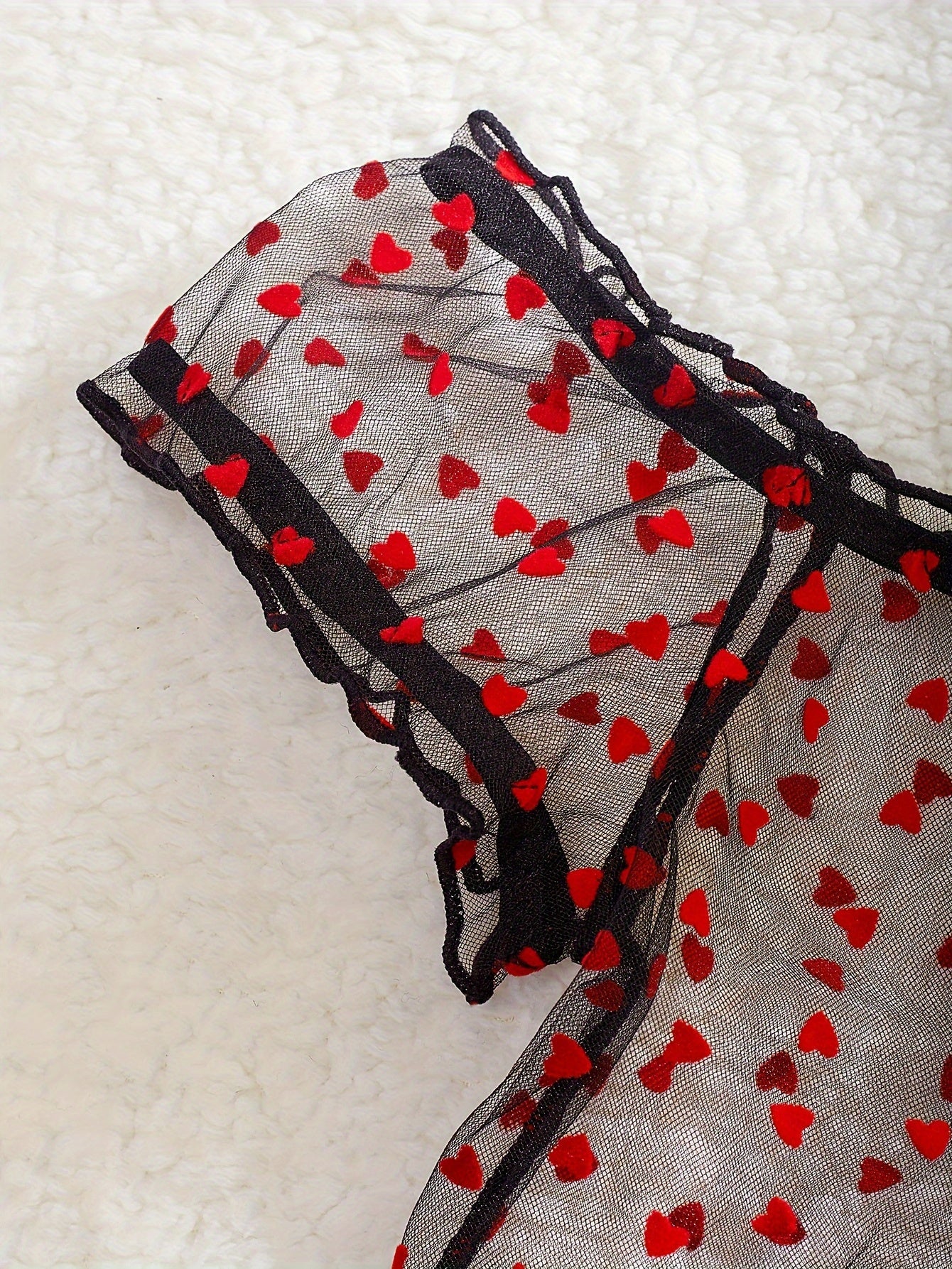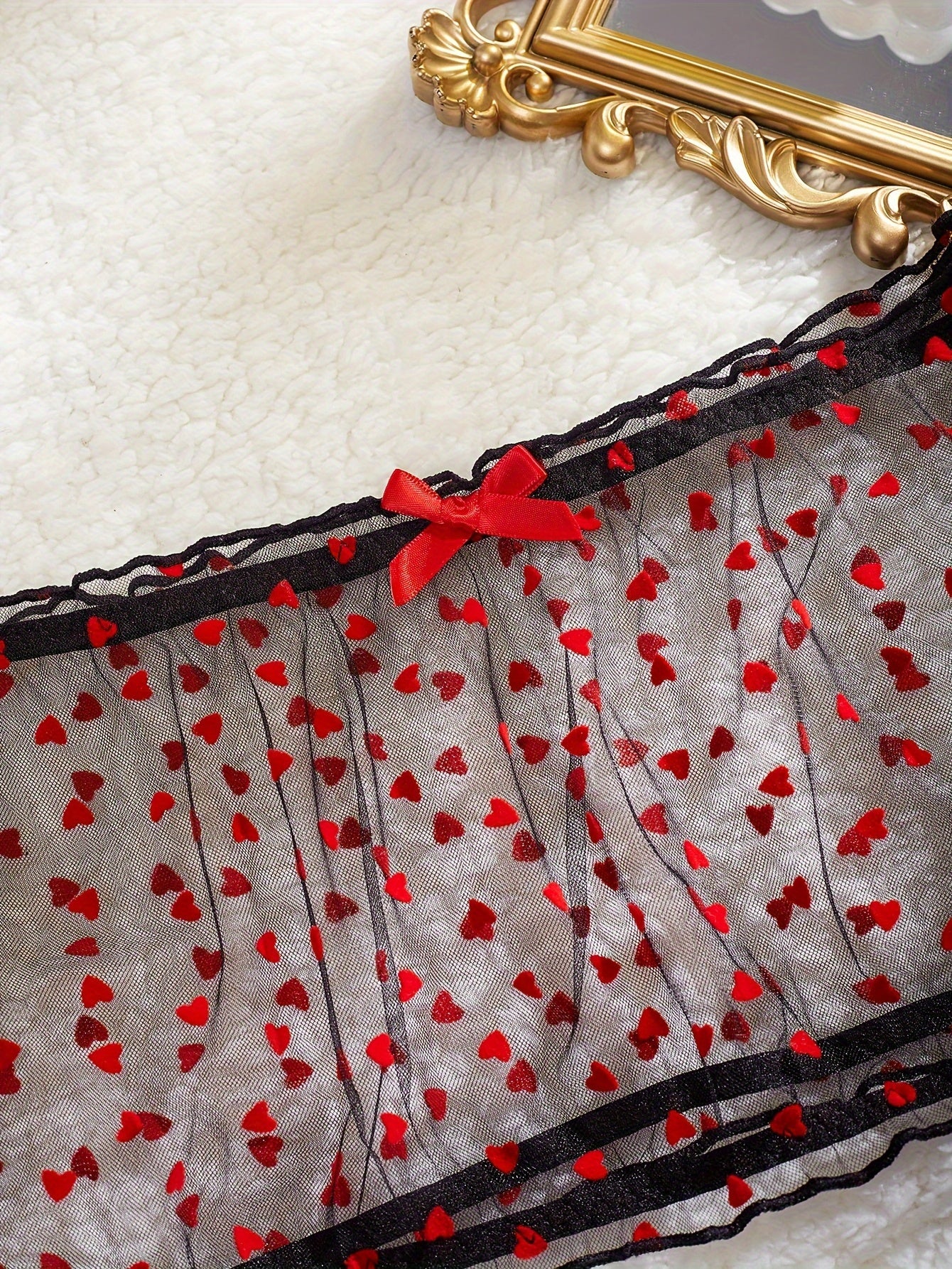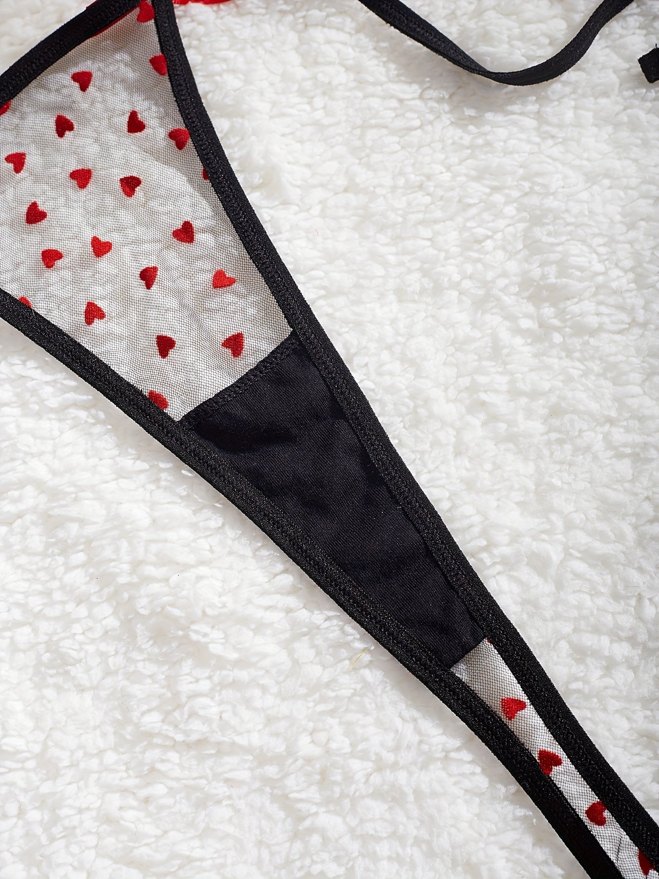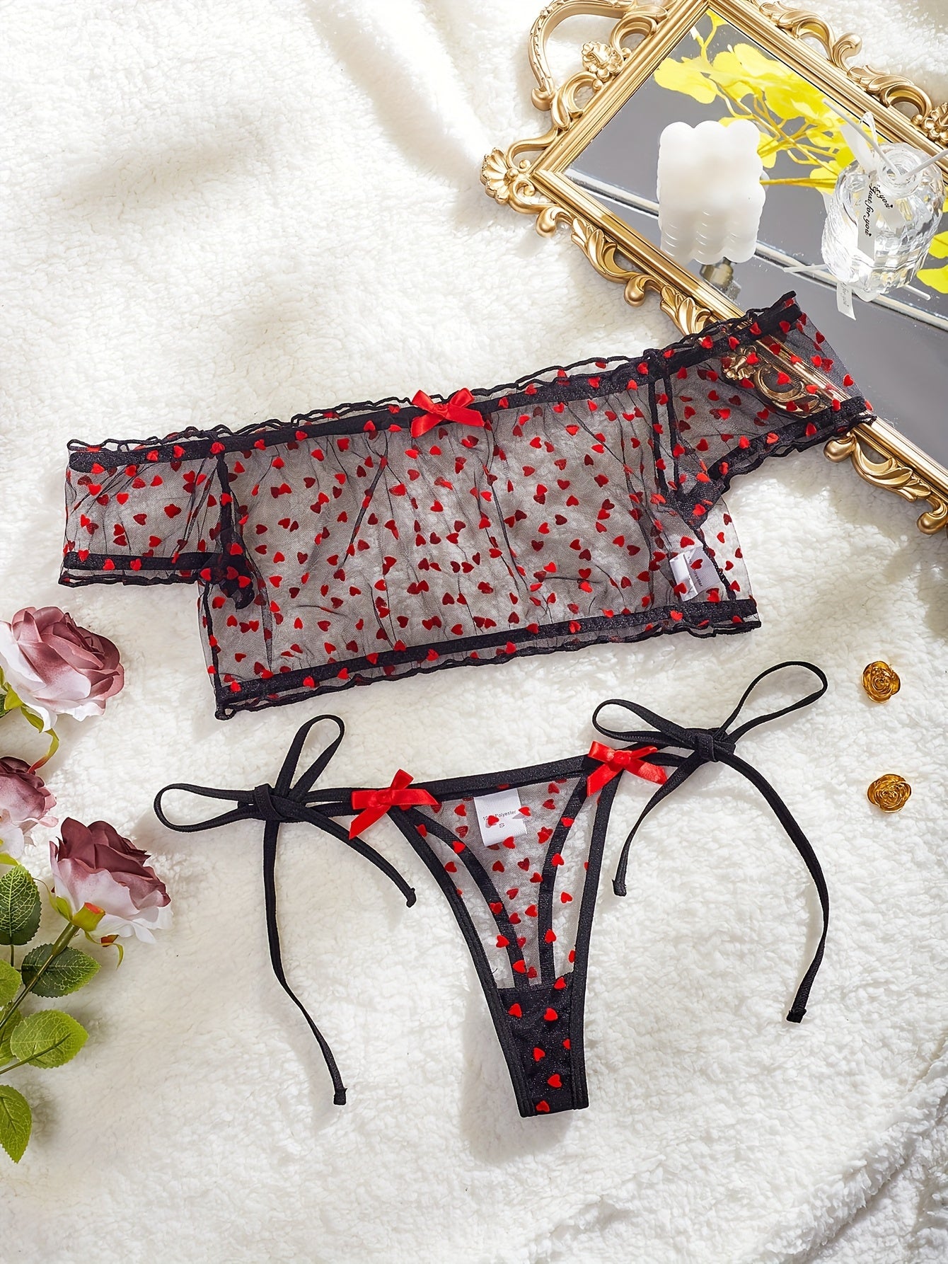 Комплект кружевного белья с сердечками, коротким рукавом и отделкой из рюшей, топ-кроп и стринги.