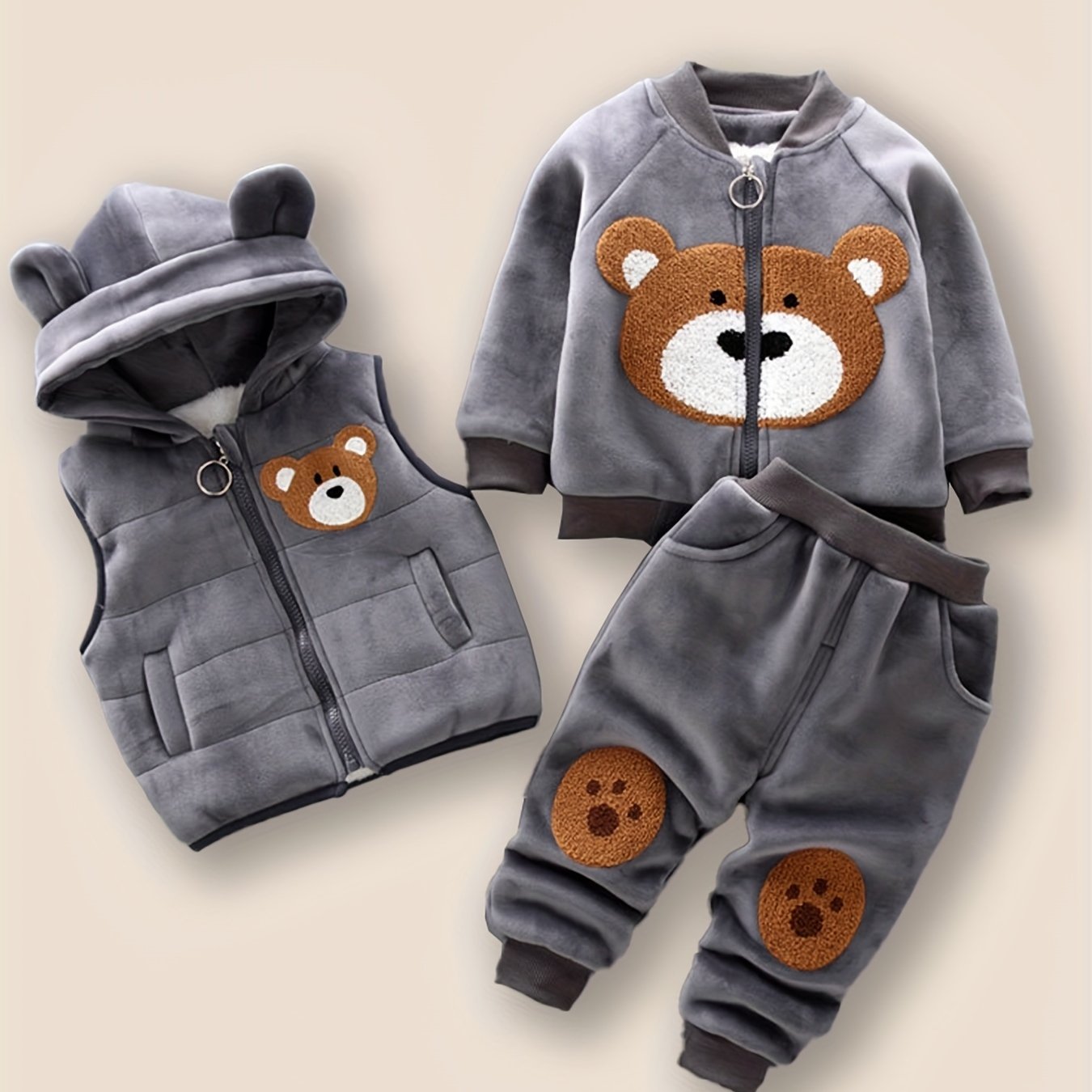 Комплект из 3 предметов для мальчиков-тоддлеров HIBOBI с топом с аппликацией медведя, капюшонной курткой и брюками, выполненными на 100% из полиэстера с легкой эластичностью. Обычный крой для осени/зимы и уличной носки.