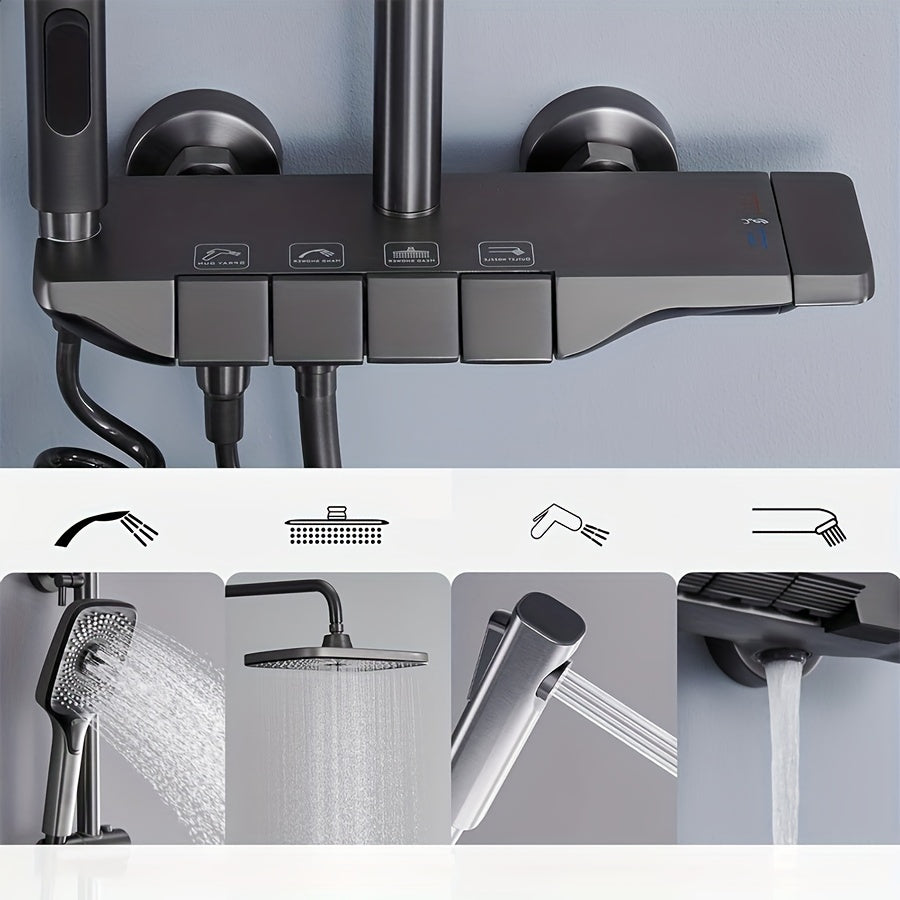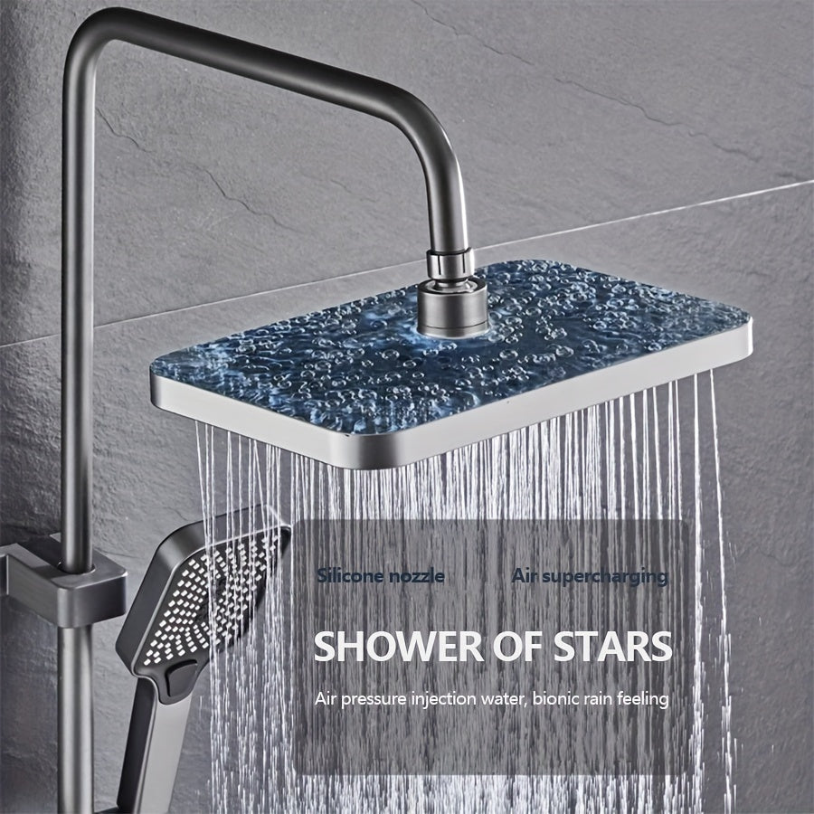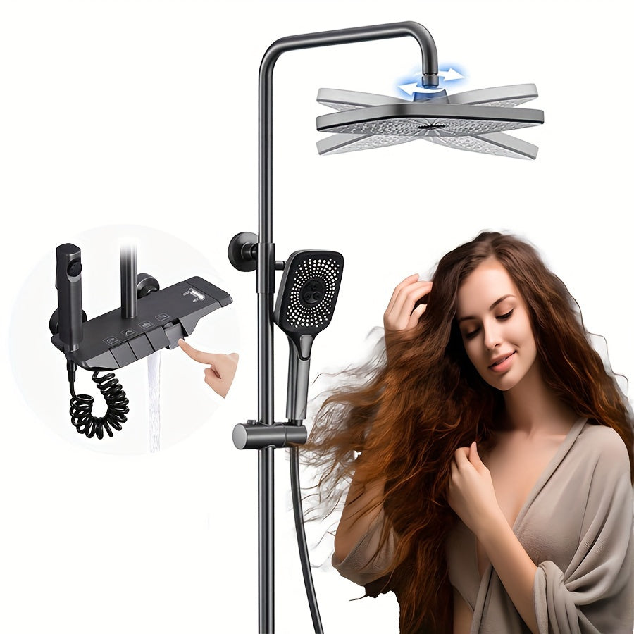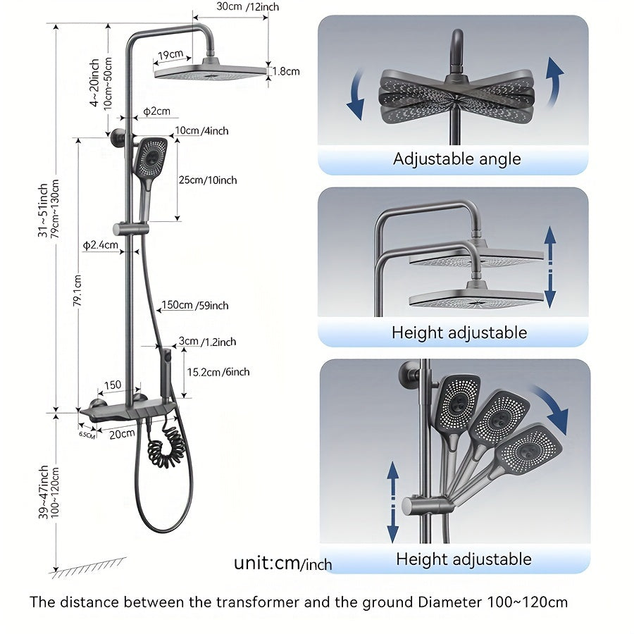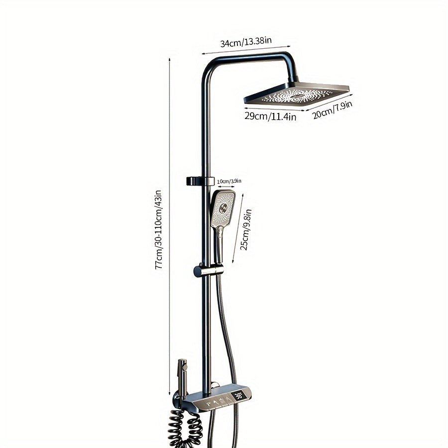 Душевая головка высокого давления размером 12 дюймов с ручным душем с 4 функциями, изготовленная из металла и пластика. Не требует электричества или батареек, включает в себя дисплей температуры.