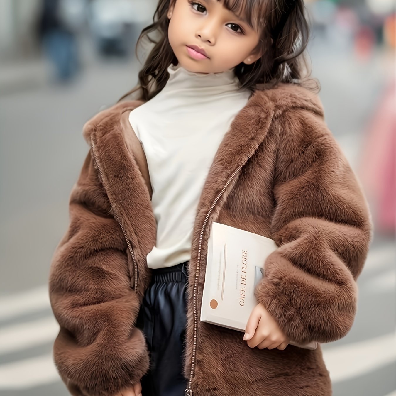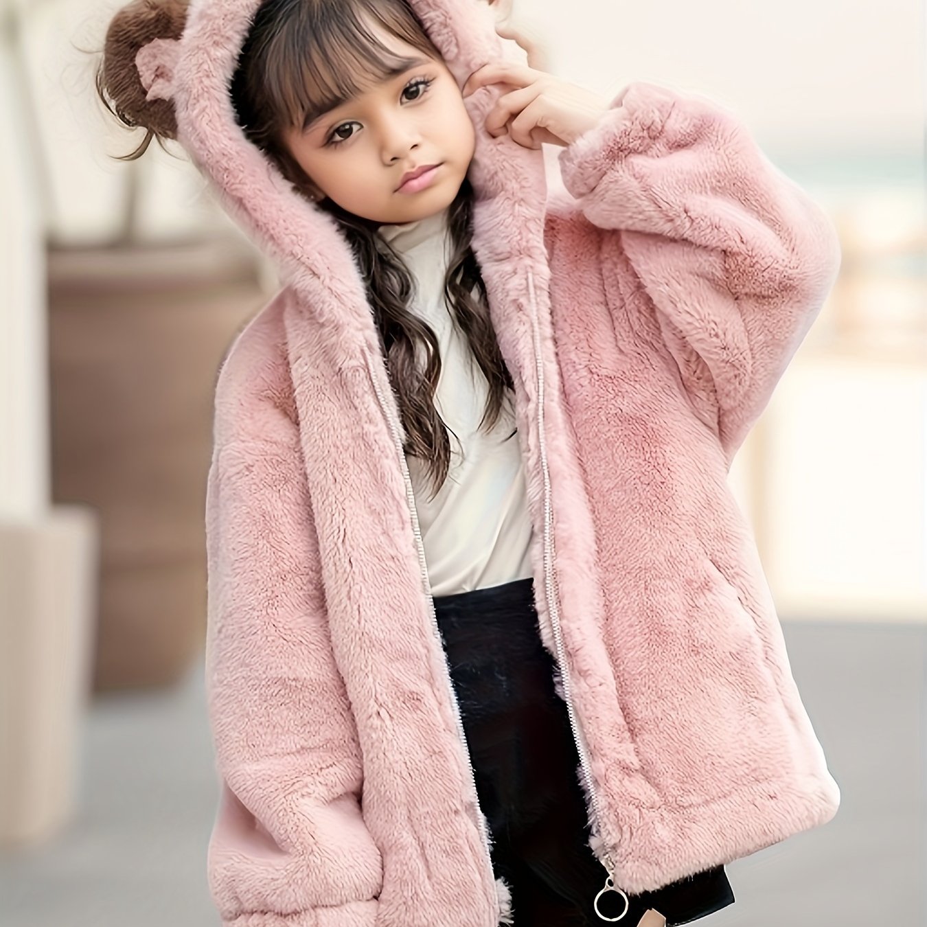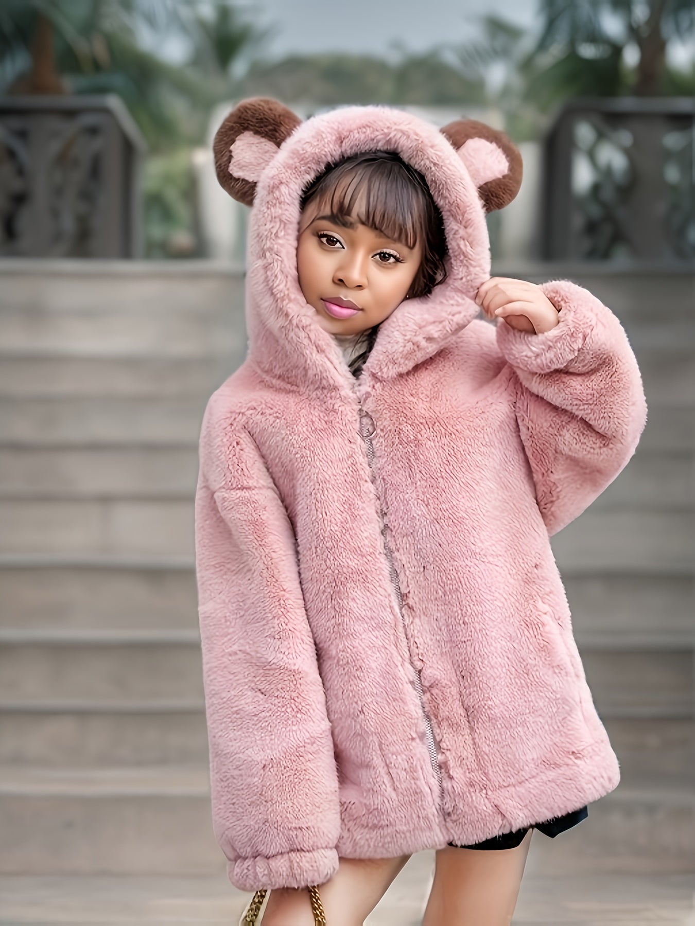 Детский пуховик из искусственного меха с капюшоном в виде медвежьих ушей для теплой зимней одежды