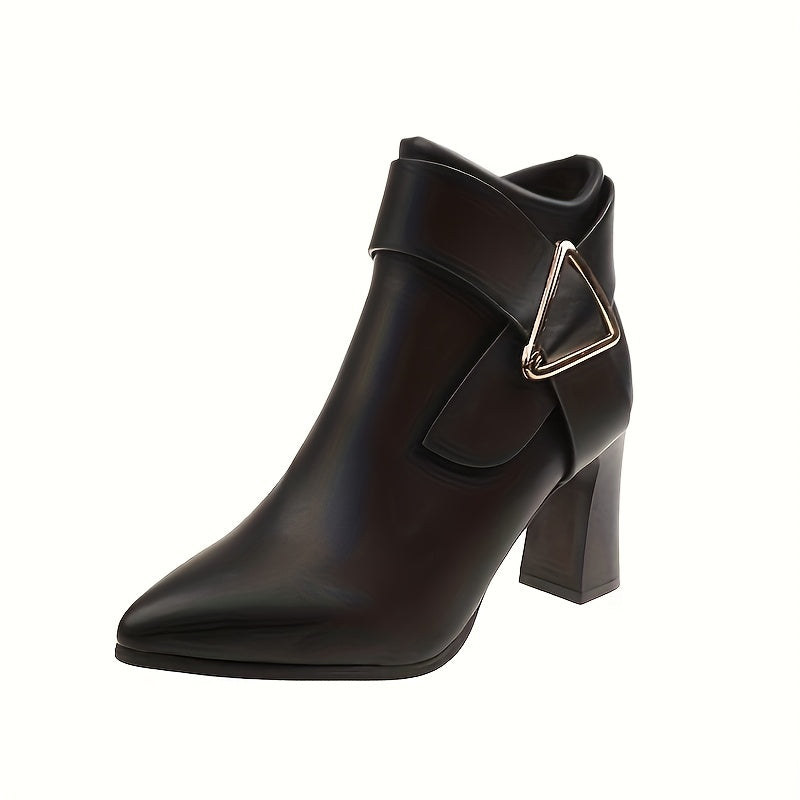 Кожаные женские ботильоны в стиле Челси с однотонным заостренным носком и квадратным каблуком. Особенности: застежка на молнии, верх из полиуретана, подкладка из супертонкого волокна и пластиковая подошва.