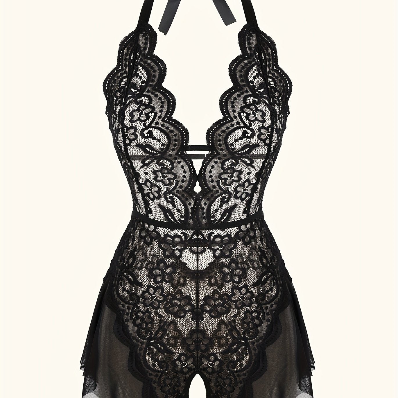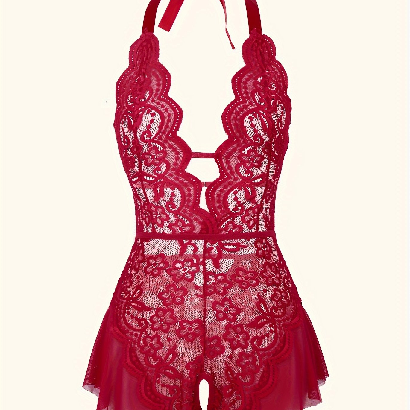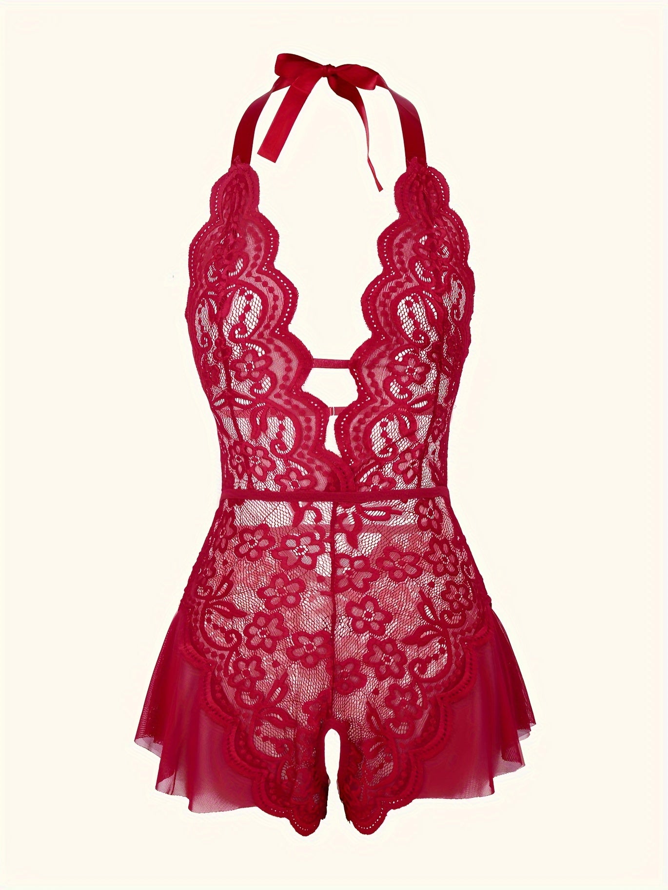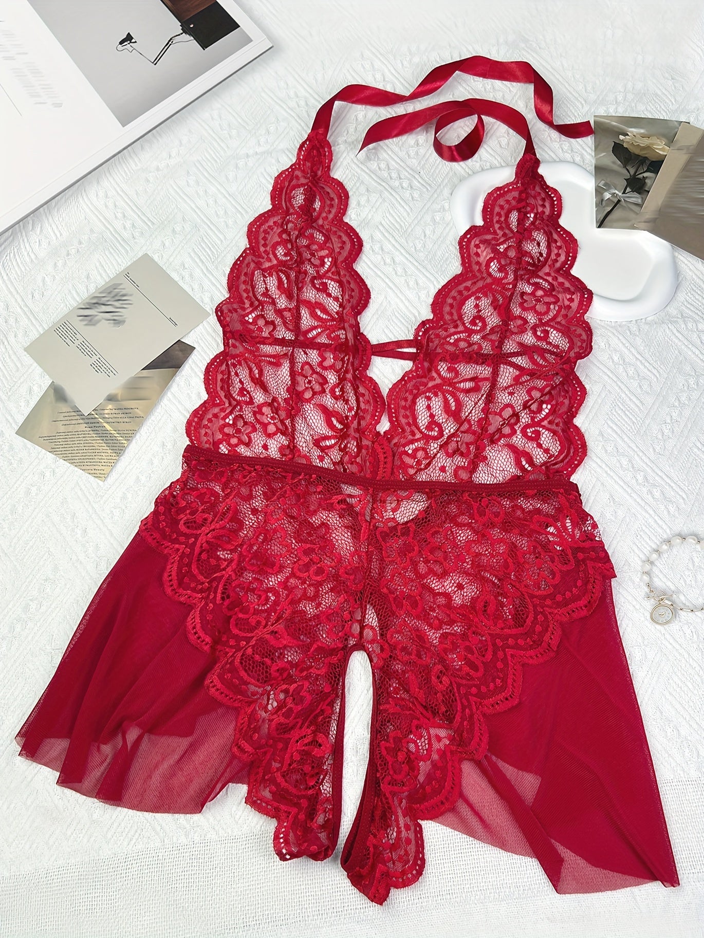 Кружевной сетчатый тедди для женщин с глубоким V, открытым промежностью, боди-халтер, сексуальное белье