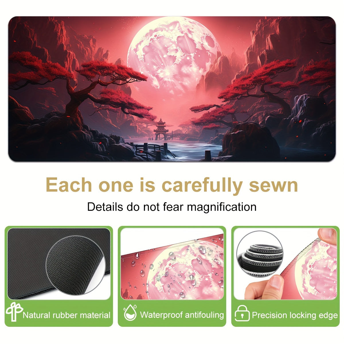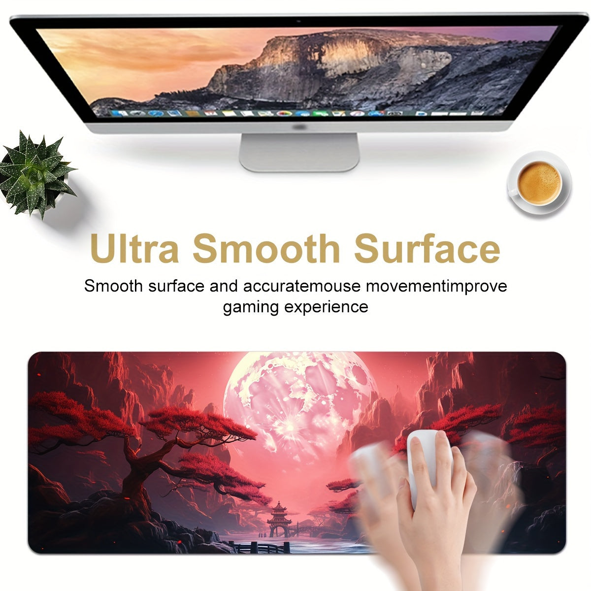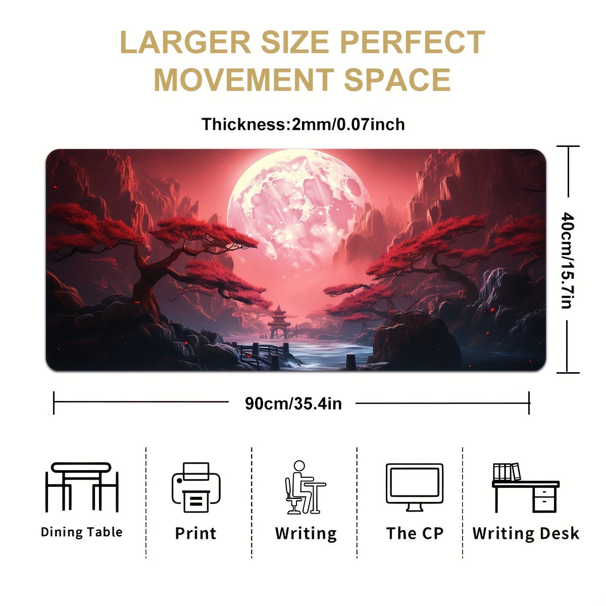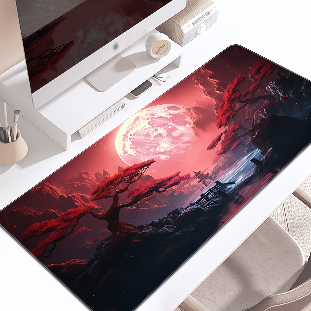 Большой игровой коврик для мыши с красным пейзажным дизайном, нескользящая резиновая основа, прошитые края