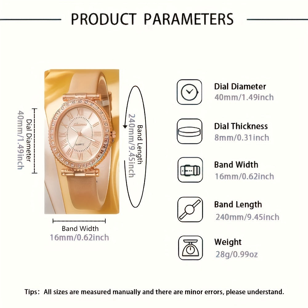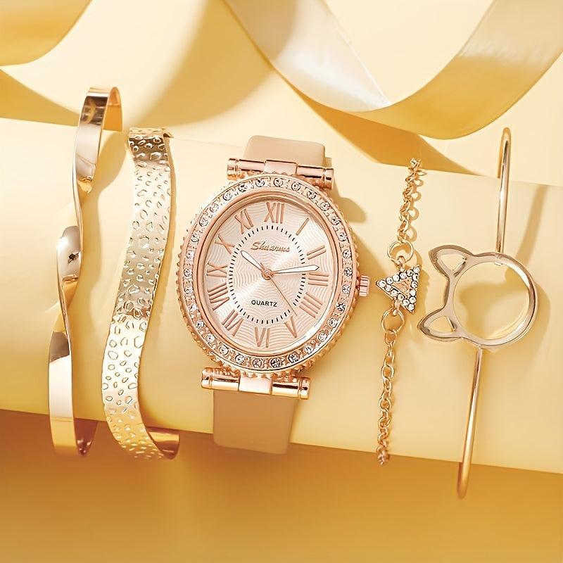 Роскошный набор из 5 женских часов с кварцевым механизмом и стразами. Элегантный овальный корпус с ремешком из PU-кожи. Идеальный подарок для мамы или для нее. Модные часы с классическим дизайном.