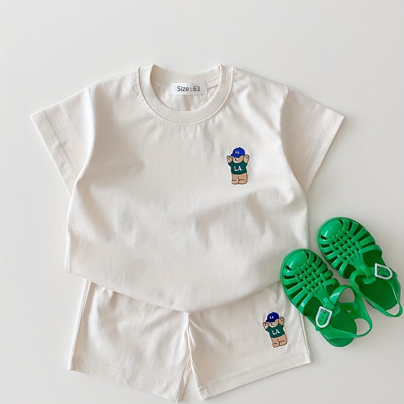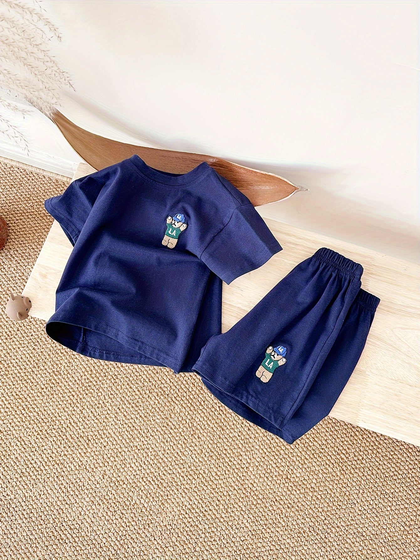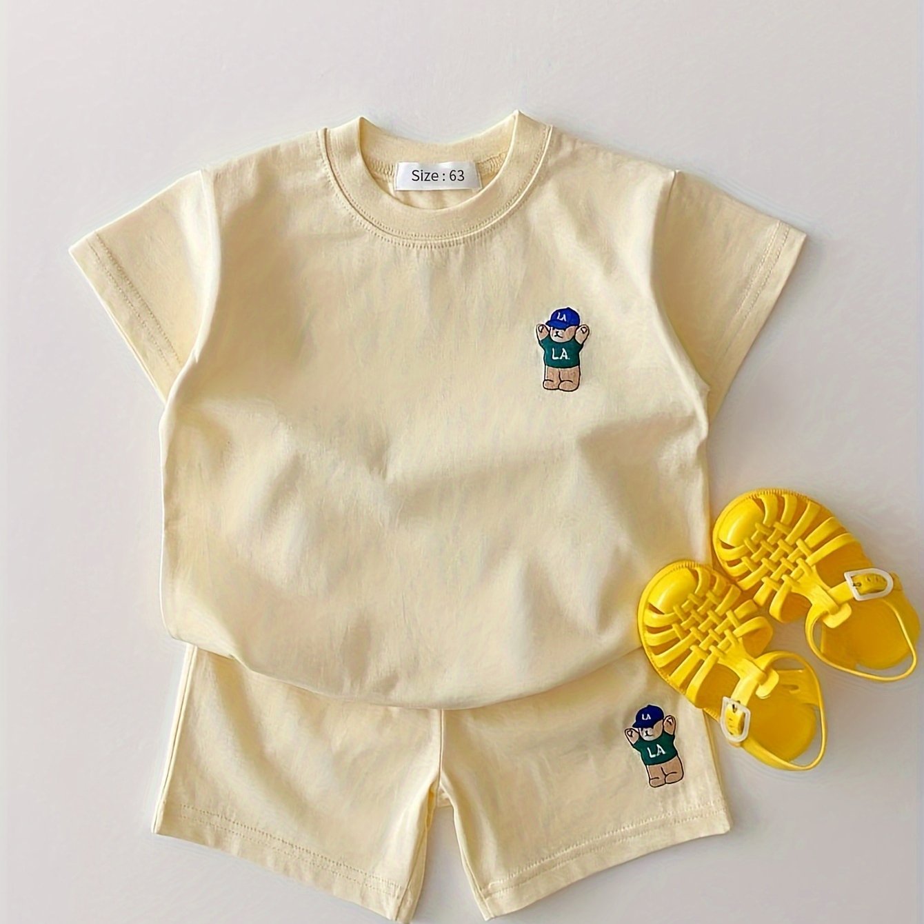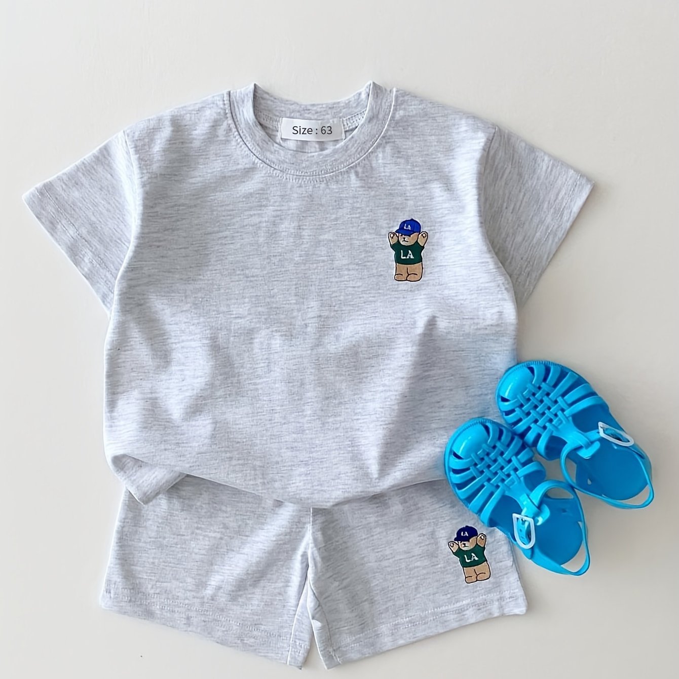 Детский комплект шортов повседневных из хлопкового смесового материала с коротким рукавом, мультяшный медведь, лето, для мужчин, женщин и детей
