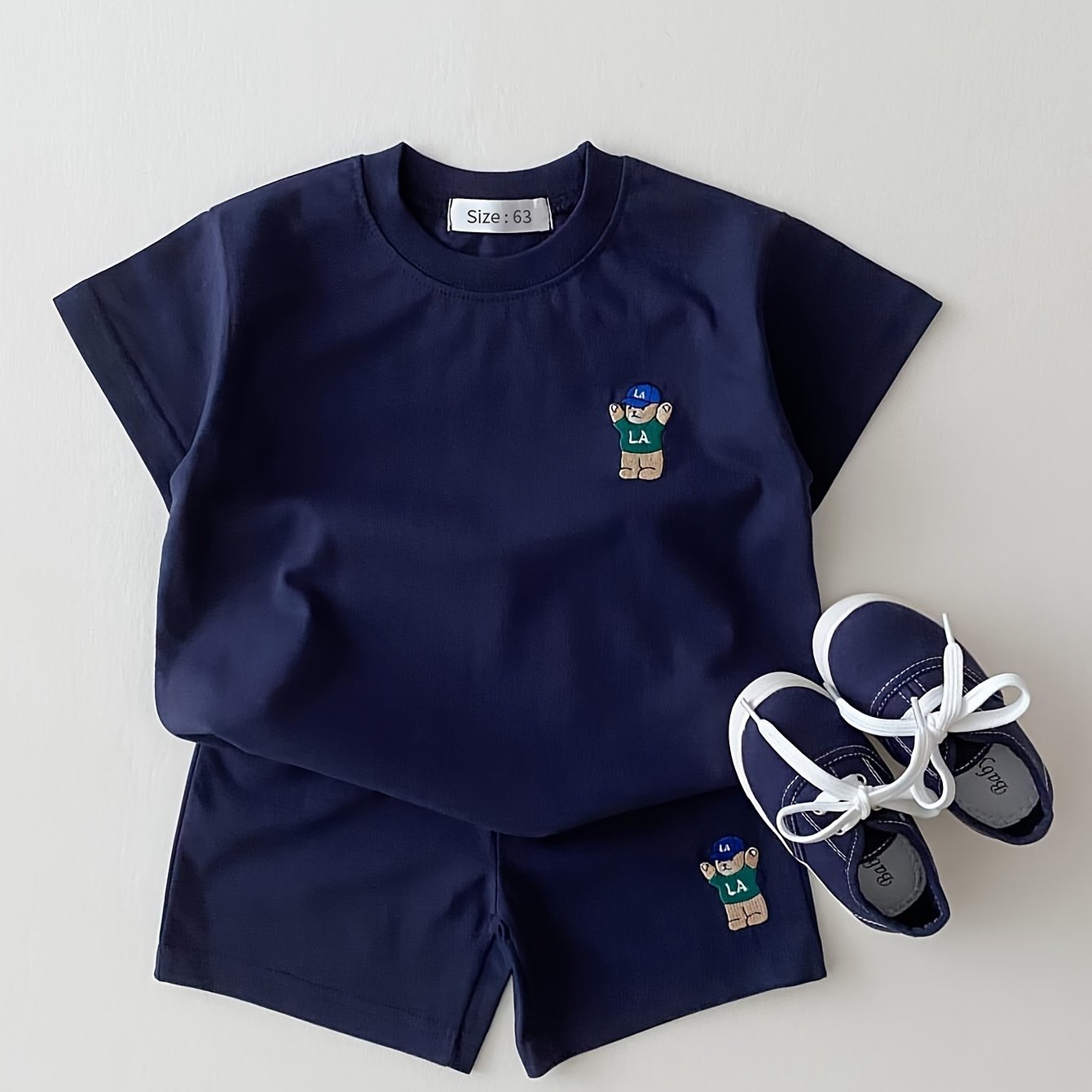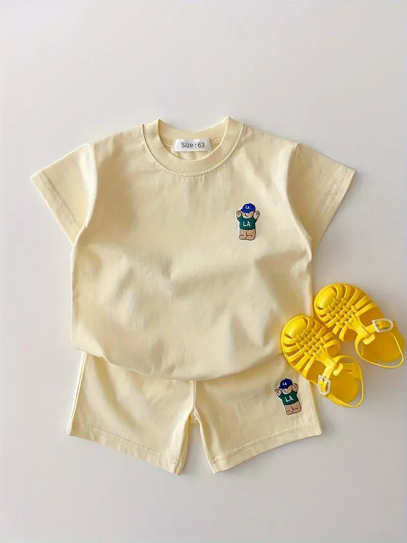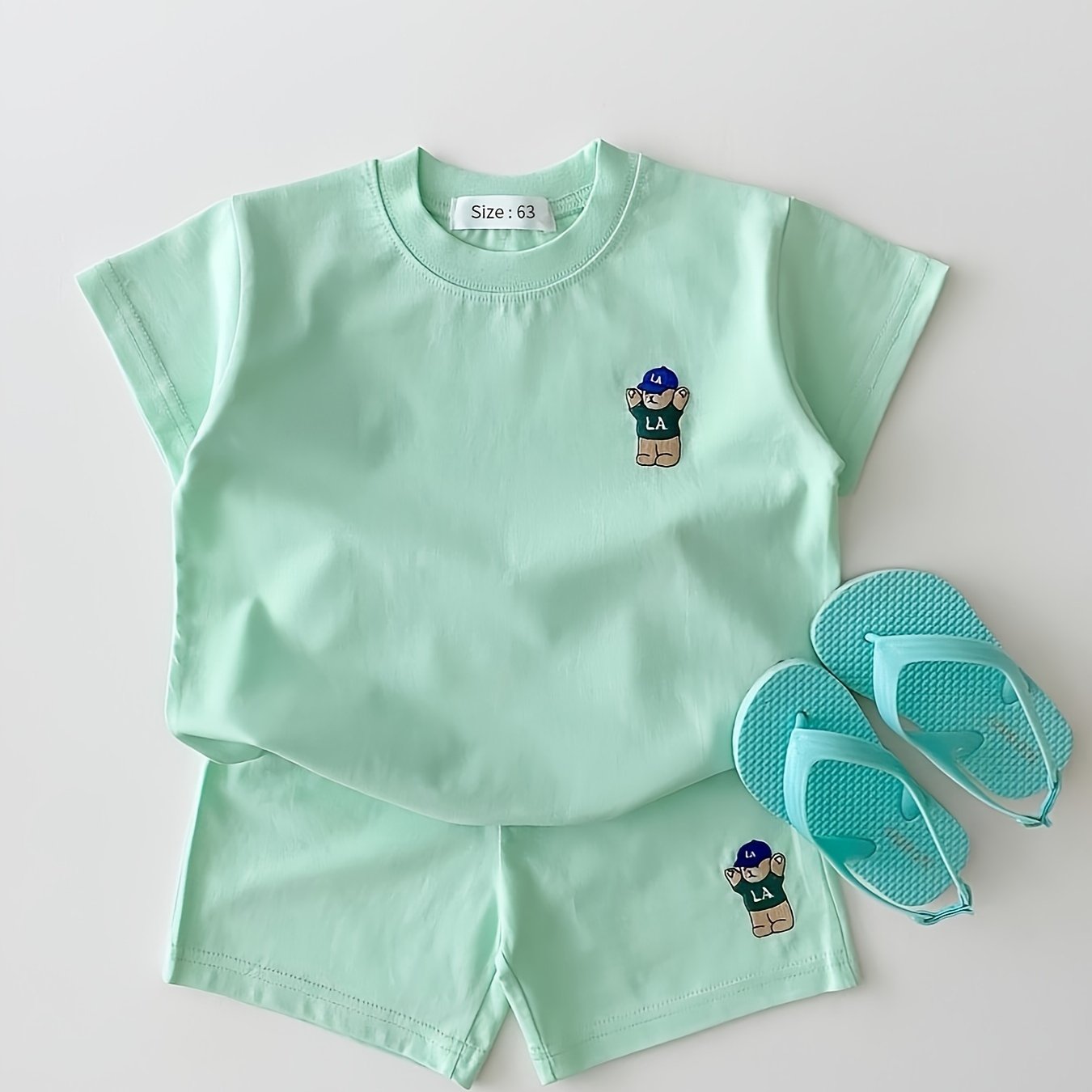Детский комплект шортов повседневных из хлопкового смесового материала с коротким рукавом, мультяшный медведь, лето, для мужчин, женщин и детей