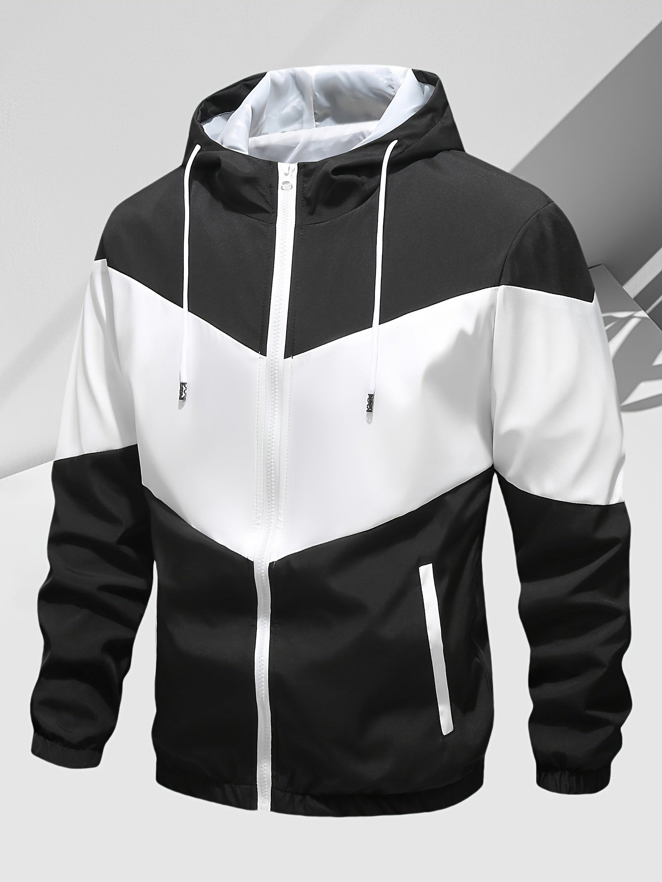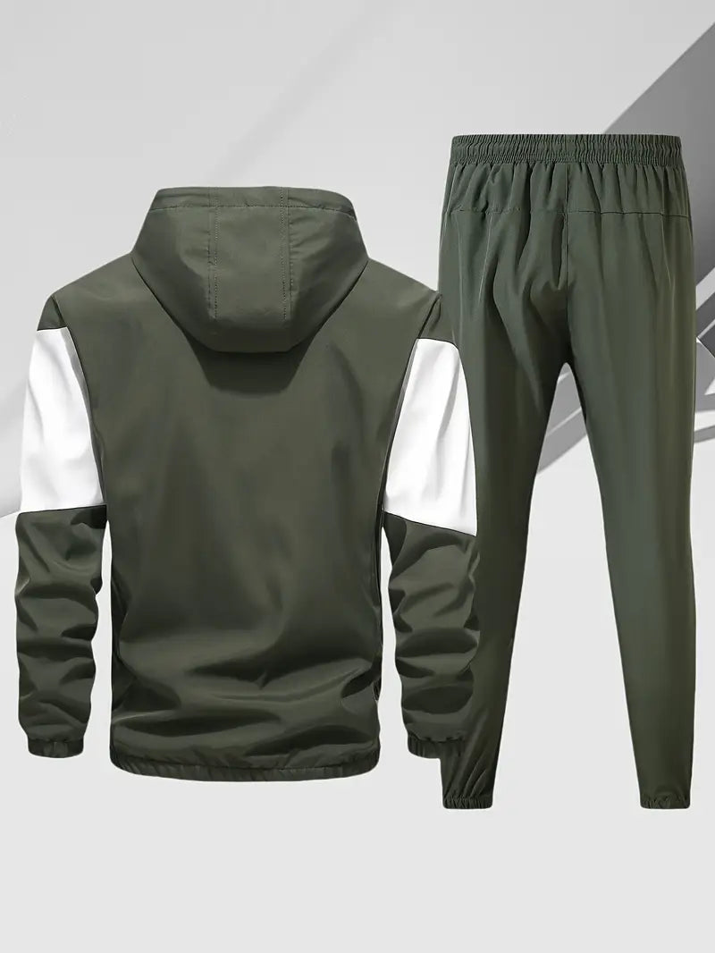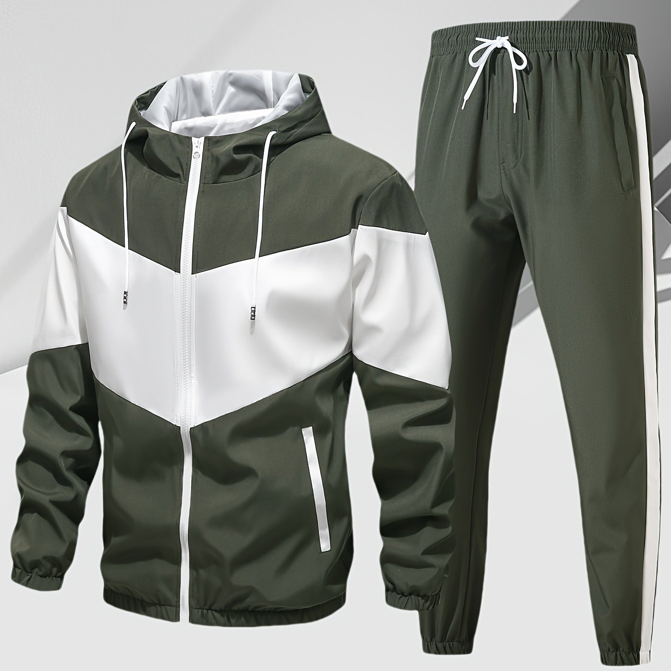 Мужской повседневный двухпредметный комплект из тканого материала, цветной блок, с капюшоном на молнии и штанами на шнурке