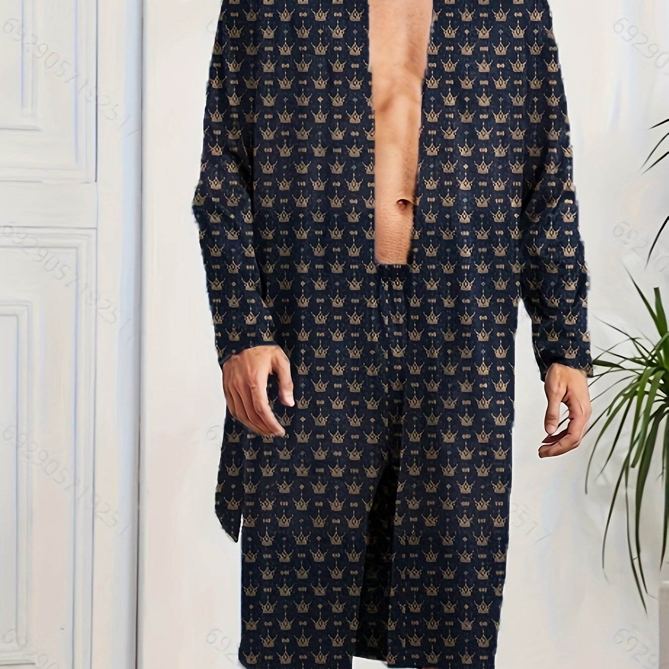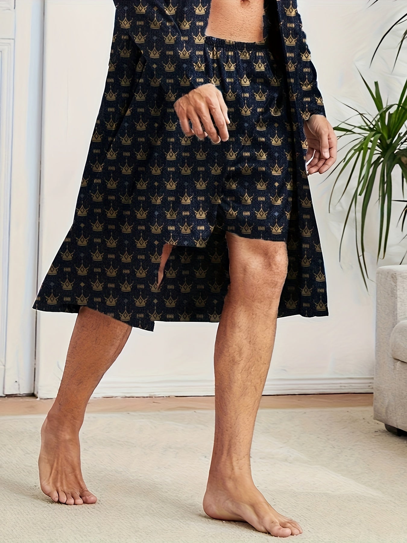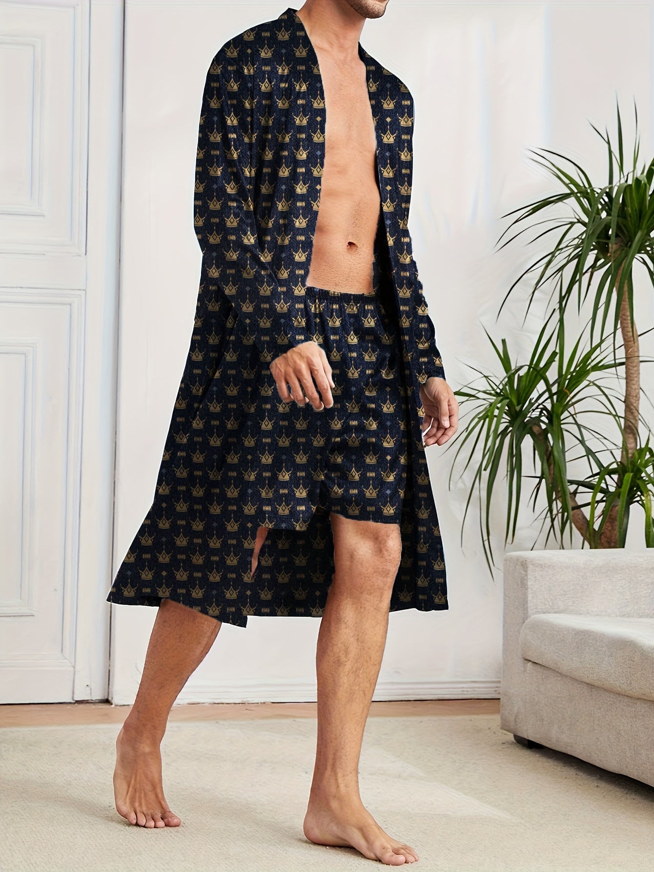 Мужской домашний комплект: длинный рукав, халат и шорты, узор корон, полиэстер, повседневный