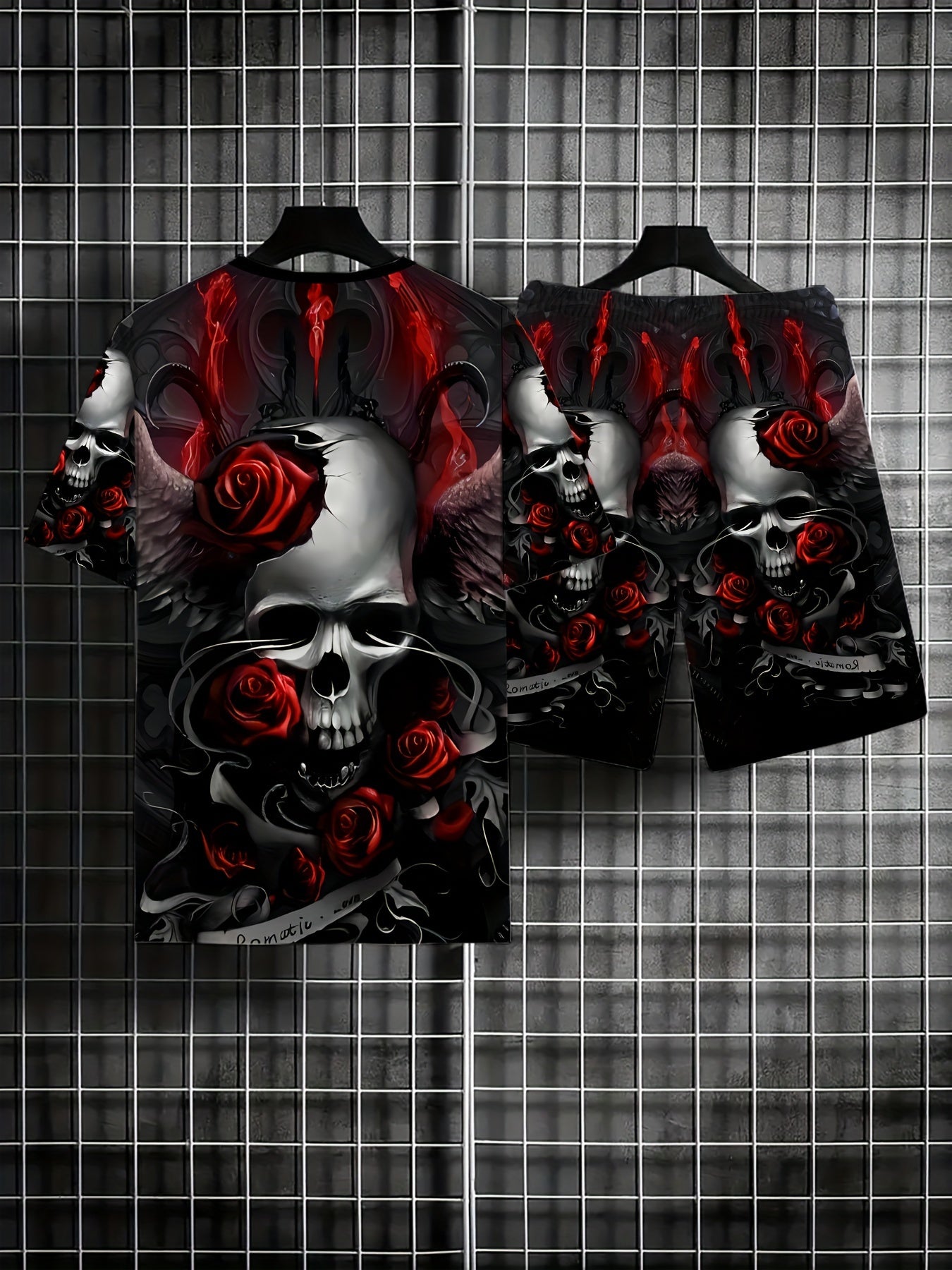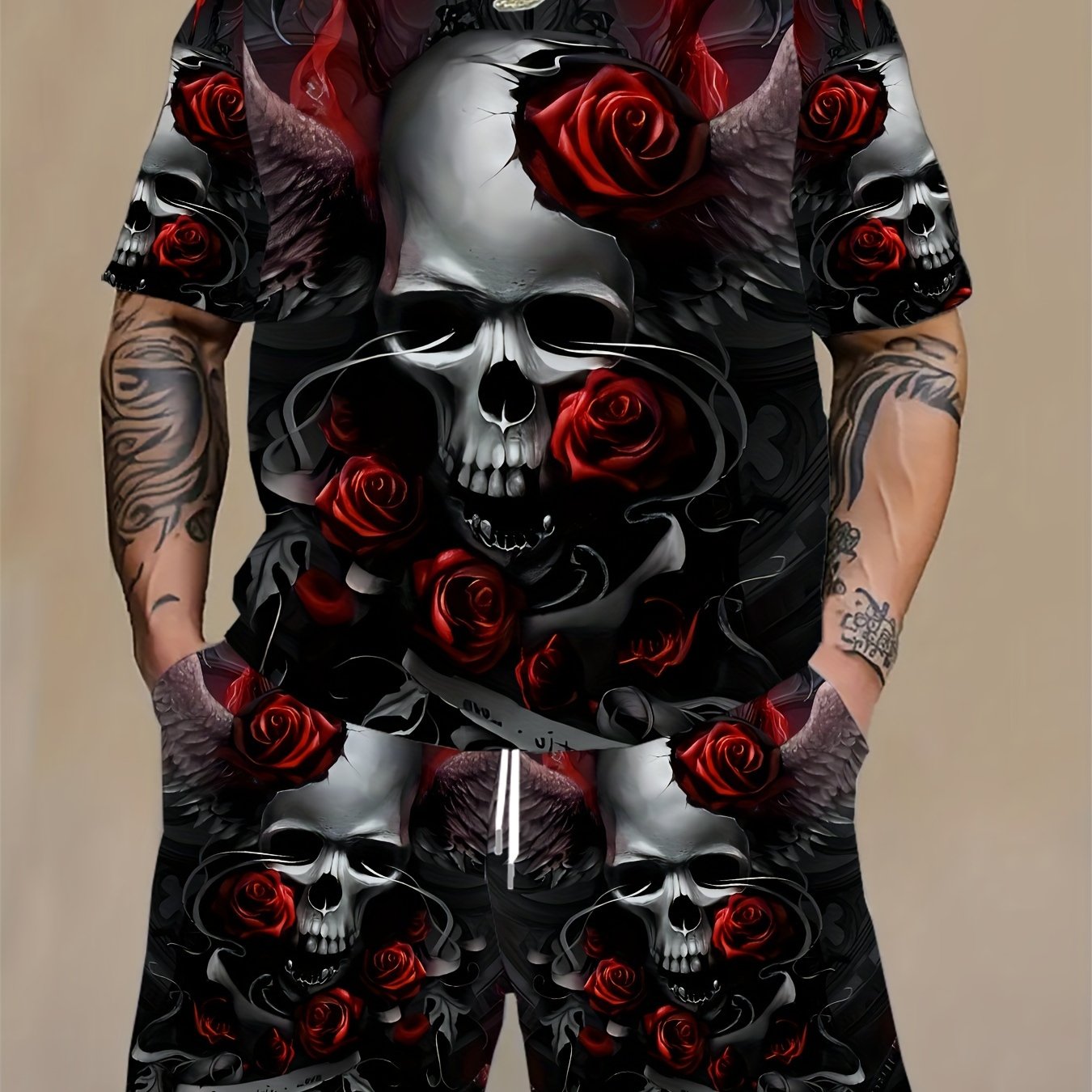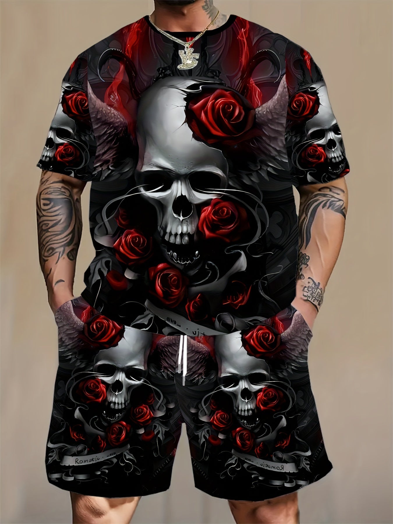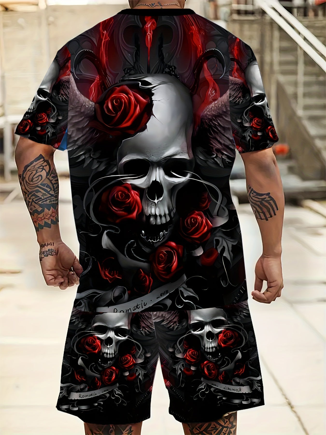 Мужской комплект из футболки с графикой черепа и роз и шортов большого размера для летних спортивных занятий