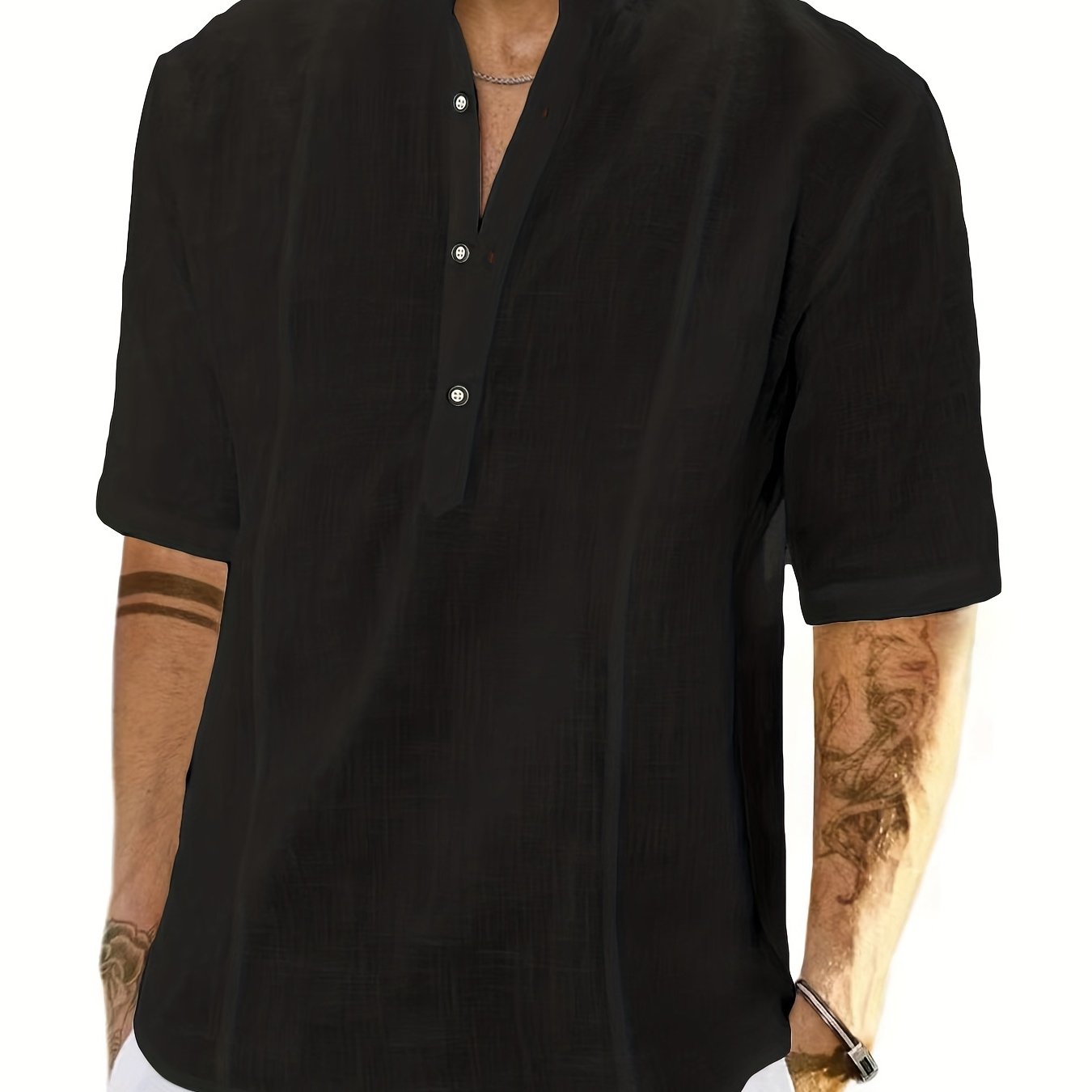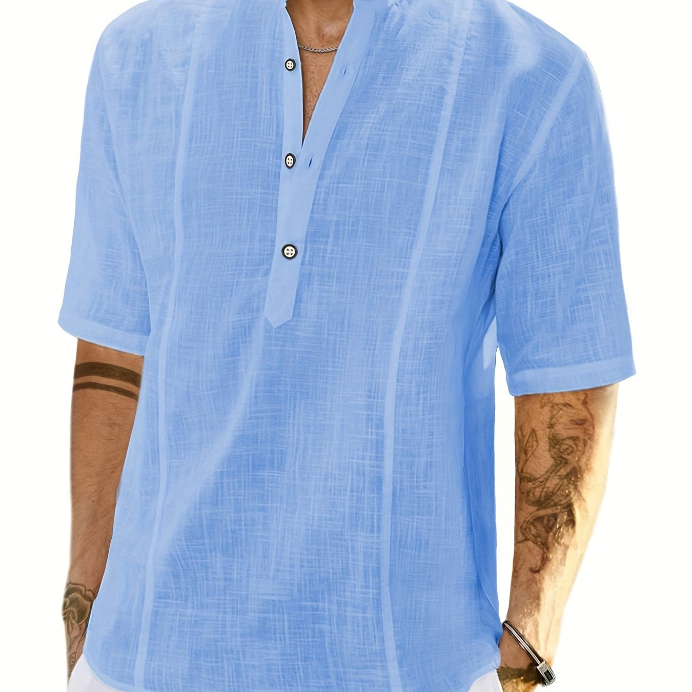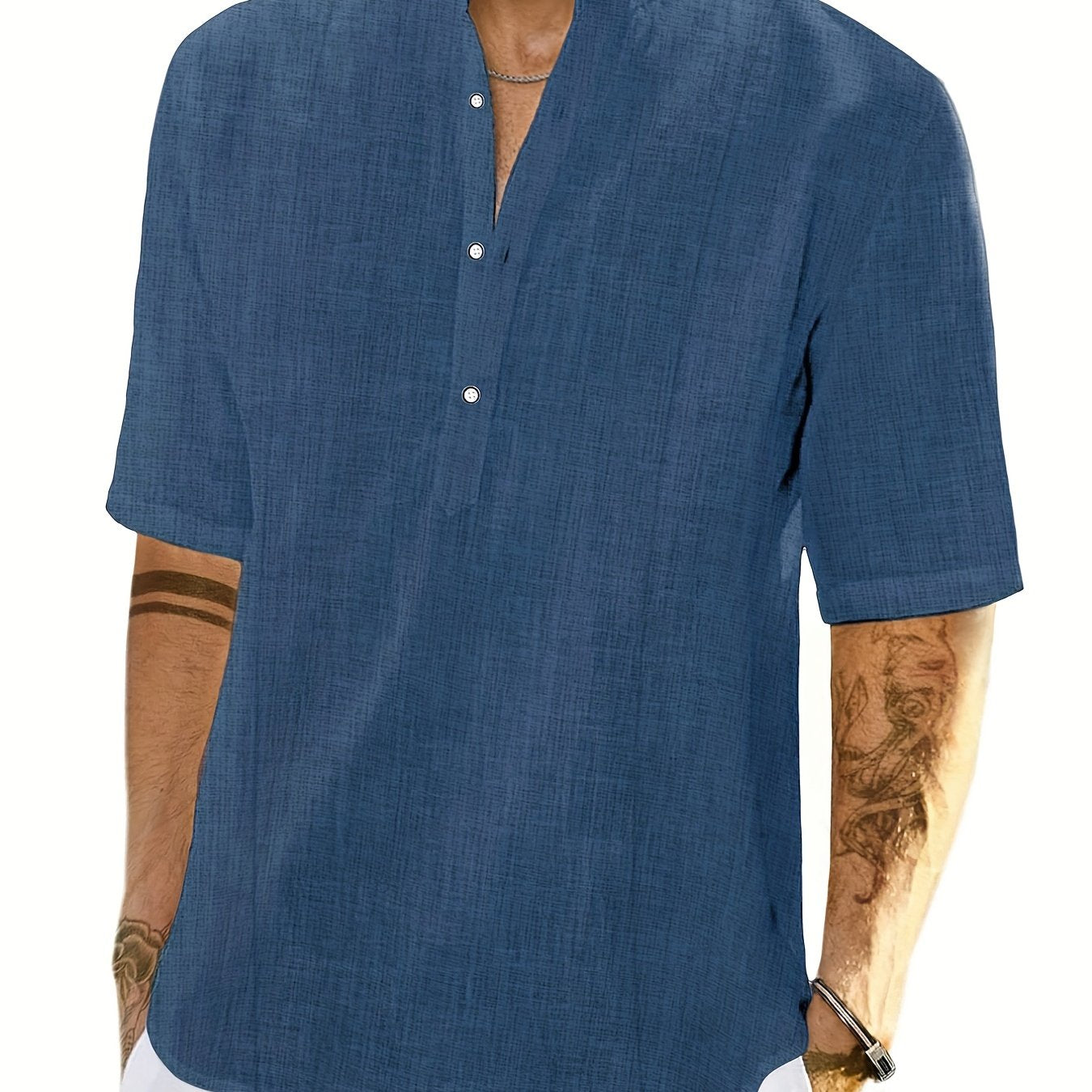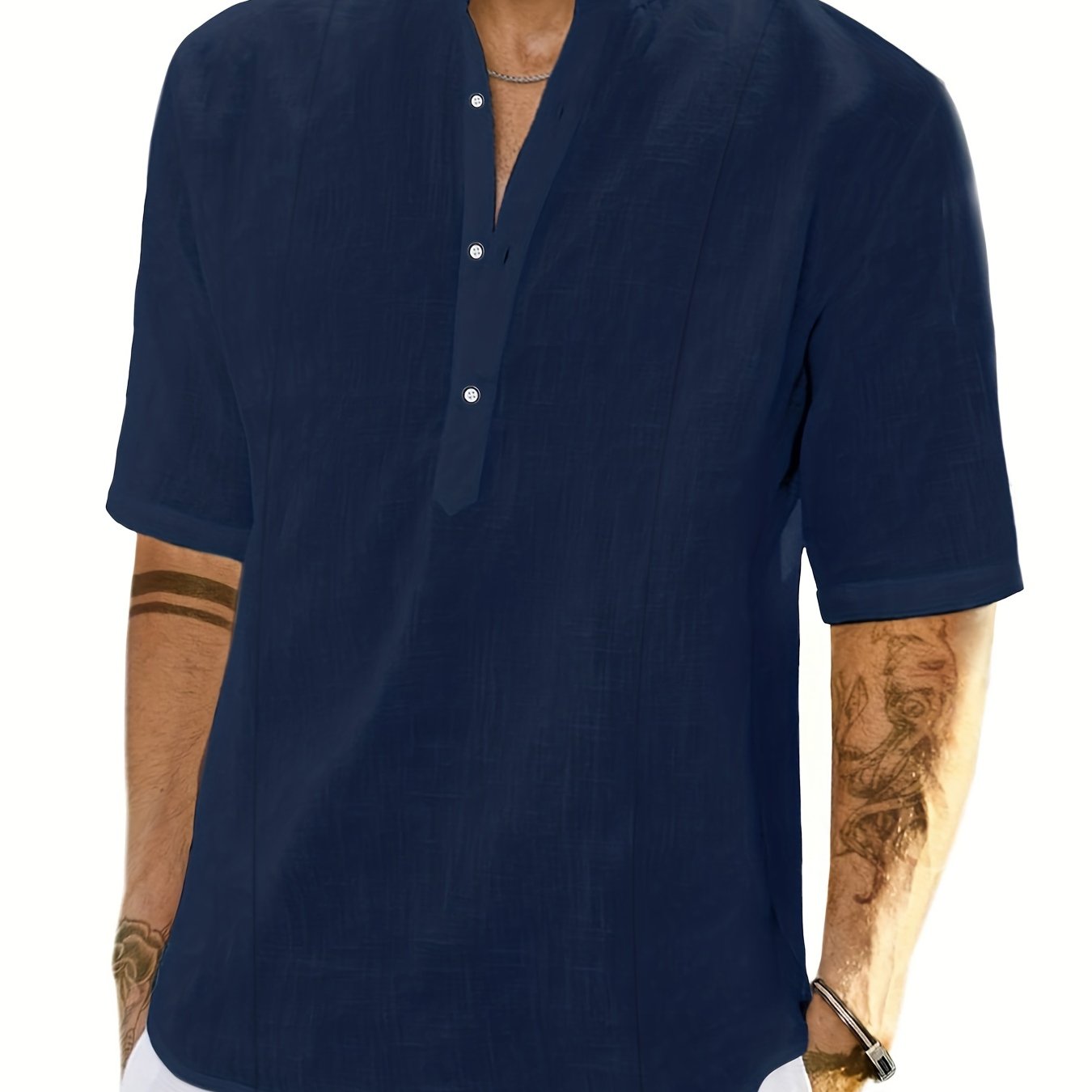 Мужская льняная хлопковая рубашка Henley темно-синего цвета для лета, повседневная, свободного кроя, увеличенного размера