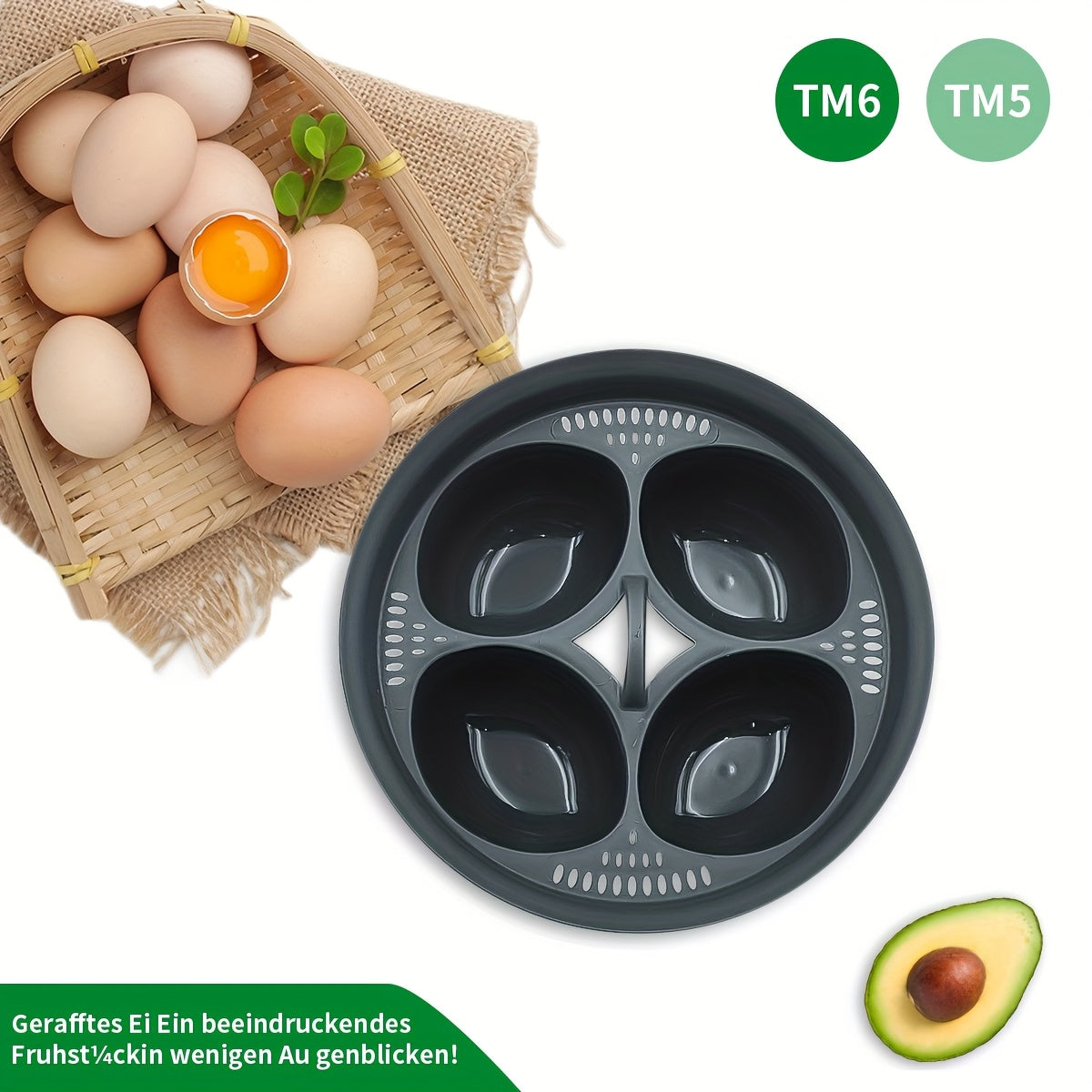 Новый 4-в-1 пароварка для яиц для моделей TM5 и TM6 - изготовлена из пищевого PP, без PFOA и безопасна для посудомоечной машины - идеально подходит для завтраков, закусок и десертов - оснащена многоуровневым дизайном в элегантном черном цвете