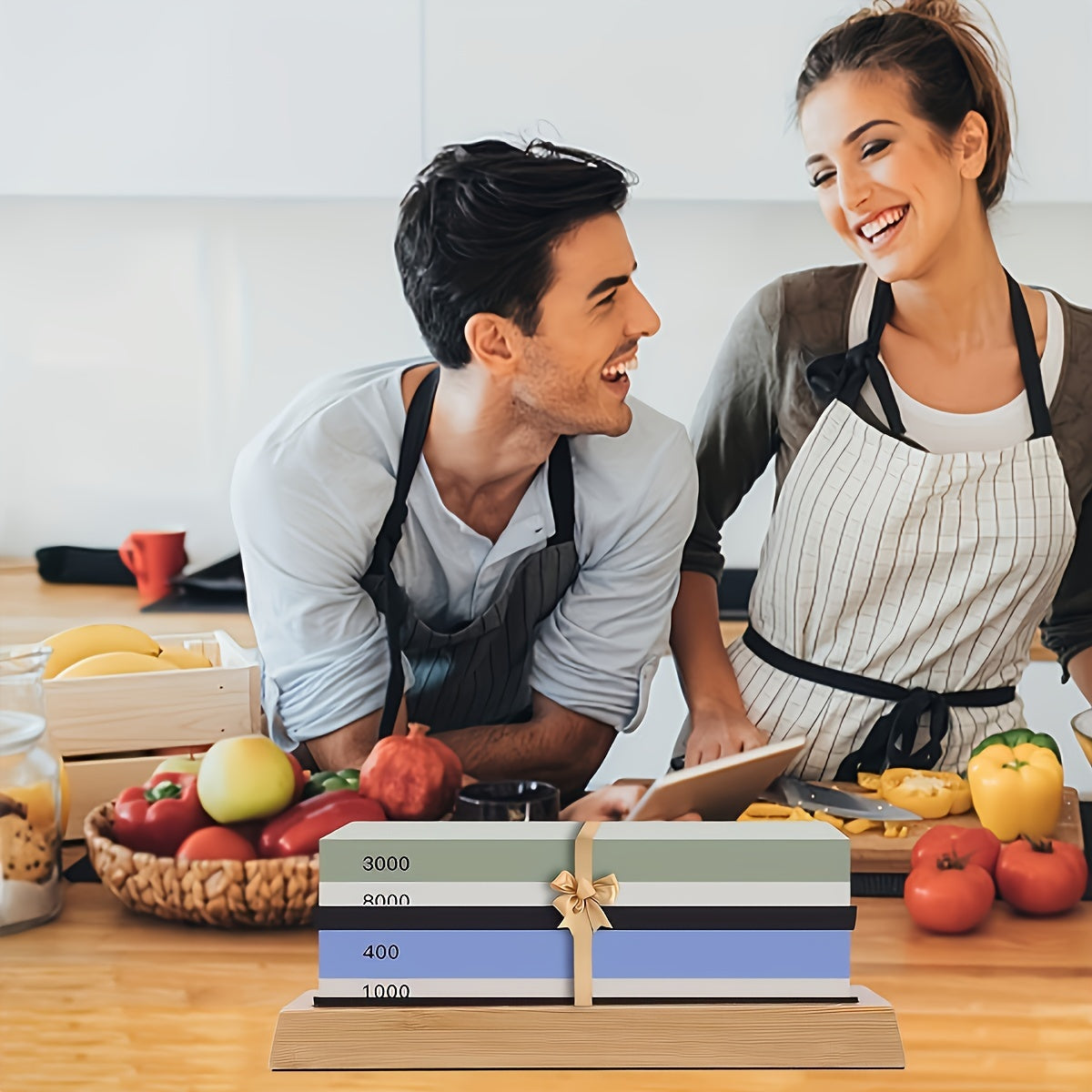 Набор точил NewShark с 4 сторонами, точилка для ножей с зернистостью 400/1000, 3000/8000. Включает в себя нескользящую основу, направляющую угла, полировочный кожаный ремень и выравнивающий камень. Универсальный каменный материал.