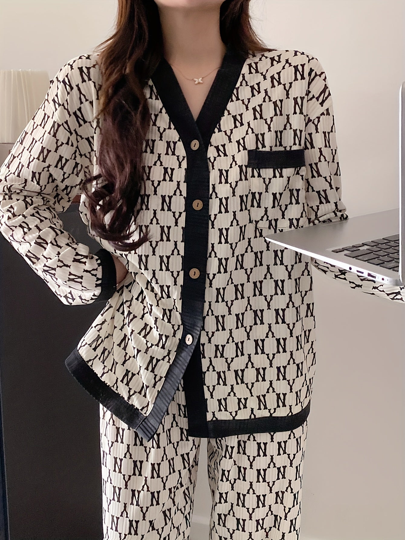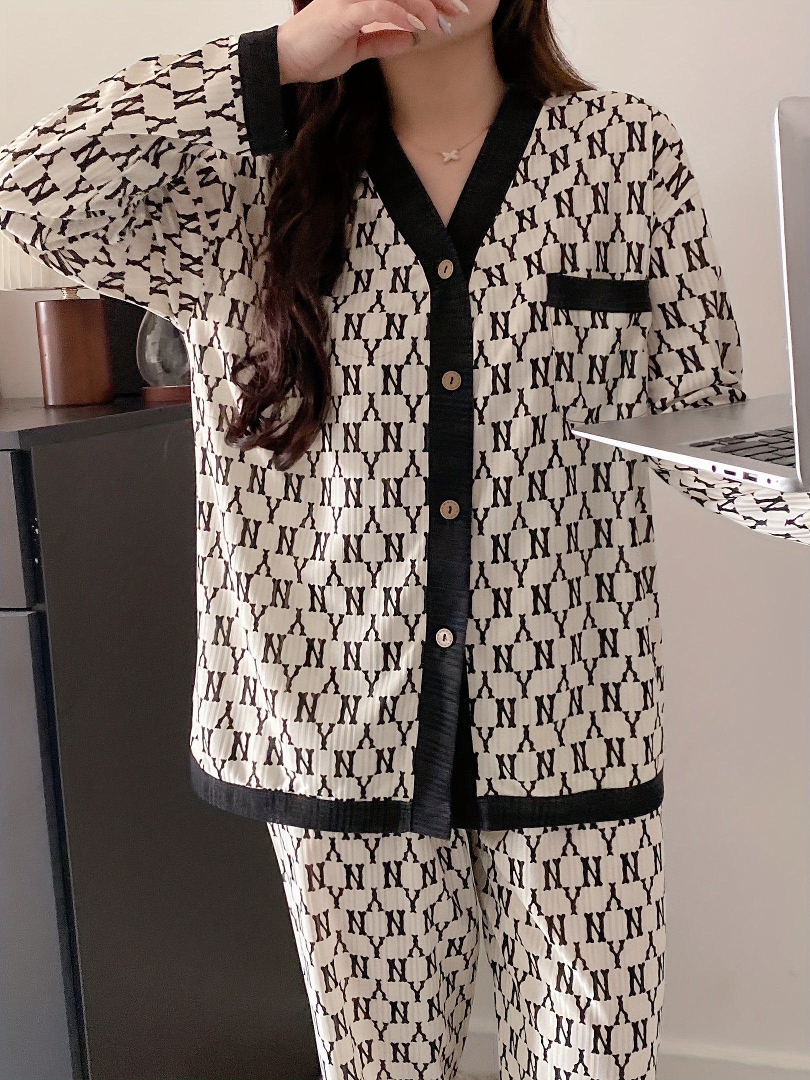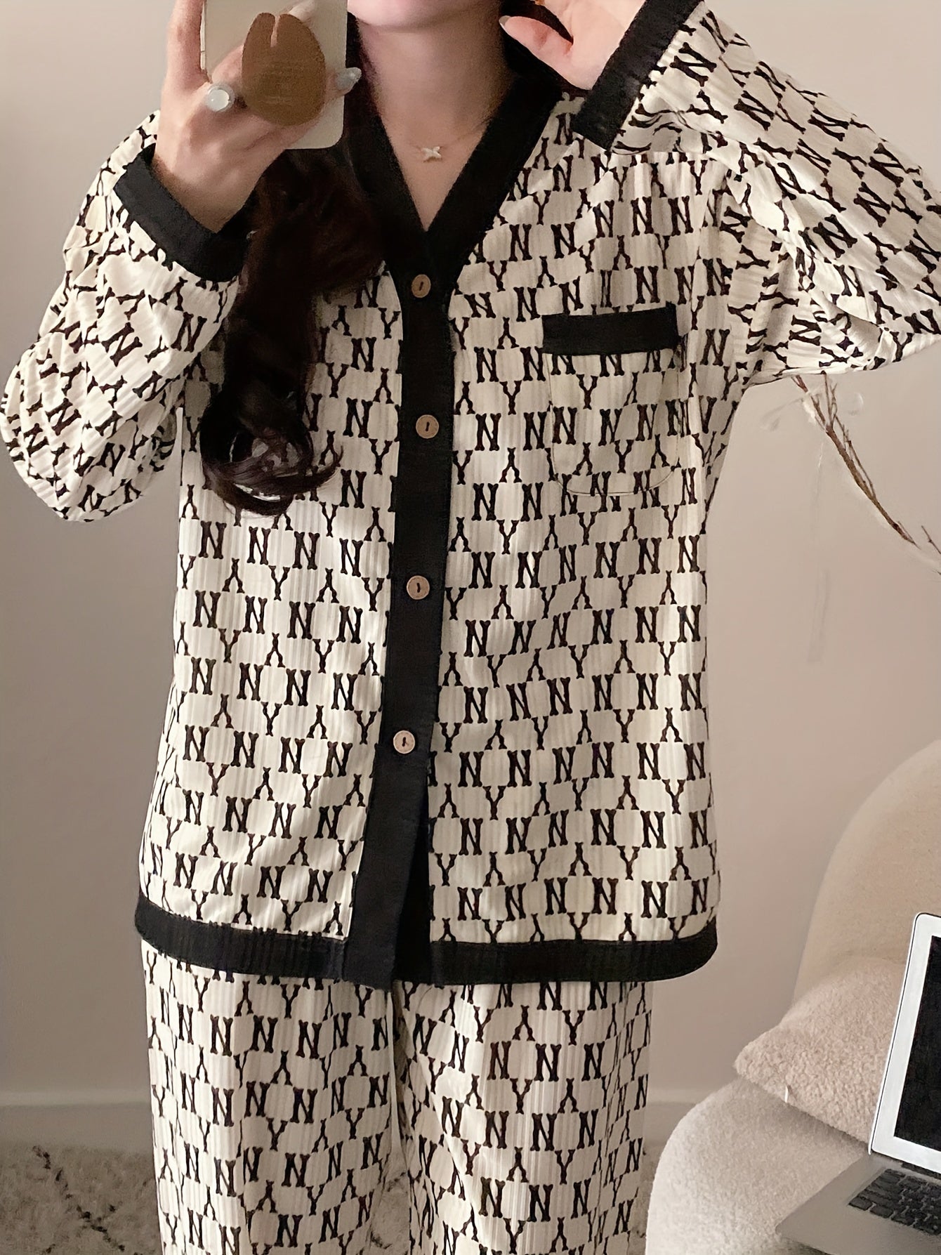 Розовый и синий корейский стиль пижамный комплект для женщин с открытой передней частью, весна, осень, длинный рукав