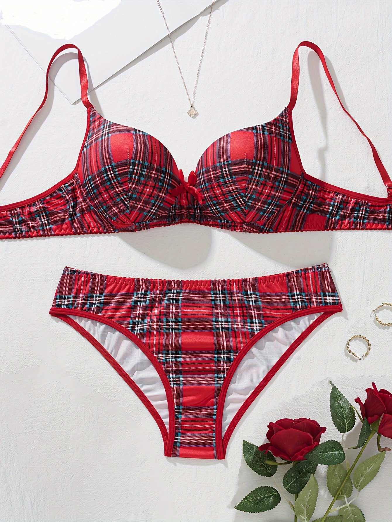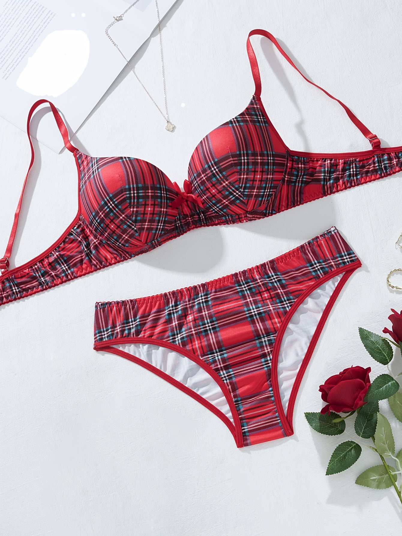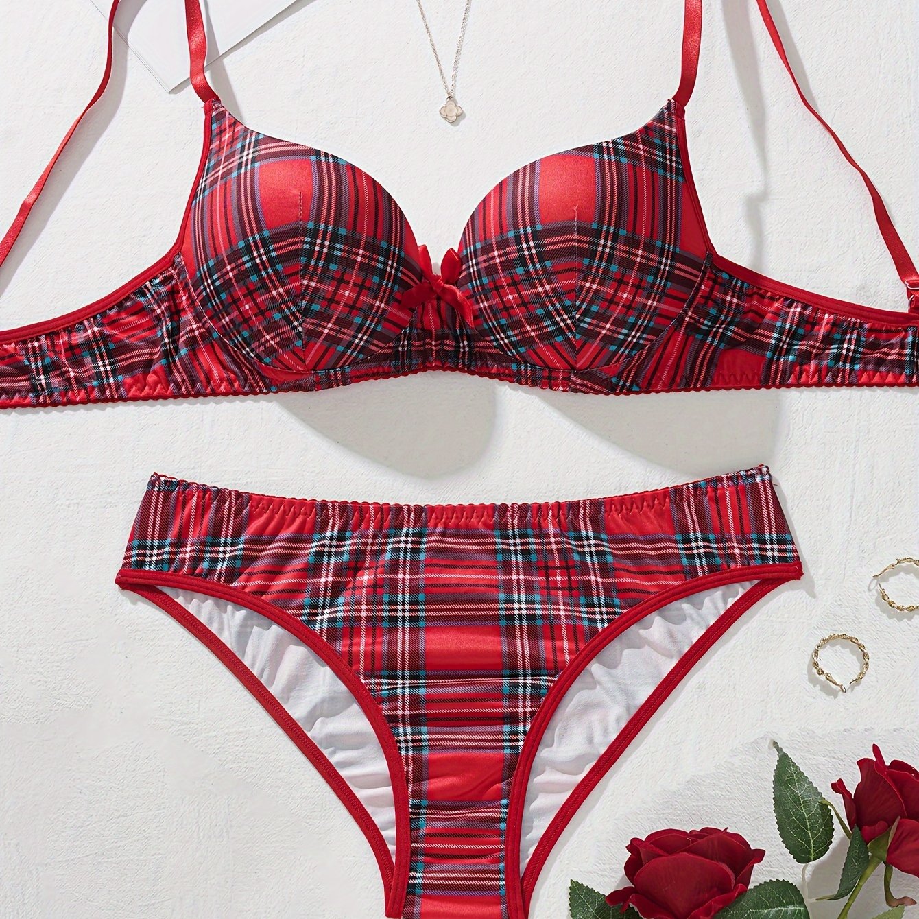 Комплект женского белья в клетку, изготовленный из 95% полиэстера и 5% эластана. Включает бюстгальтер средней поддержки и трусики средней посадки в дизайне с цветными блоками. В комплект не входит прокладка для груди. Часть взрослого белья.