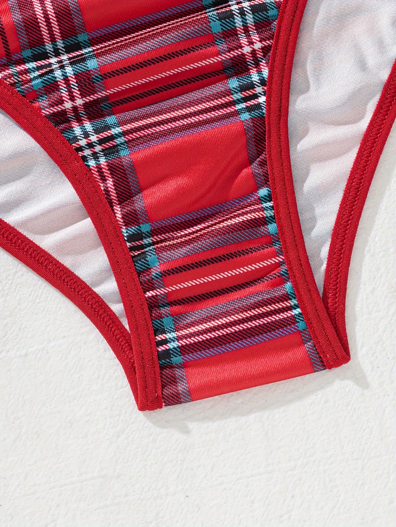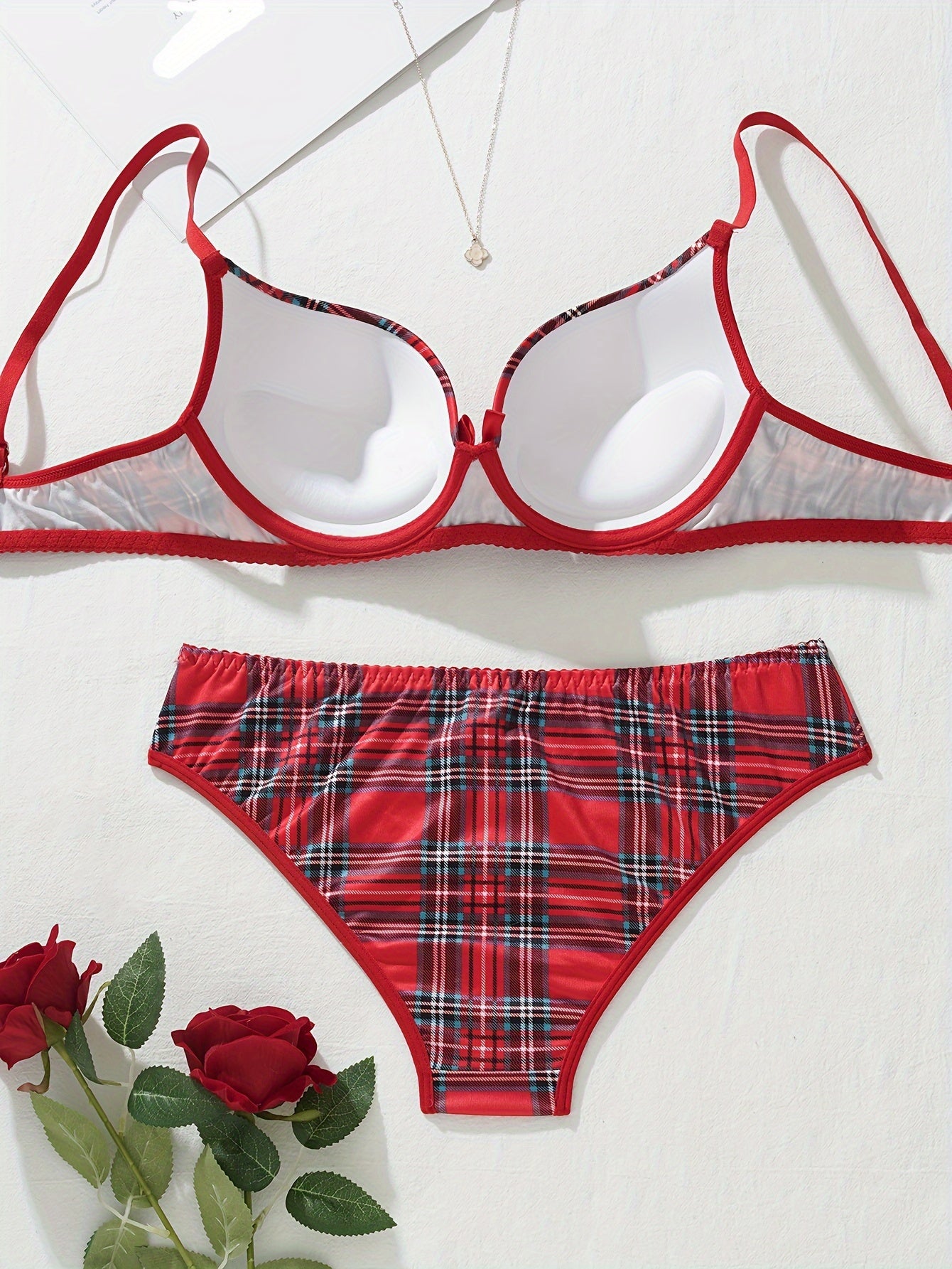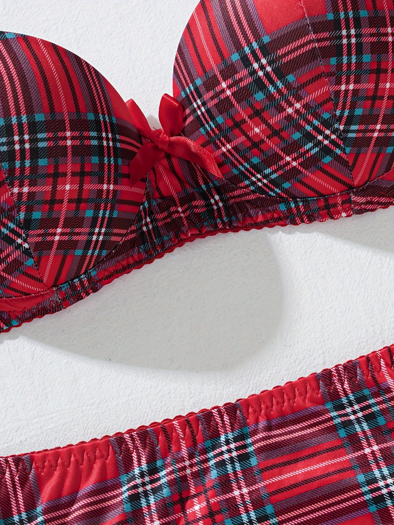 Комплект женского белья в клетку, изготовленный из 95% полиэстера и 5% эластана. Включает бюстгальтер средней поддержки и трусики средней посадки в дизайне с цветными блоками. В комплект не входит прокладка для груди. Часть взрослого белья.