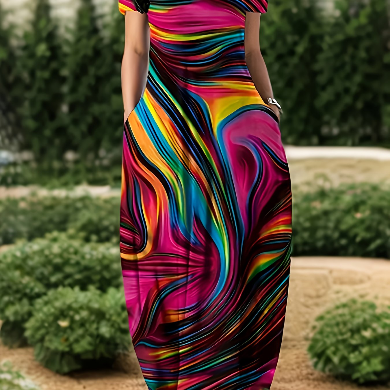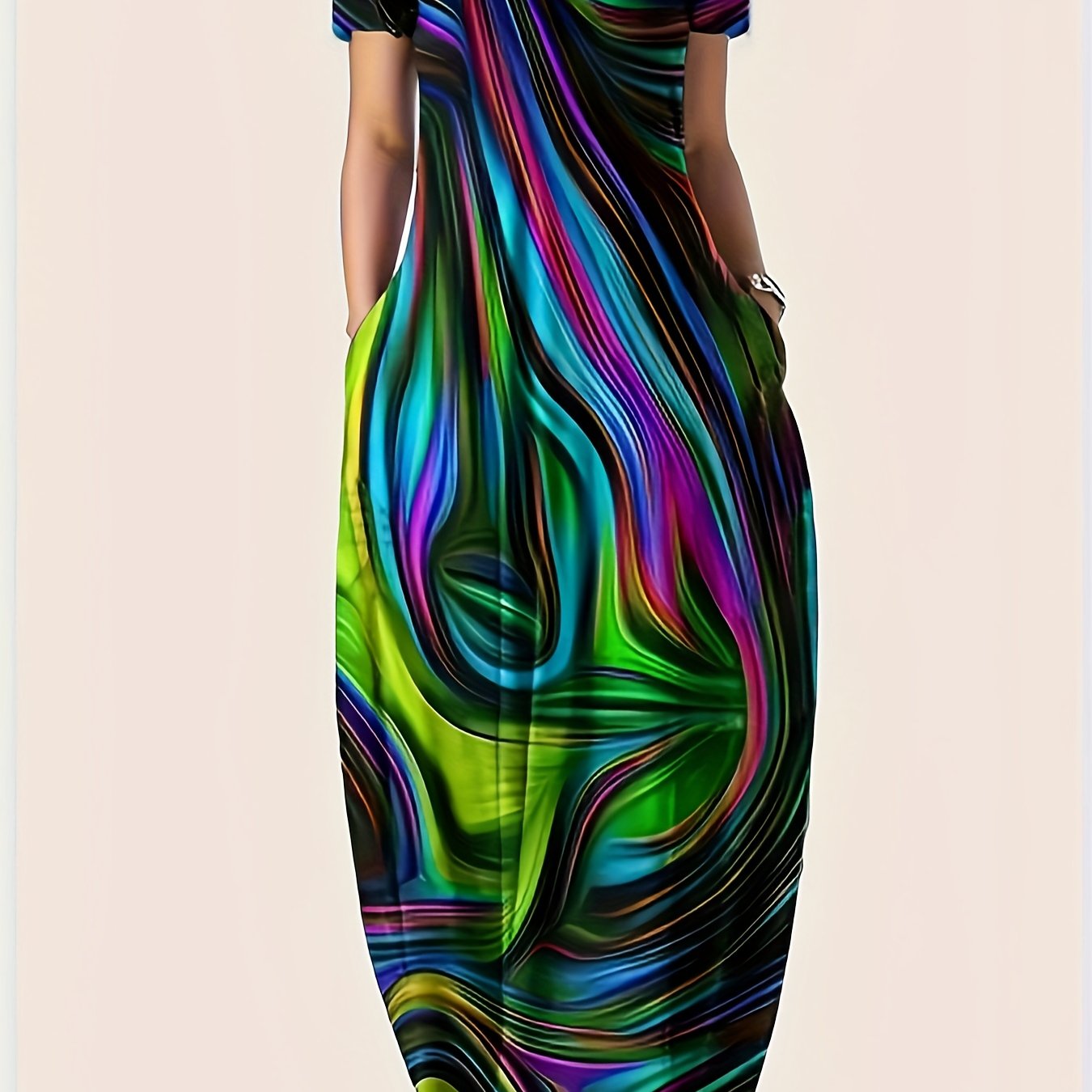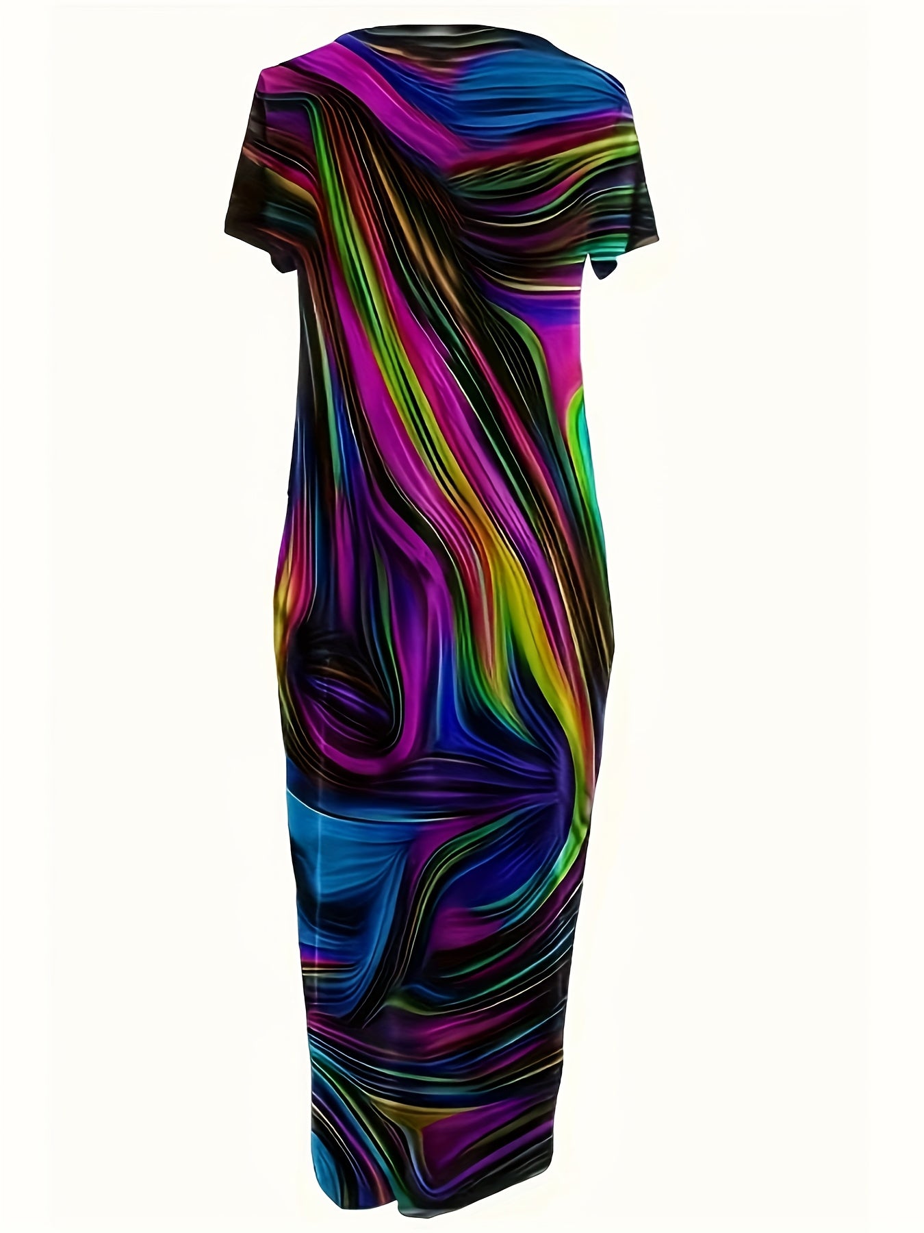 Платье-макси с принтом для полных размеров на весну-лето, повседневное, короткий рукав, круглый вырез