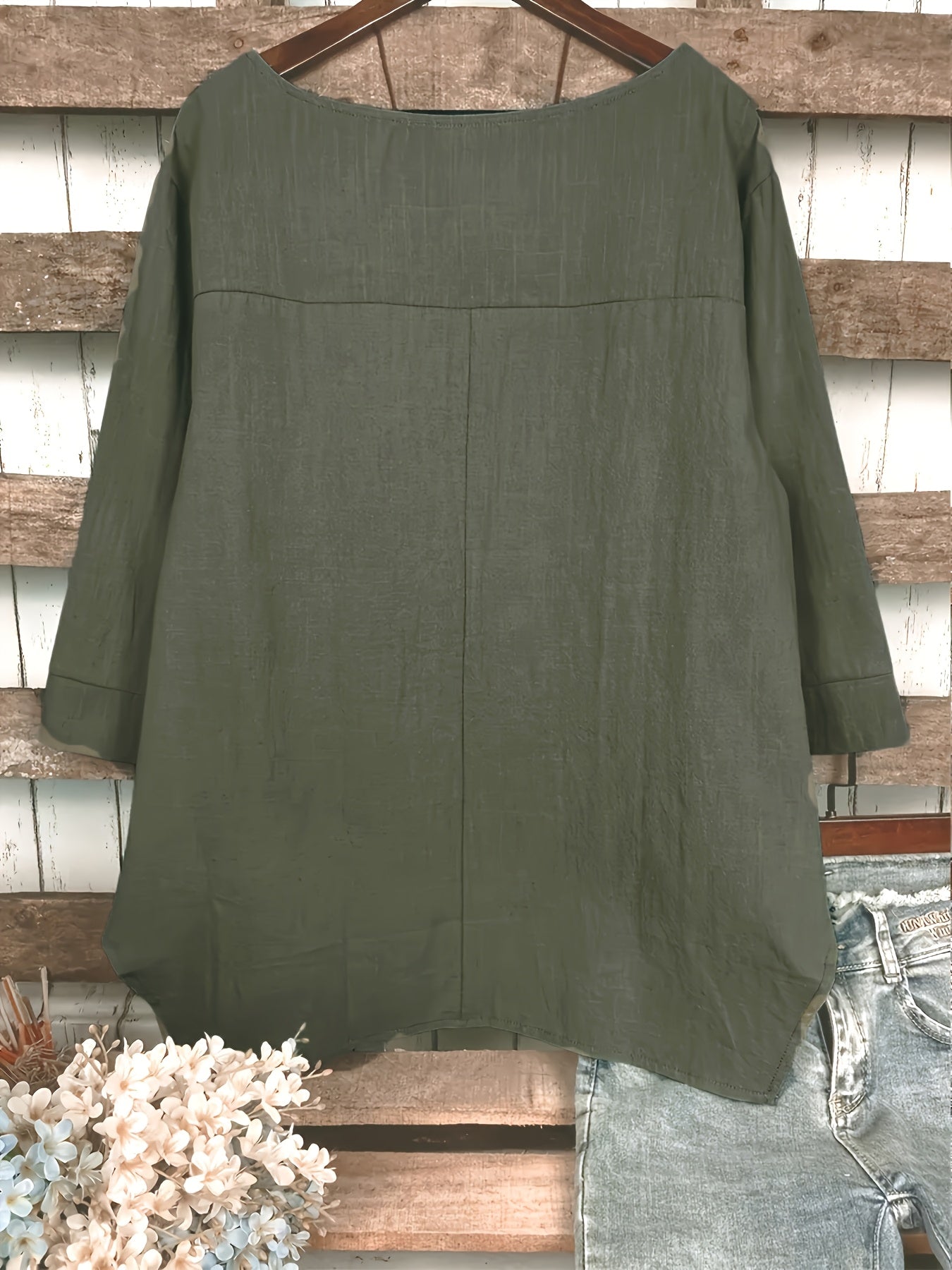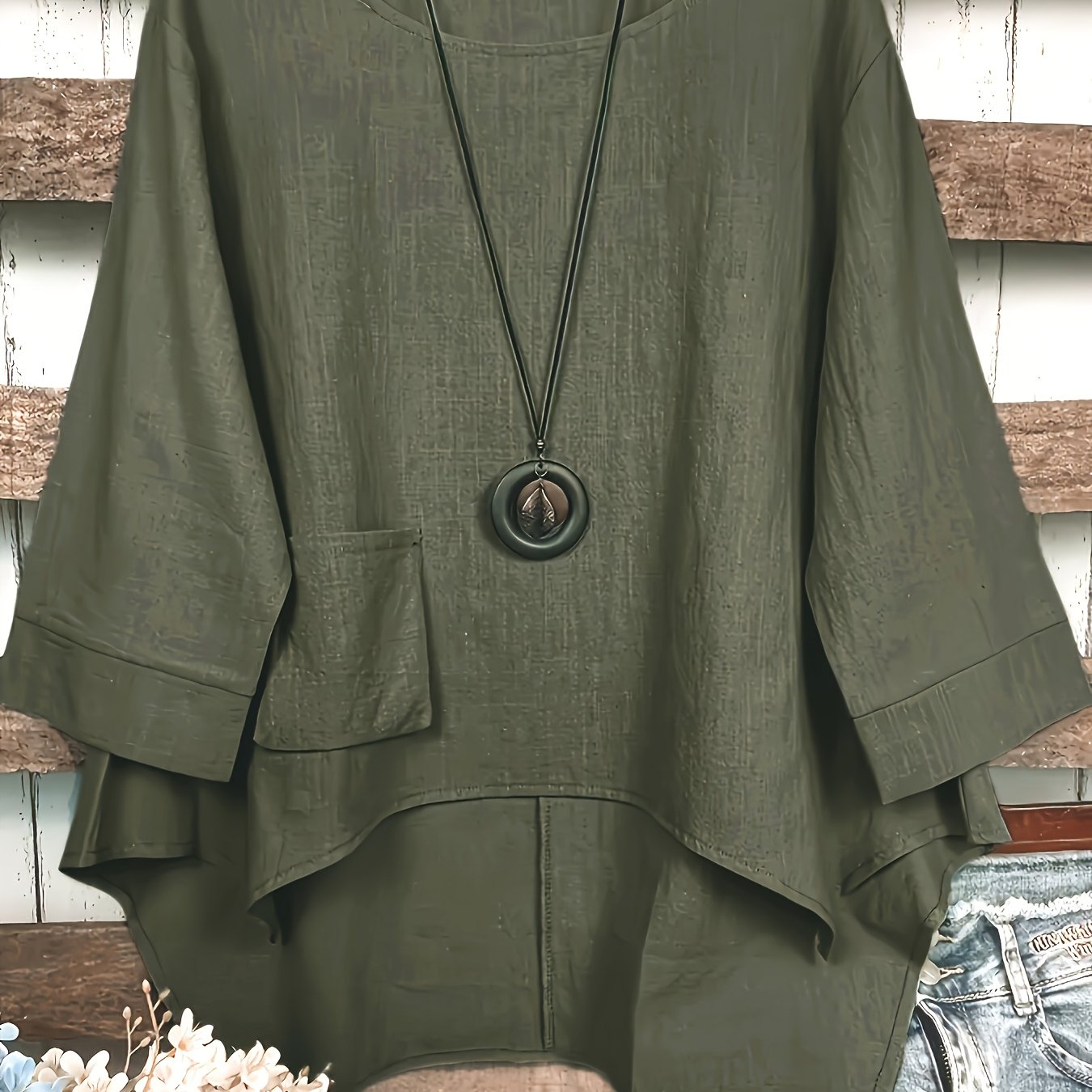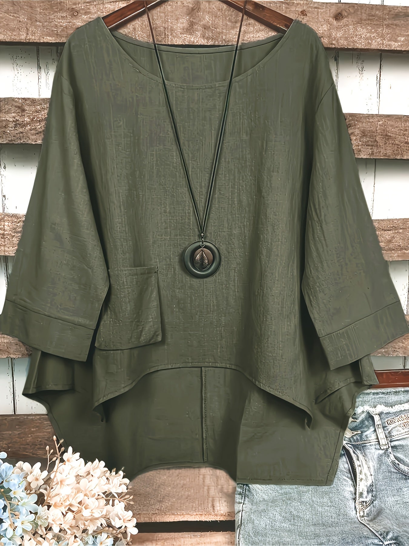Блузка с асимметричным подолом из хлопкового микса, с круглым вырезом и карманом, для всех сезонов
