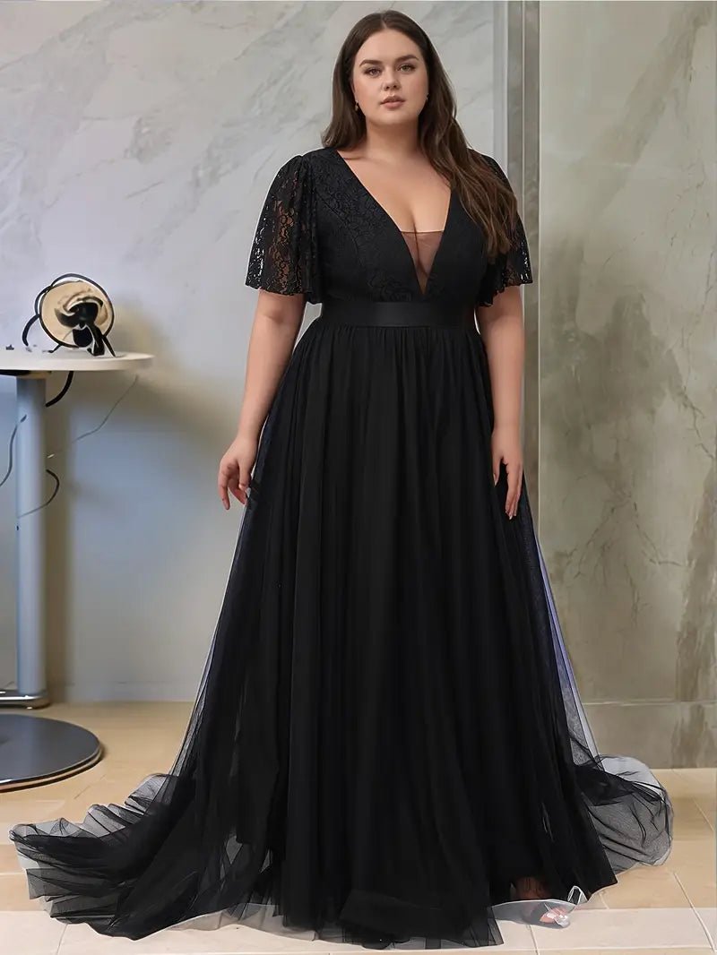 Plus Size Black V-Neck Maxi Dress with Short Sleeves and Lace for Formal Events