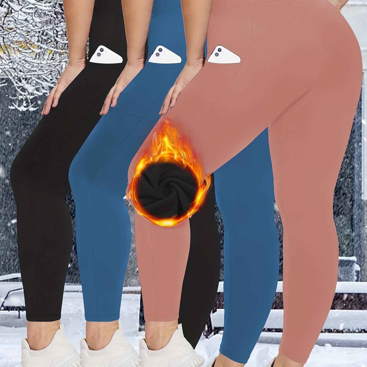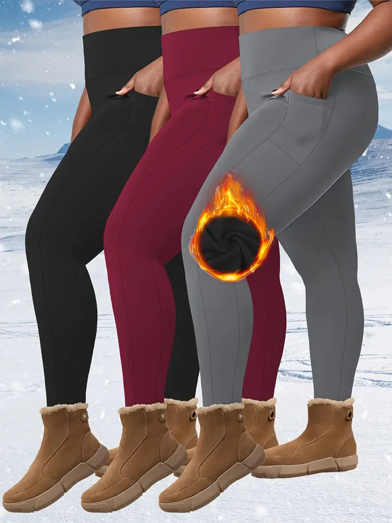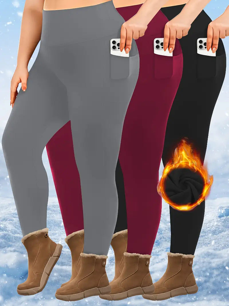 Plus Size Fleece-Lined Leggings High Waist Pockets Knit Solid Color