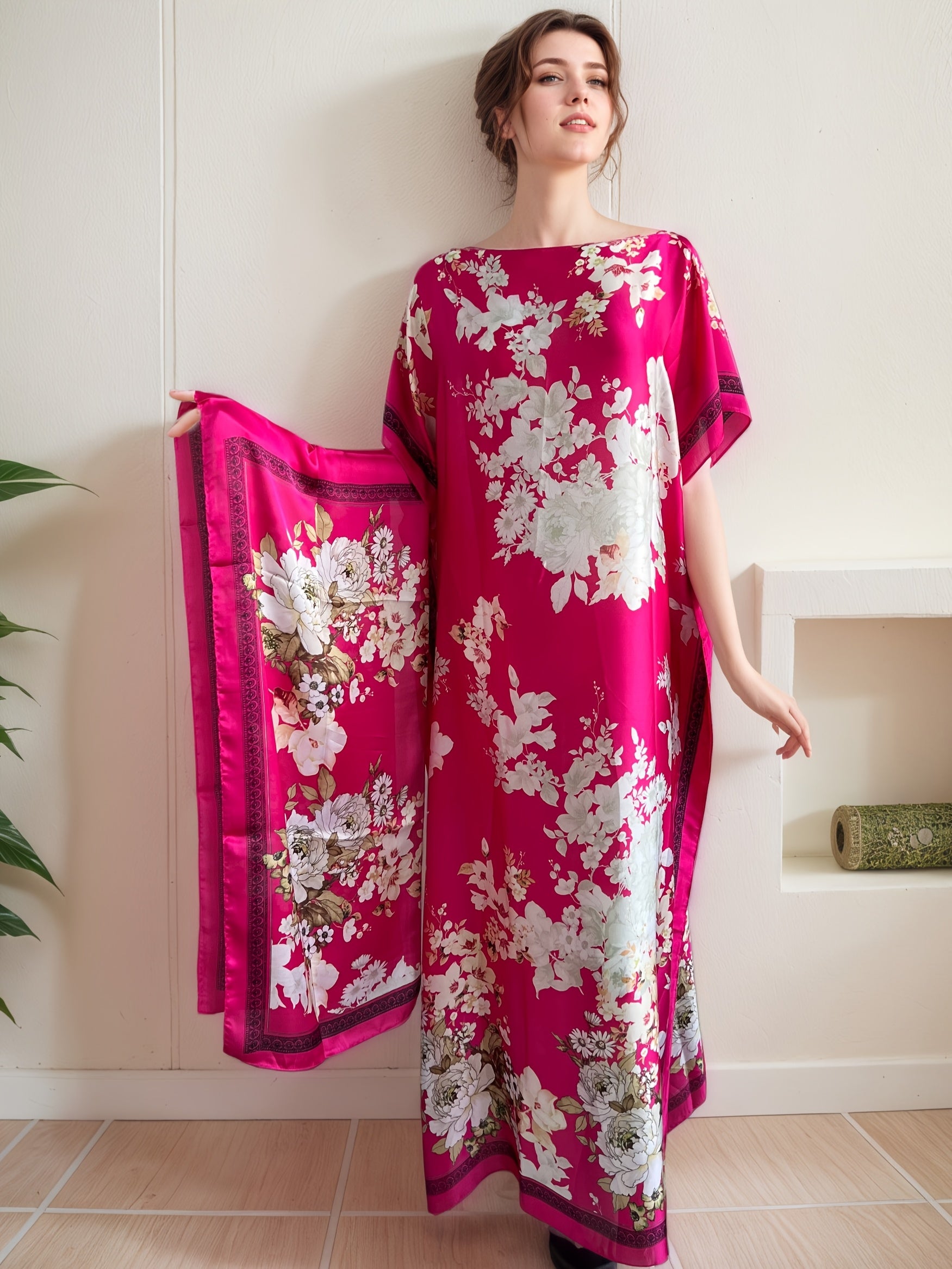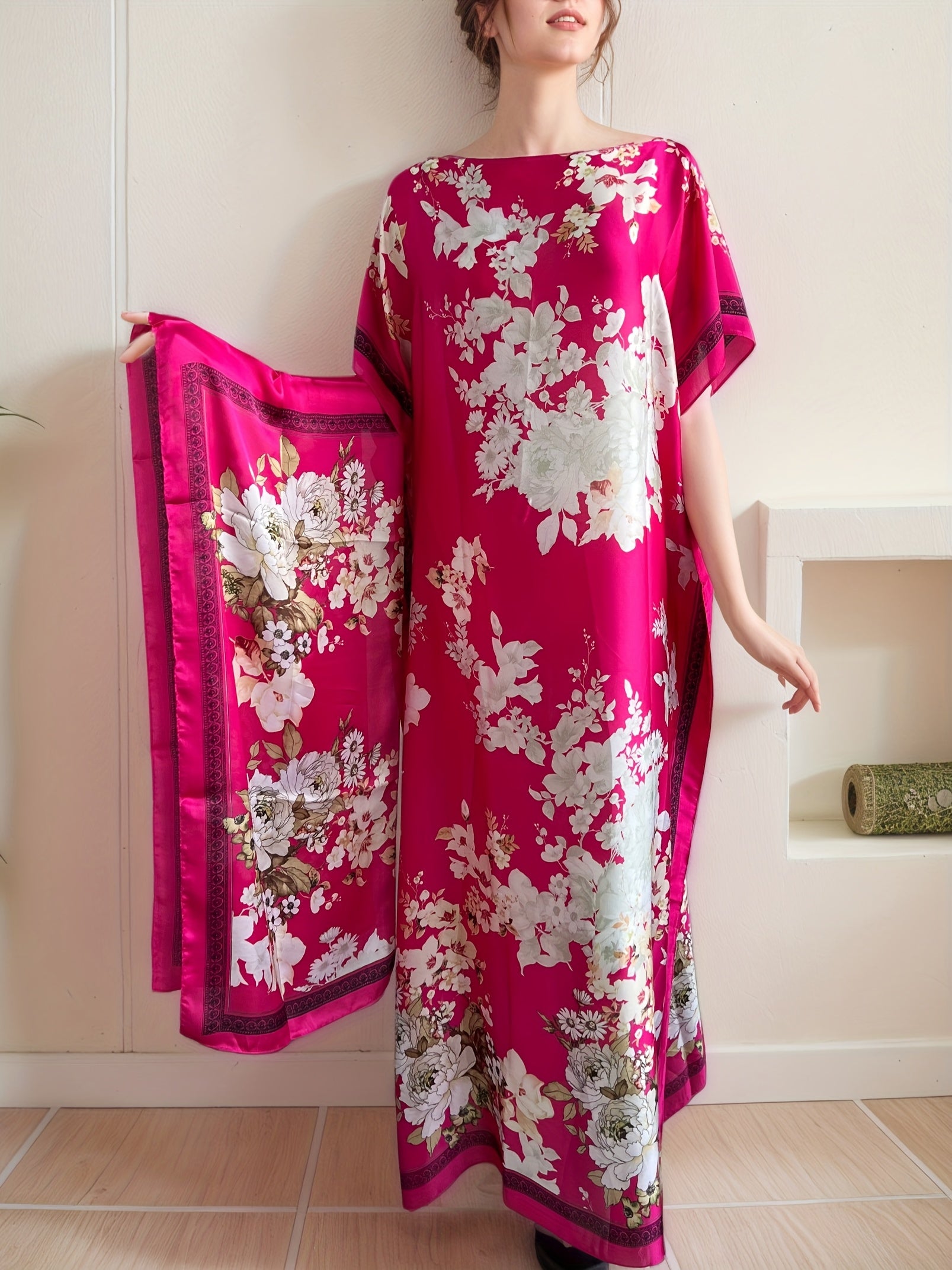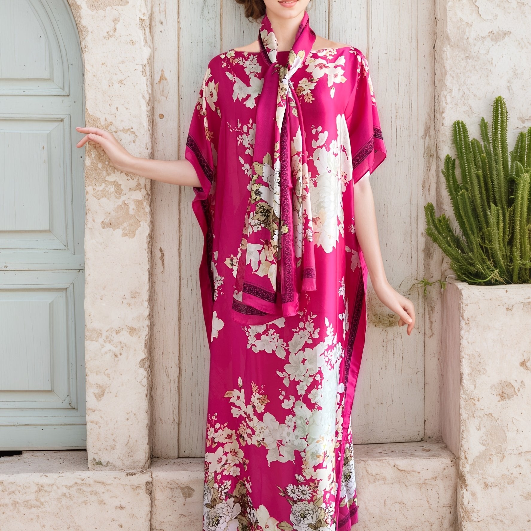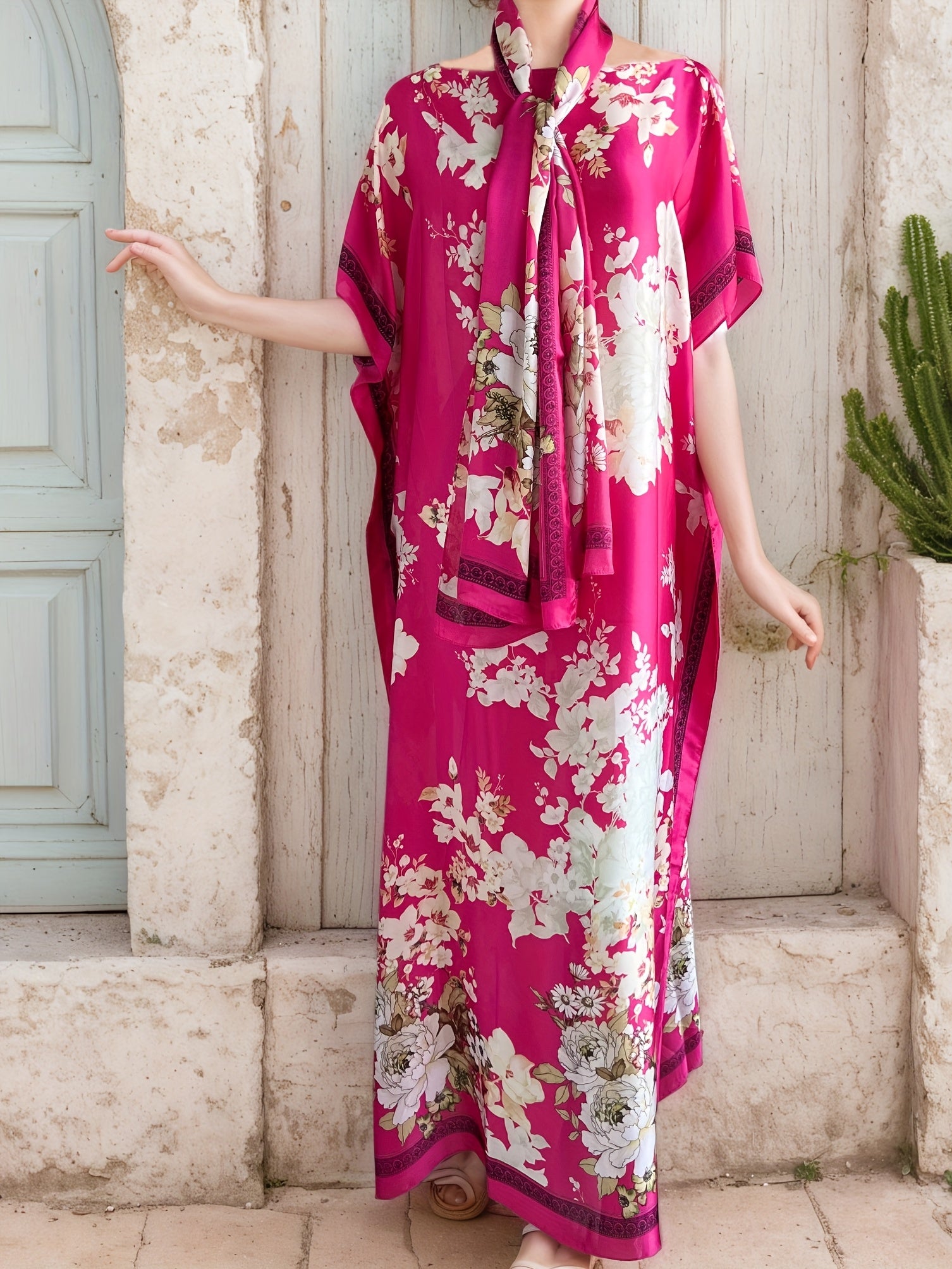 Платье макси большого размера с цветочным принтом и шарфом, свободный крой, длинные рукава, универсальный сезон