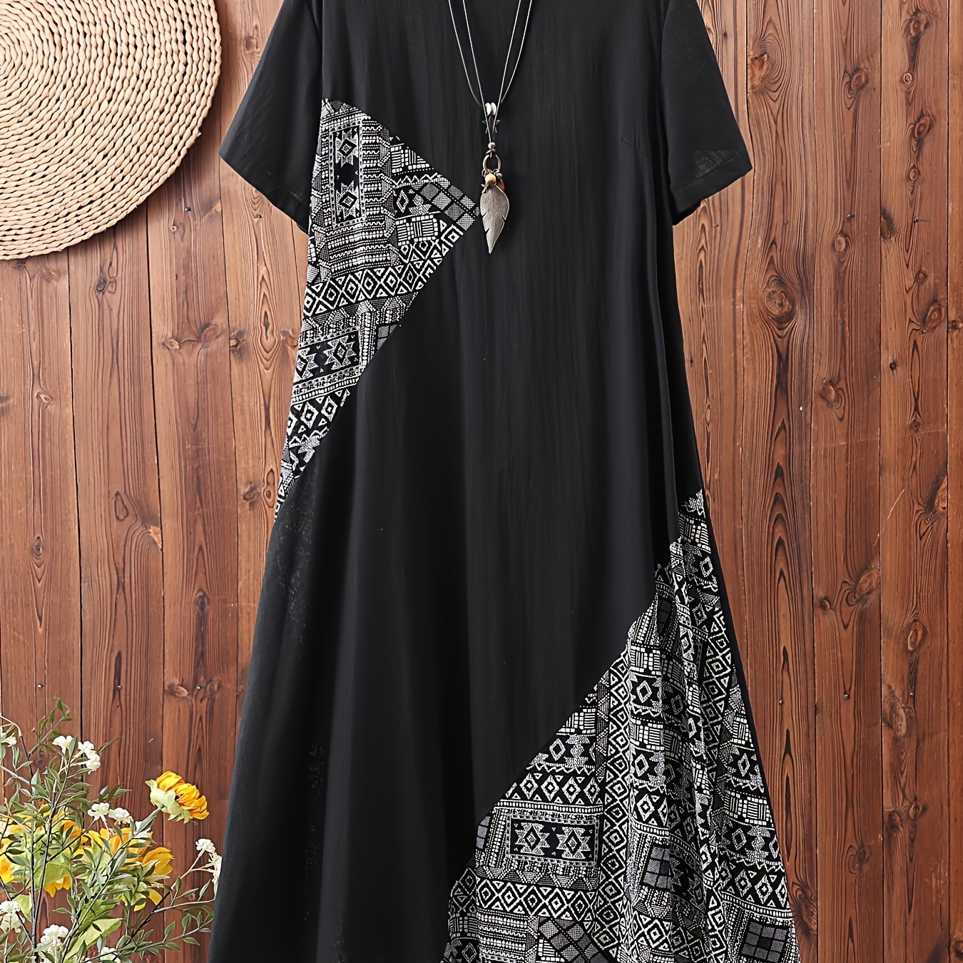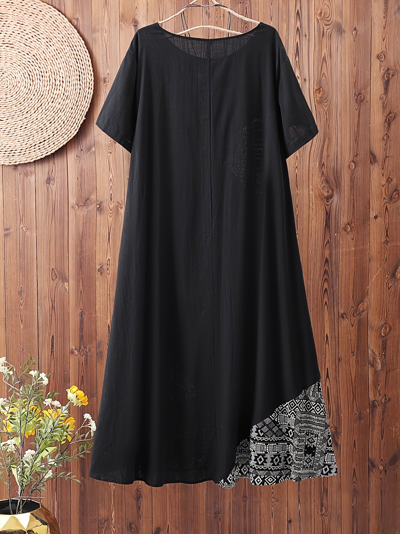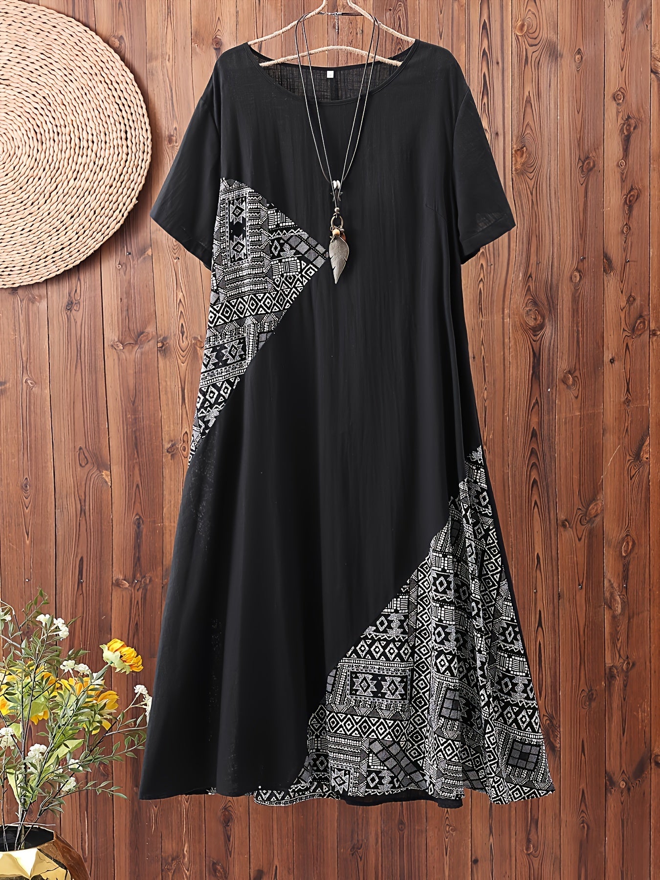 Платье из геометрического принта с заплатками из рами с короткими рукавами и круглым вырезом