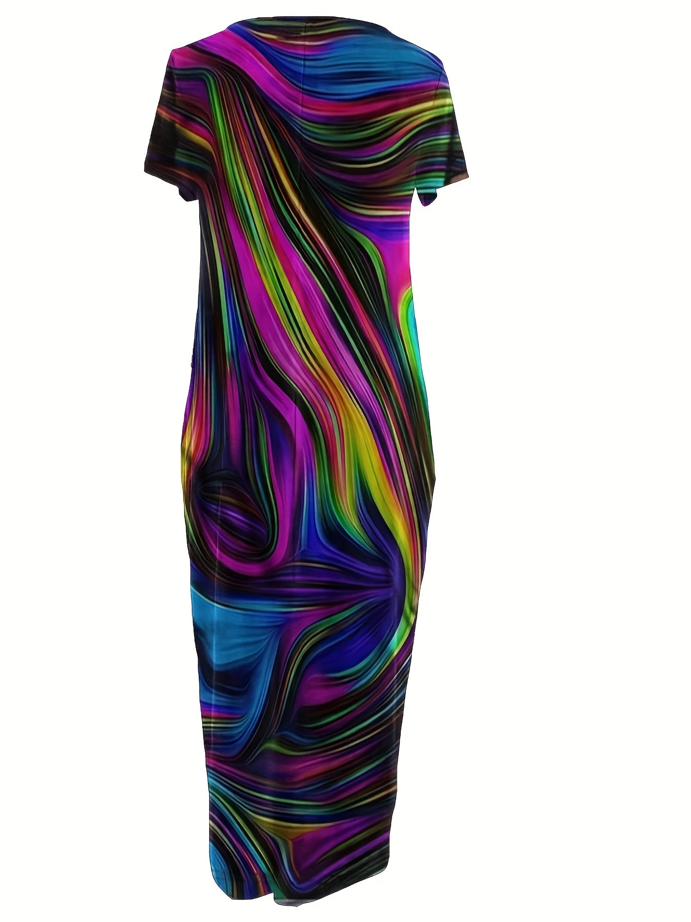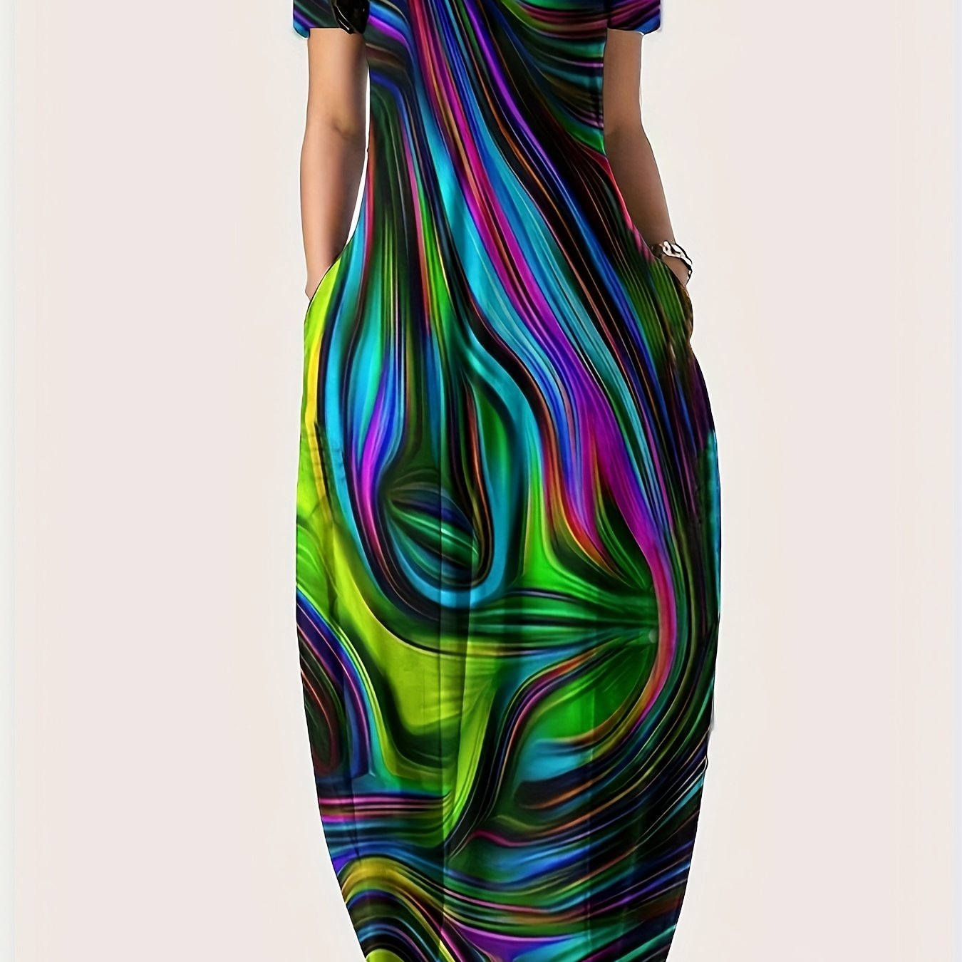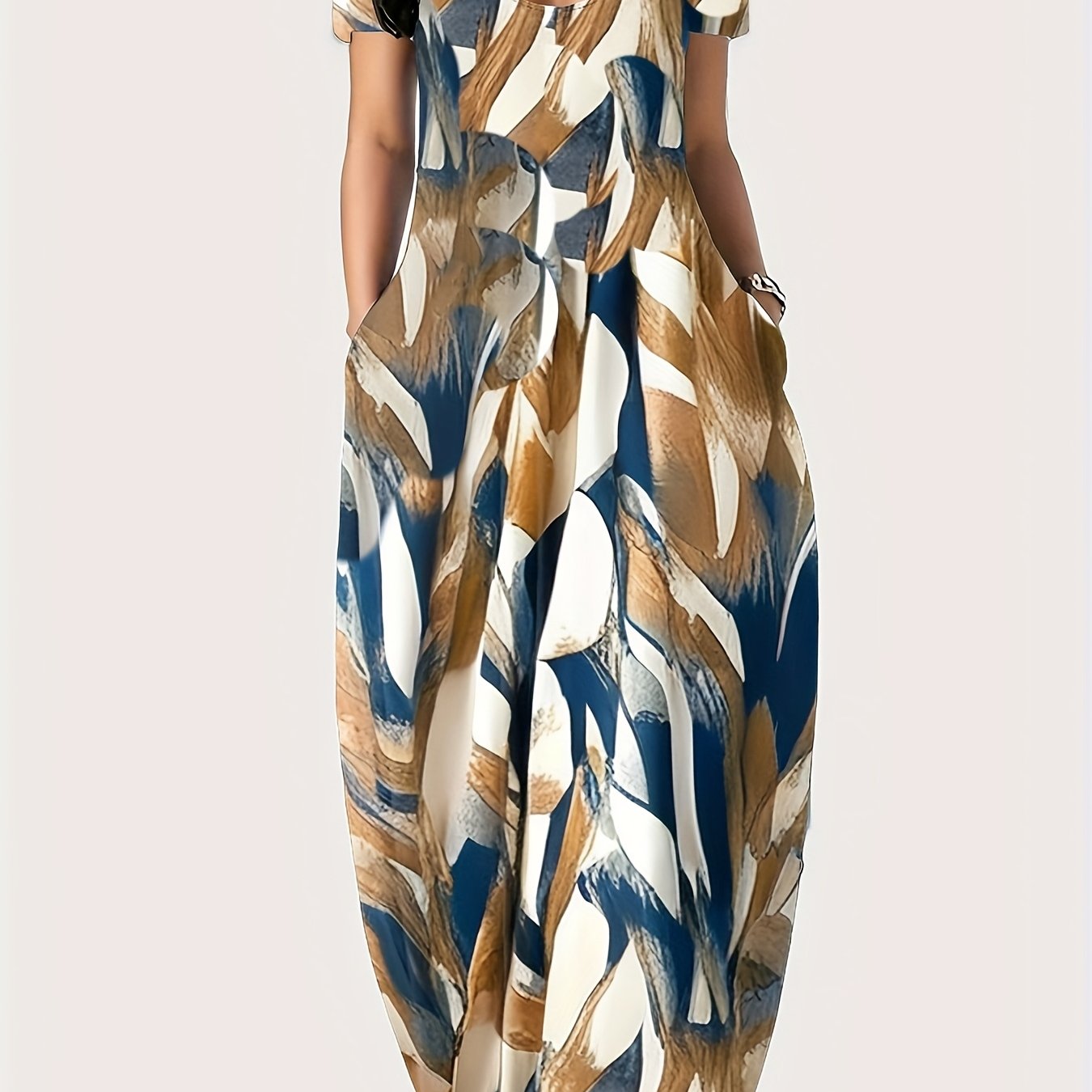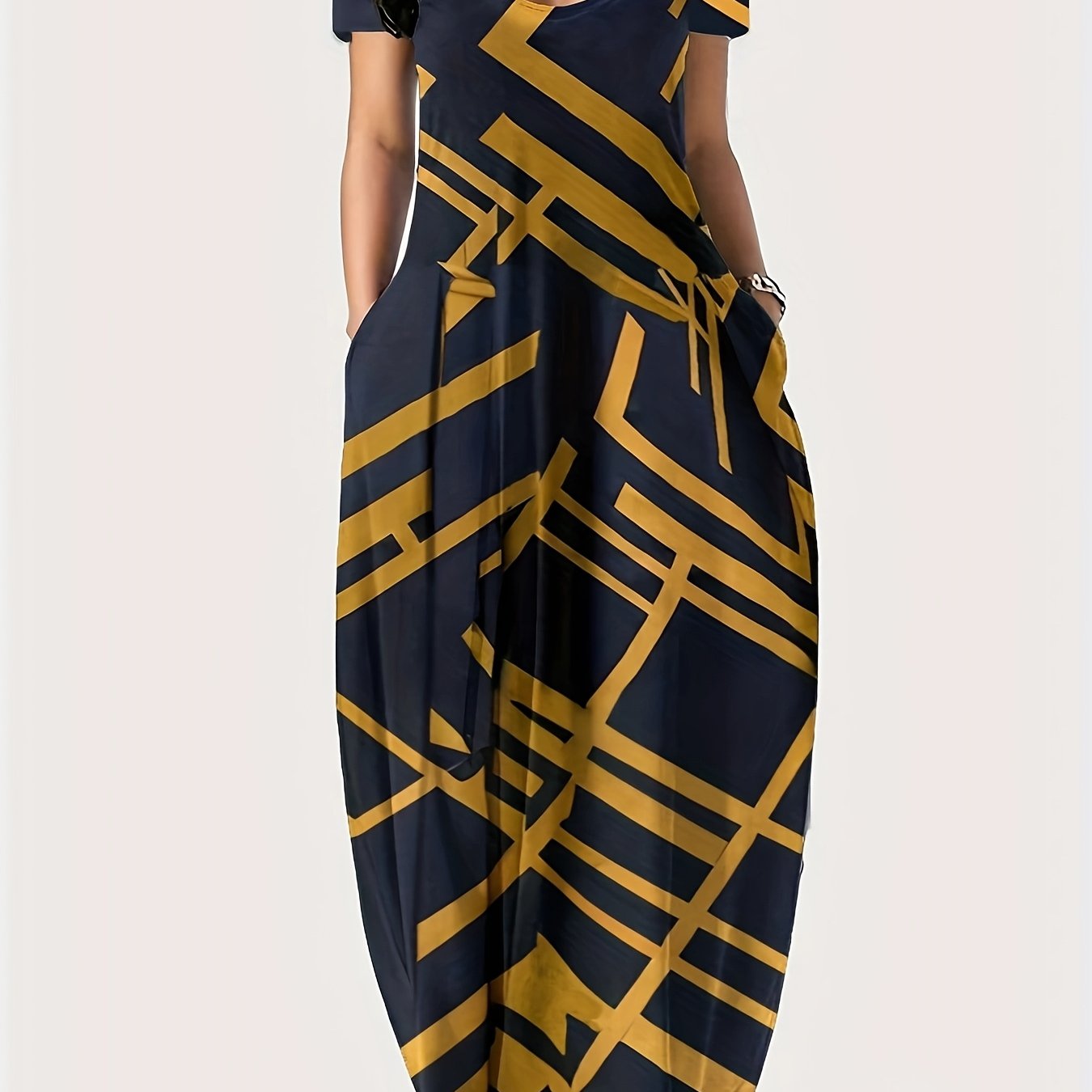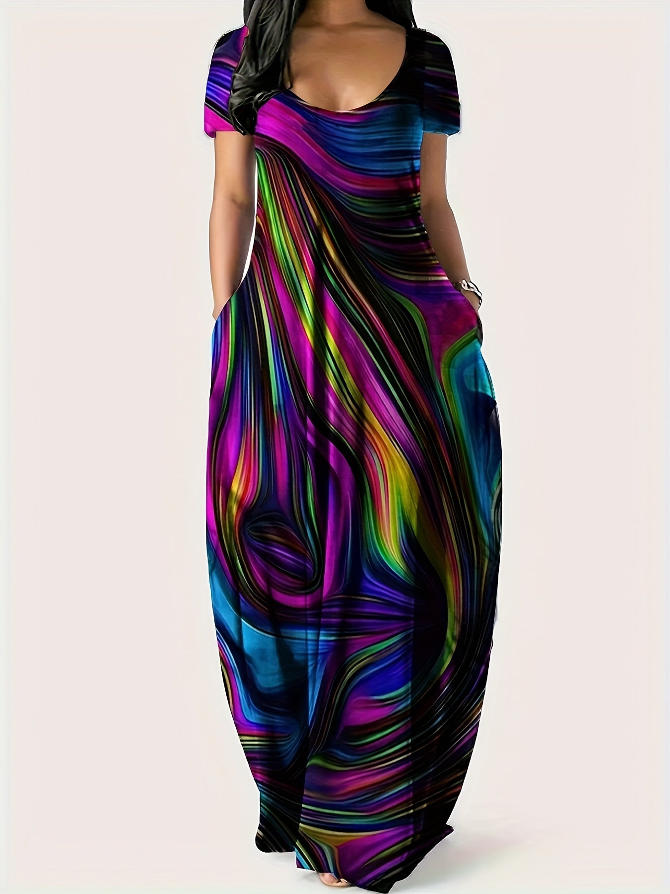 Платье-макси с геометрическим принтом для полных, полиэстеровое трикотажное, повседневное, свободного кроя, с карманами, для всех сезонов