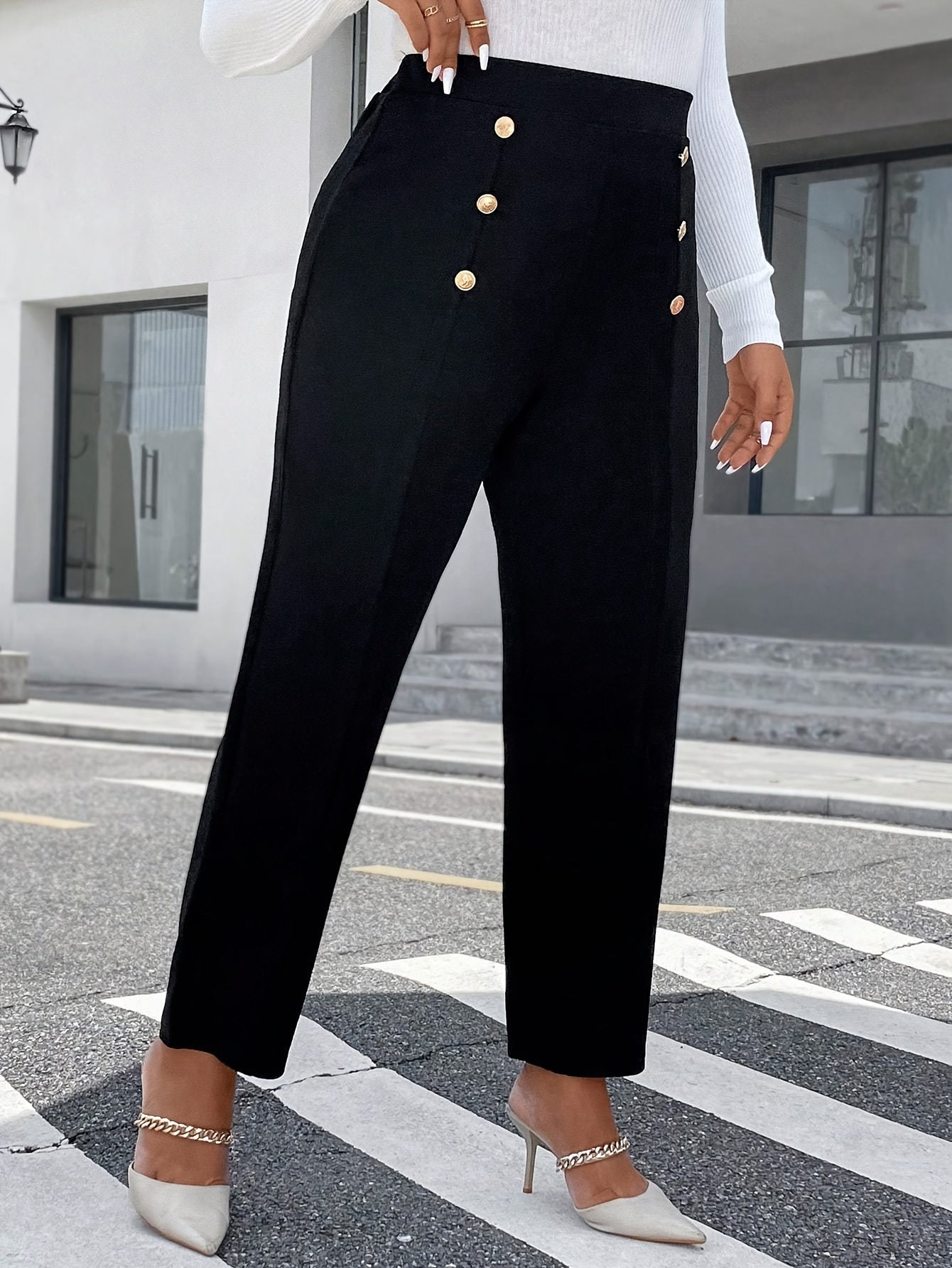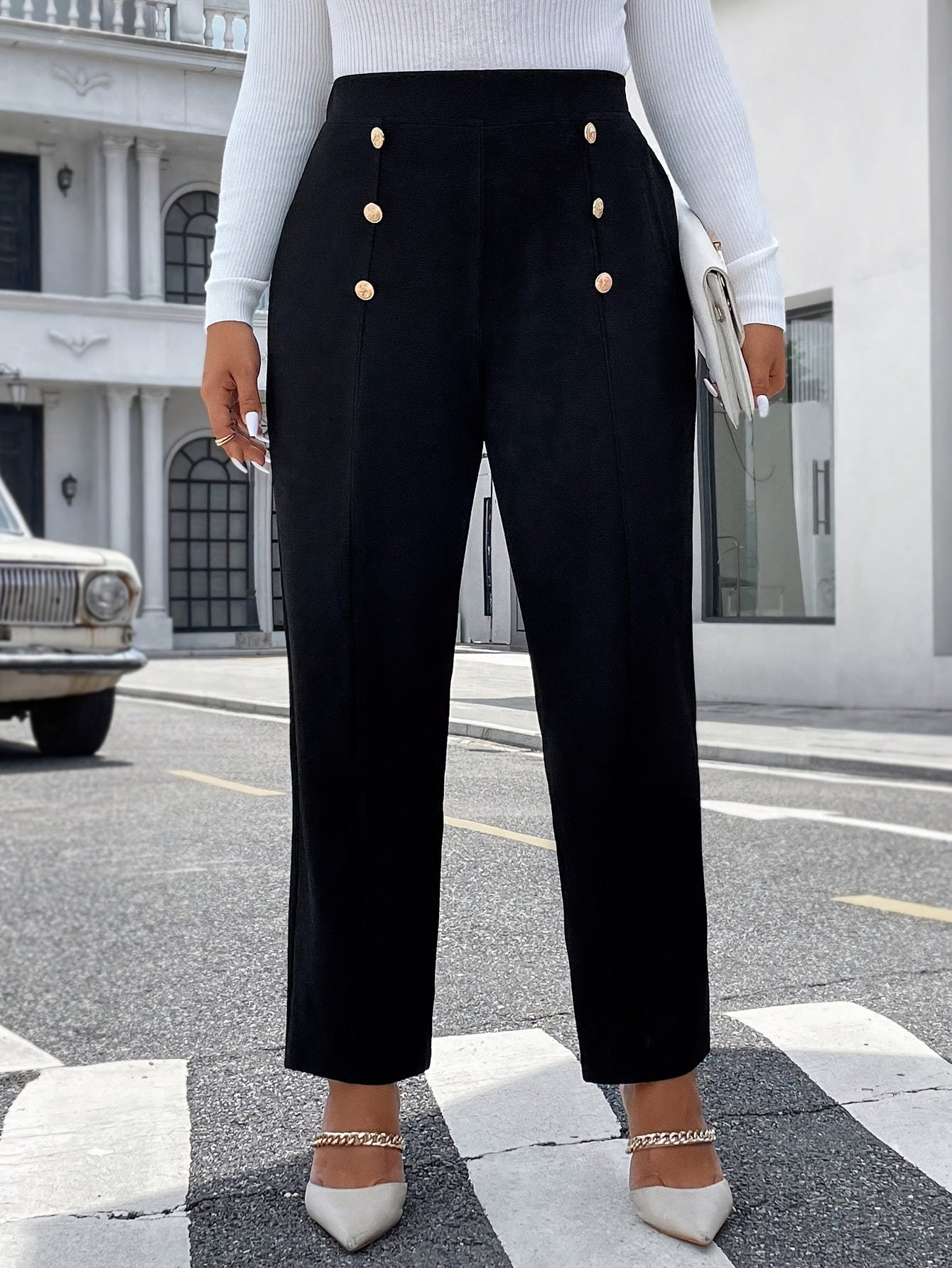 Брюки большого размера с высокой талией и прямым кроем, украшенные декоративными пуговицами, черный полиэстеровый микс