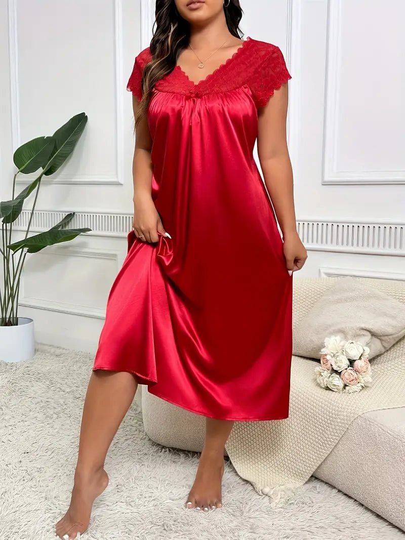 Plus Size Red Satin Nightgown with Lace Trim Short Sleeve V-Neck