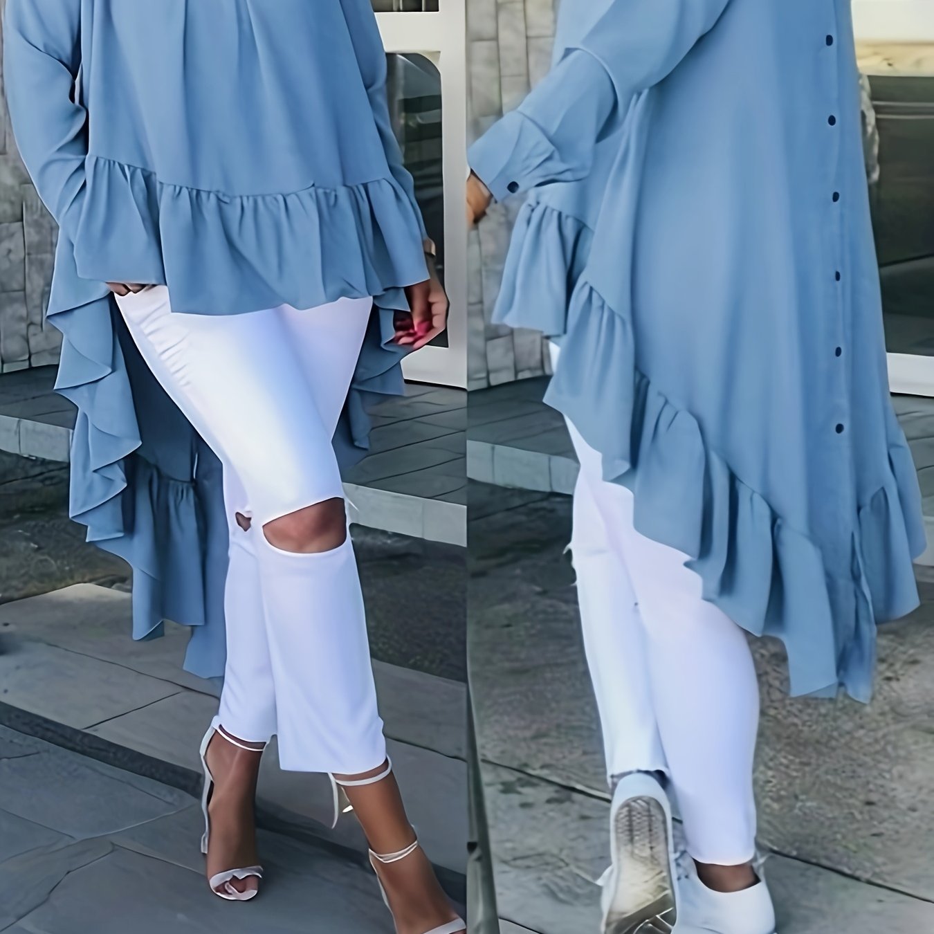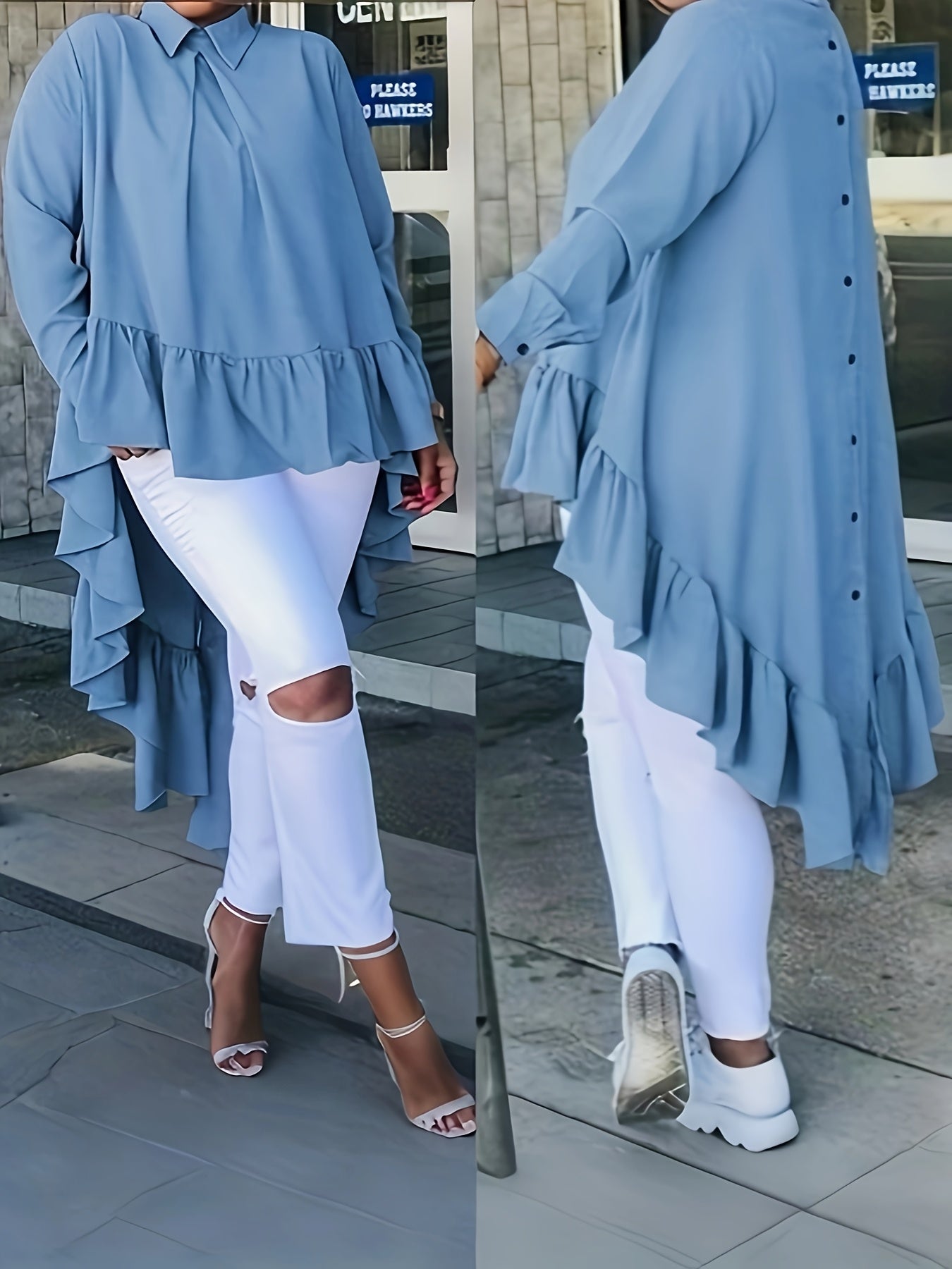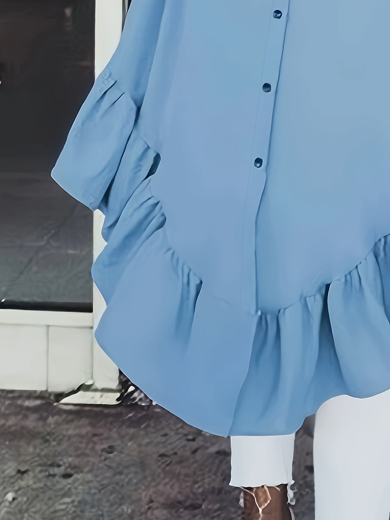 Блузка женская повседневная большого размера с голубым рюшевым краем и длинными рукавами, всесезонная