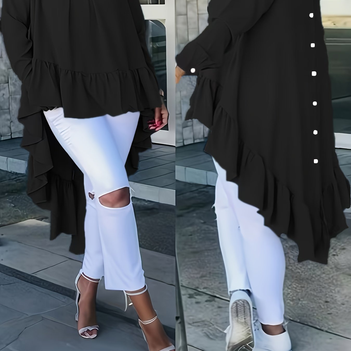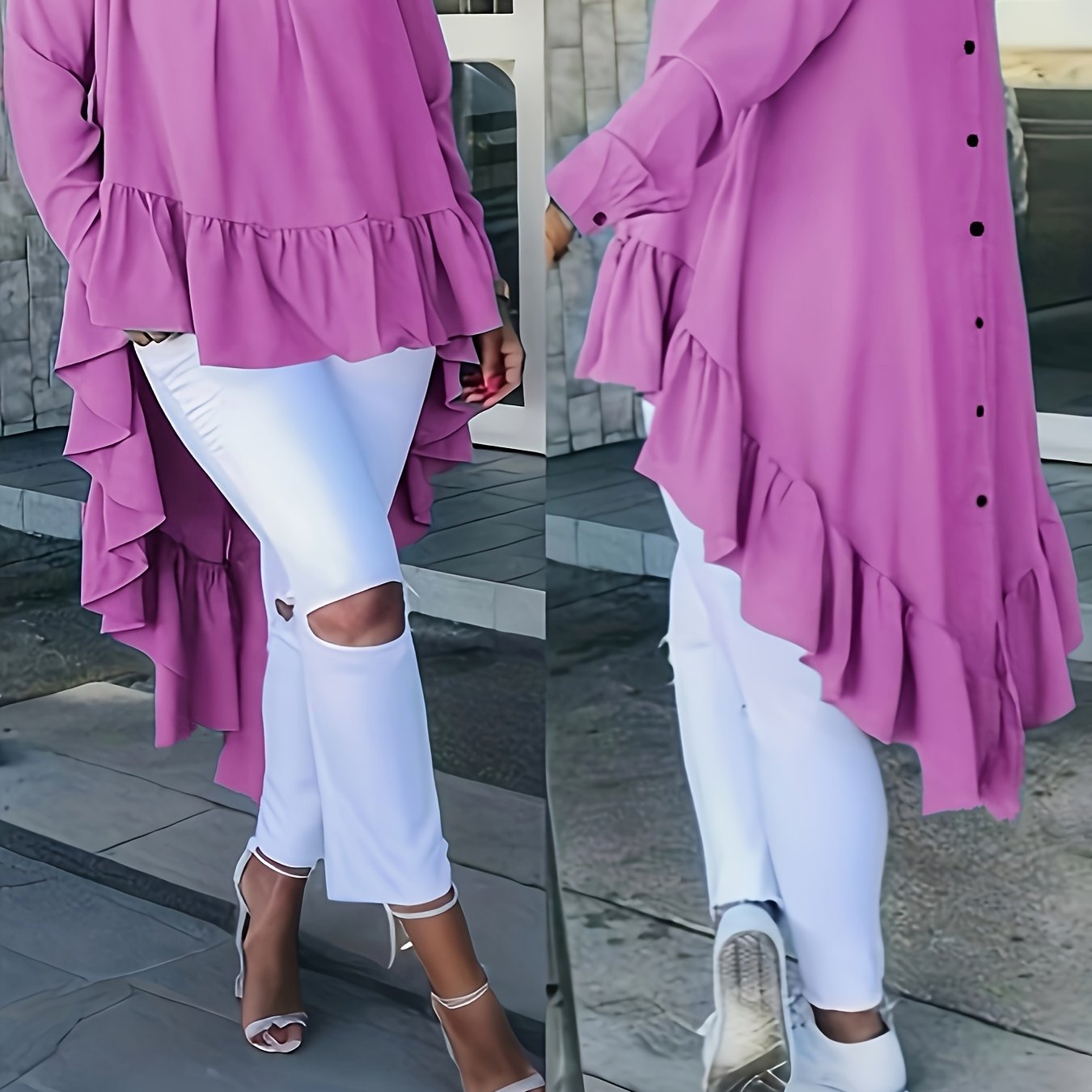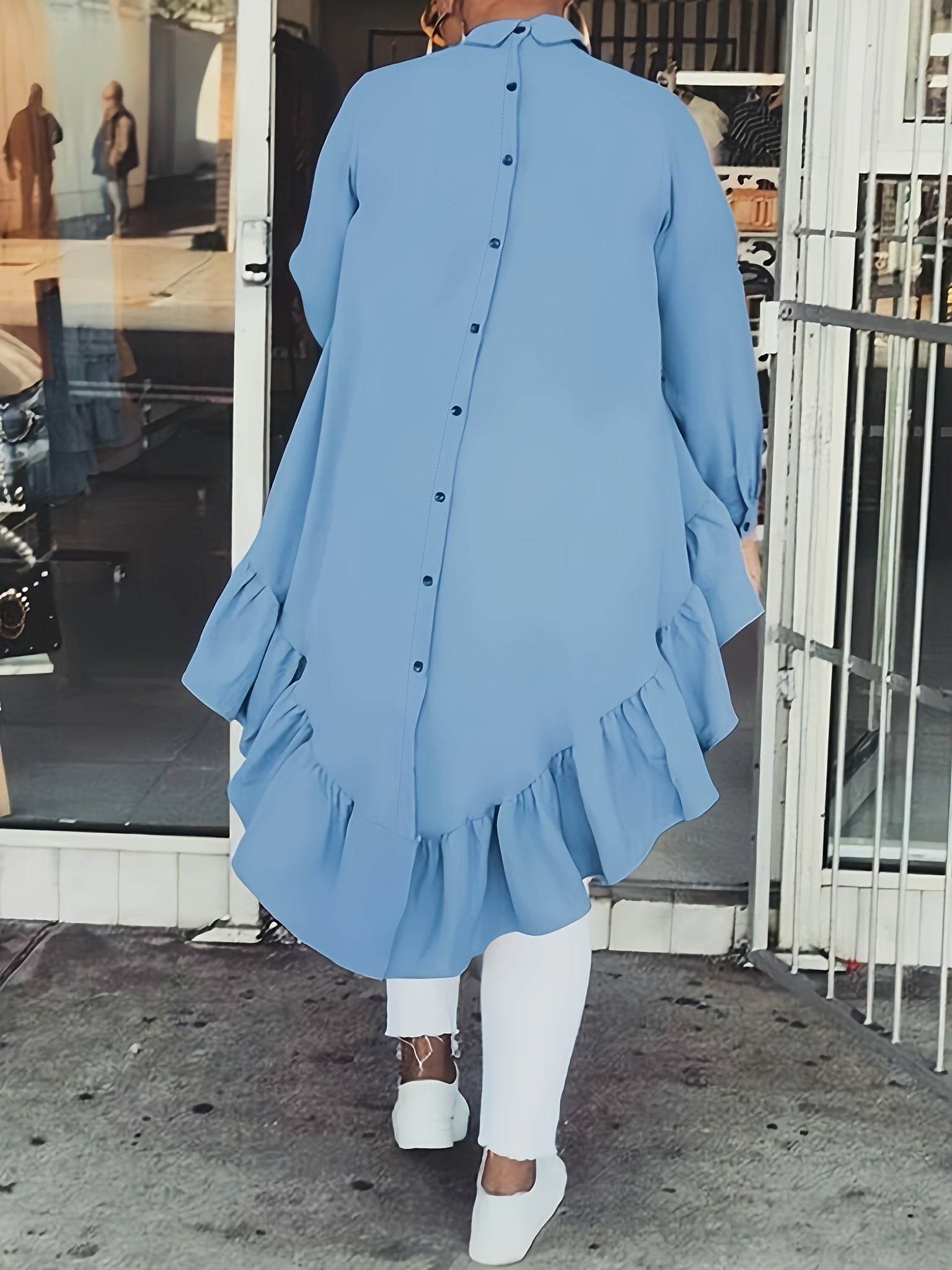 Блузка женская повседневная большого размера с голубым рюшевым краем и длинными рукавами, всесезонная