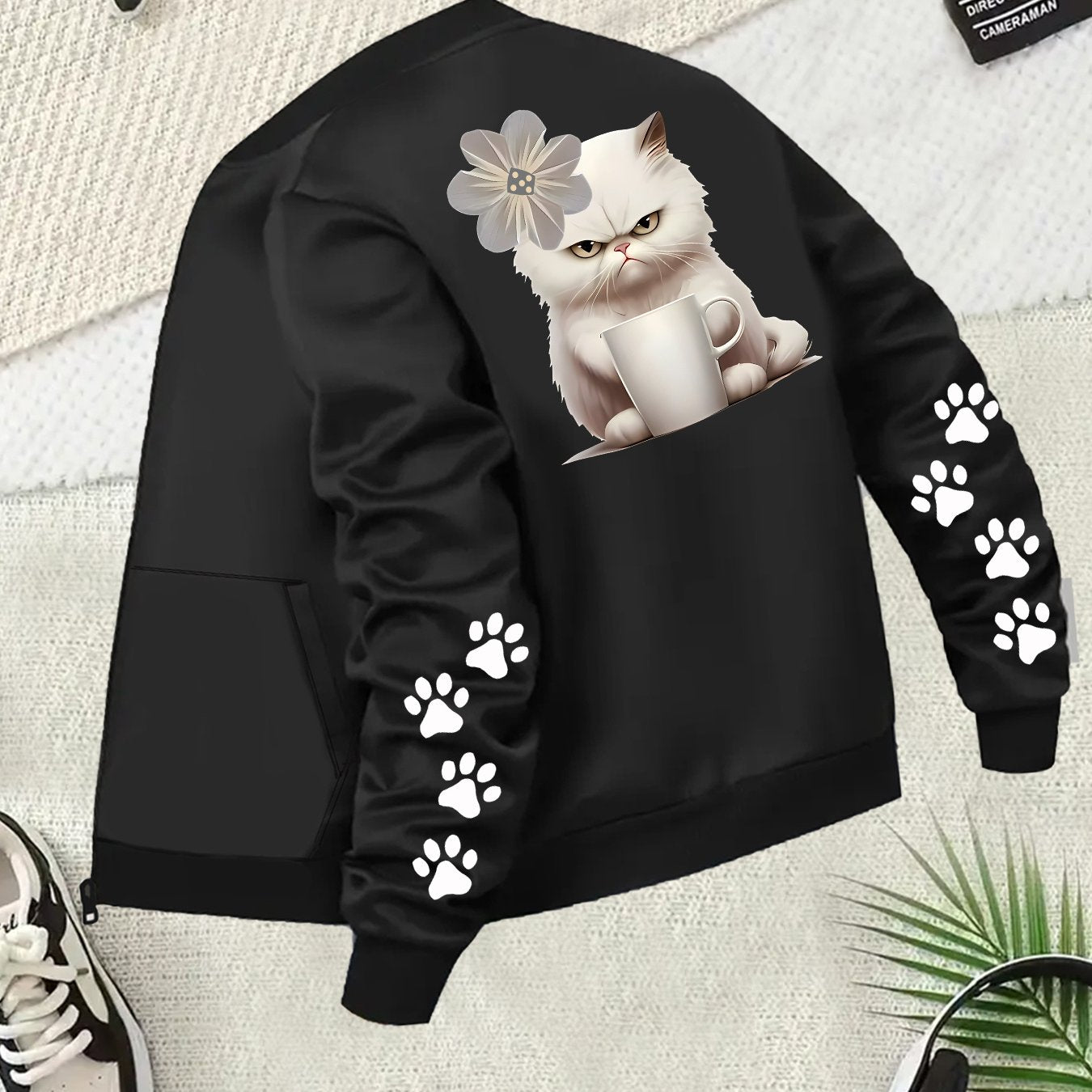 Бомбер-куртка для женщин больших размеров в стиле casual с котом-графикой, черная, всесезонная верхняя одежда