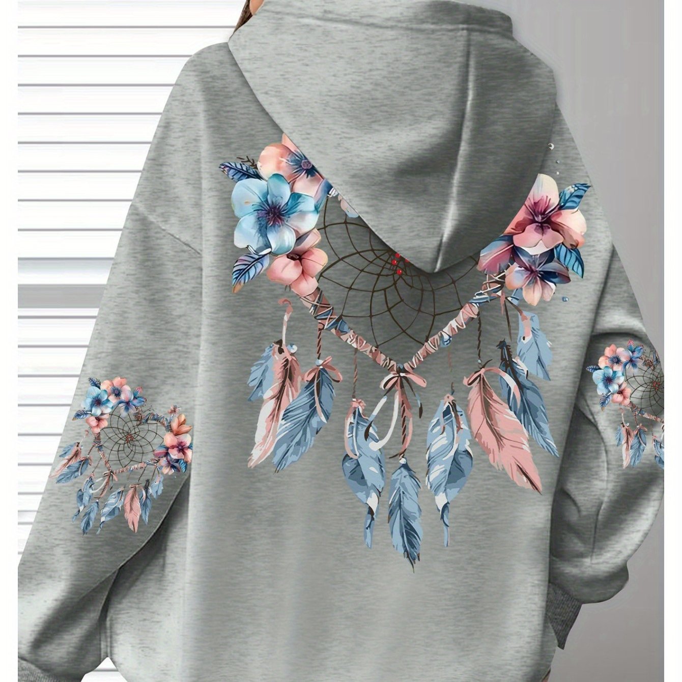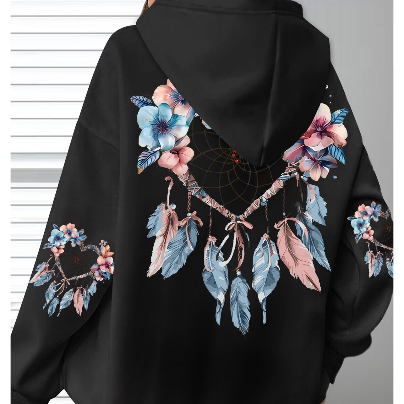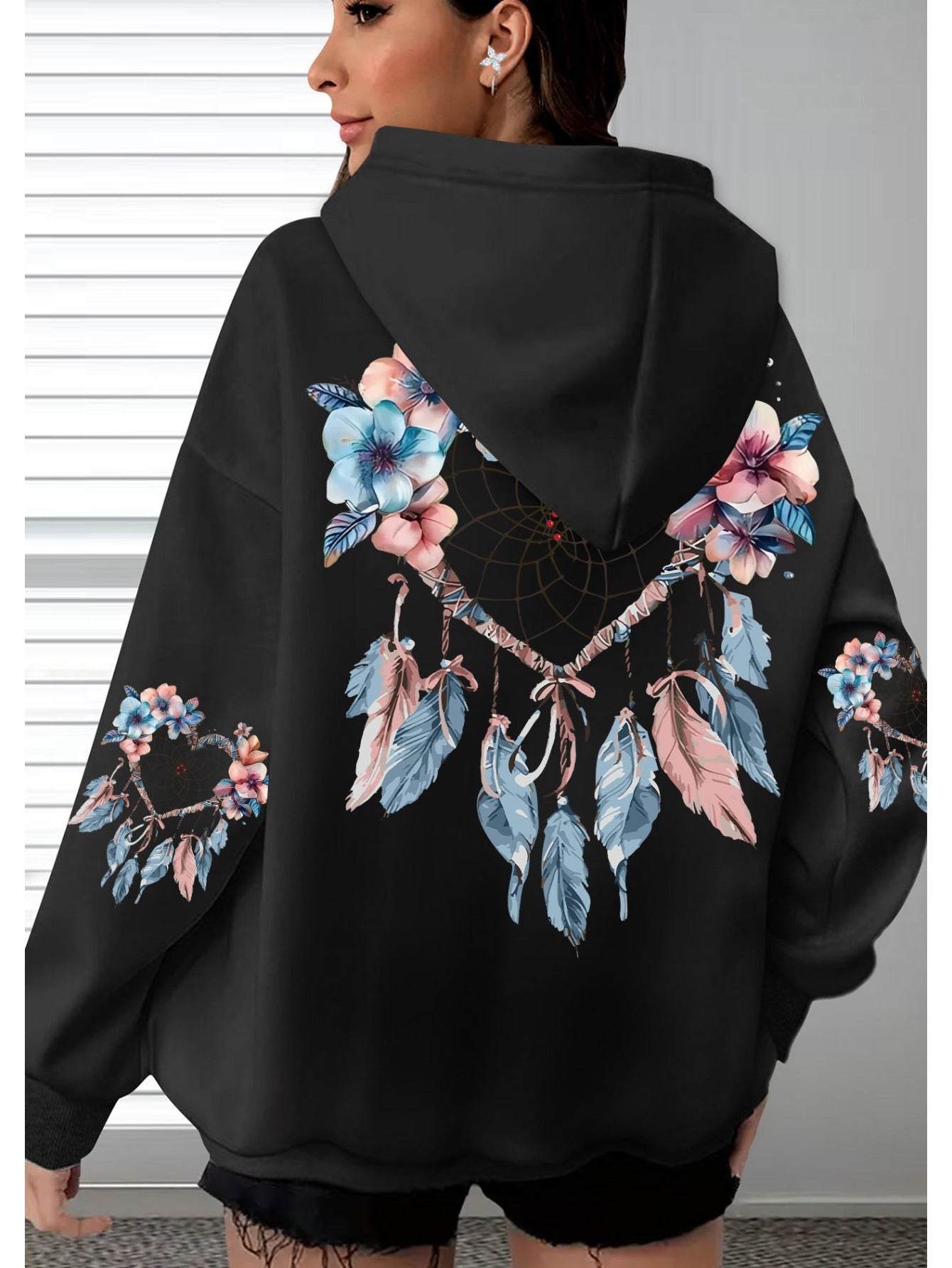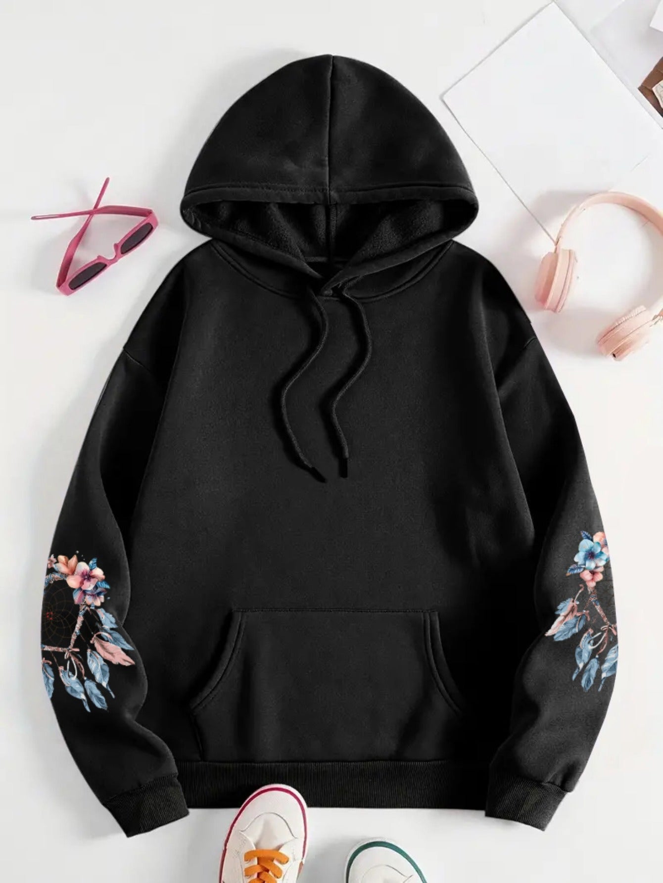 Толстовка женская с цветочным принтом, длинные рукава, черная с карманами, размер плюс