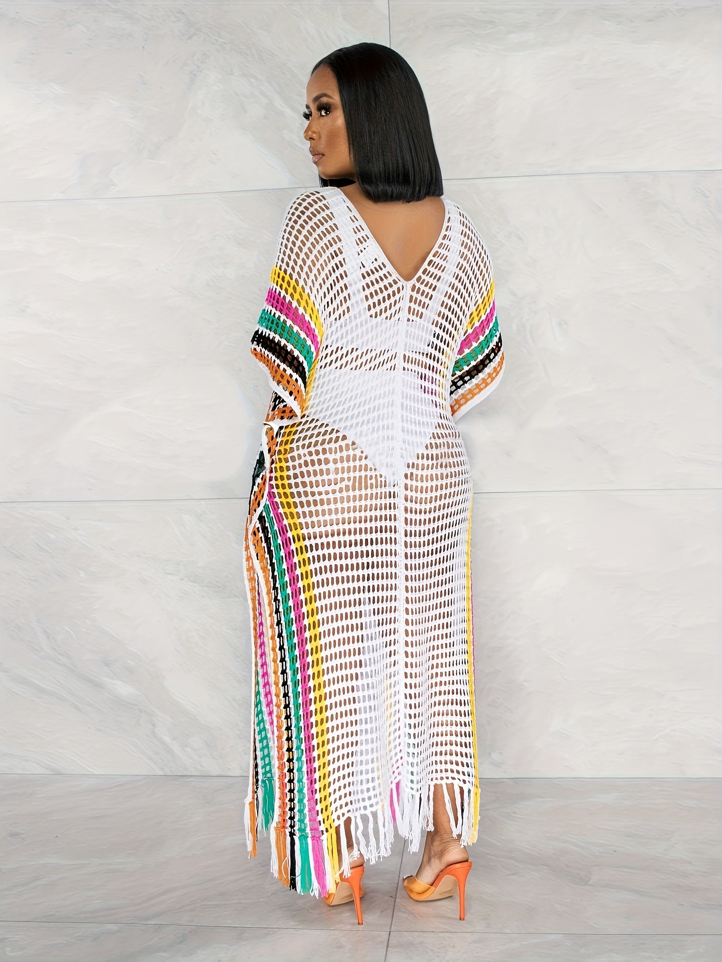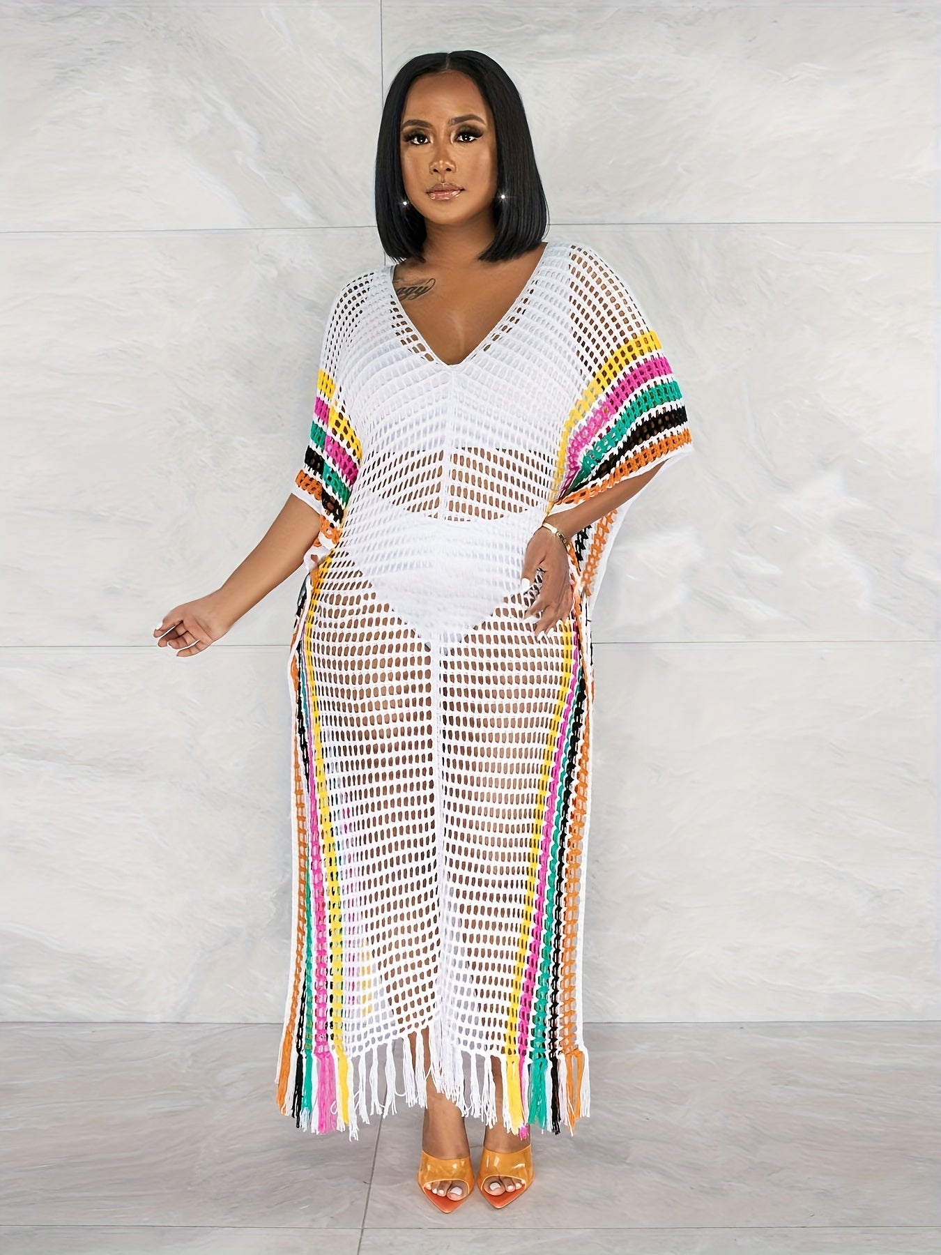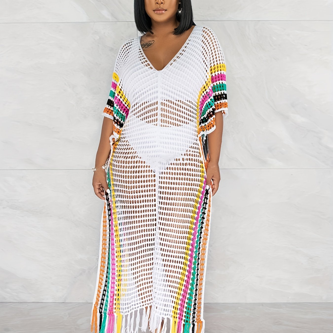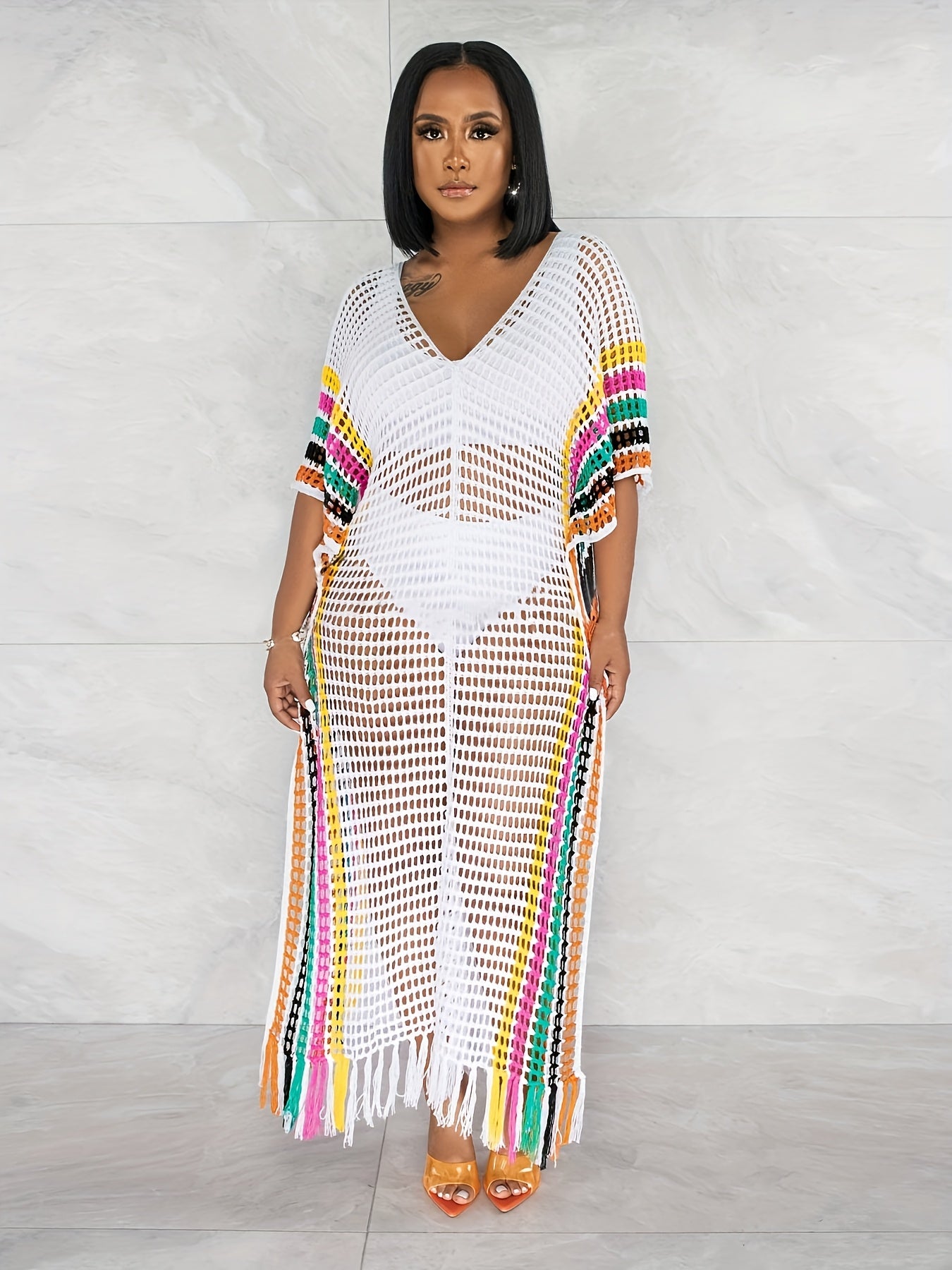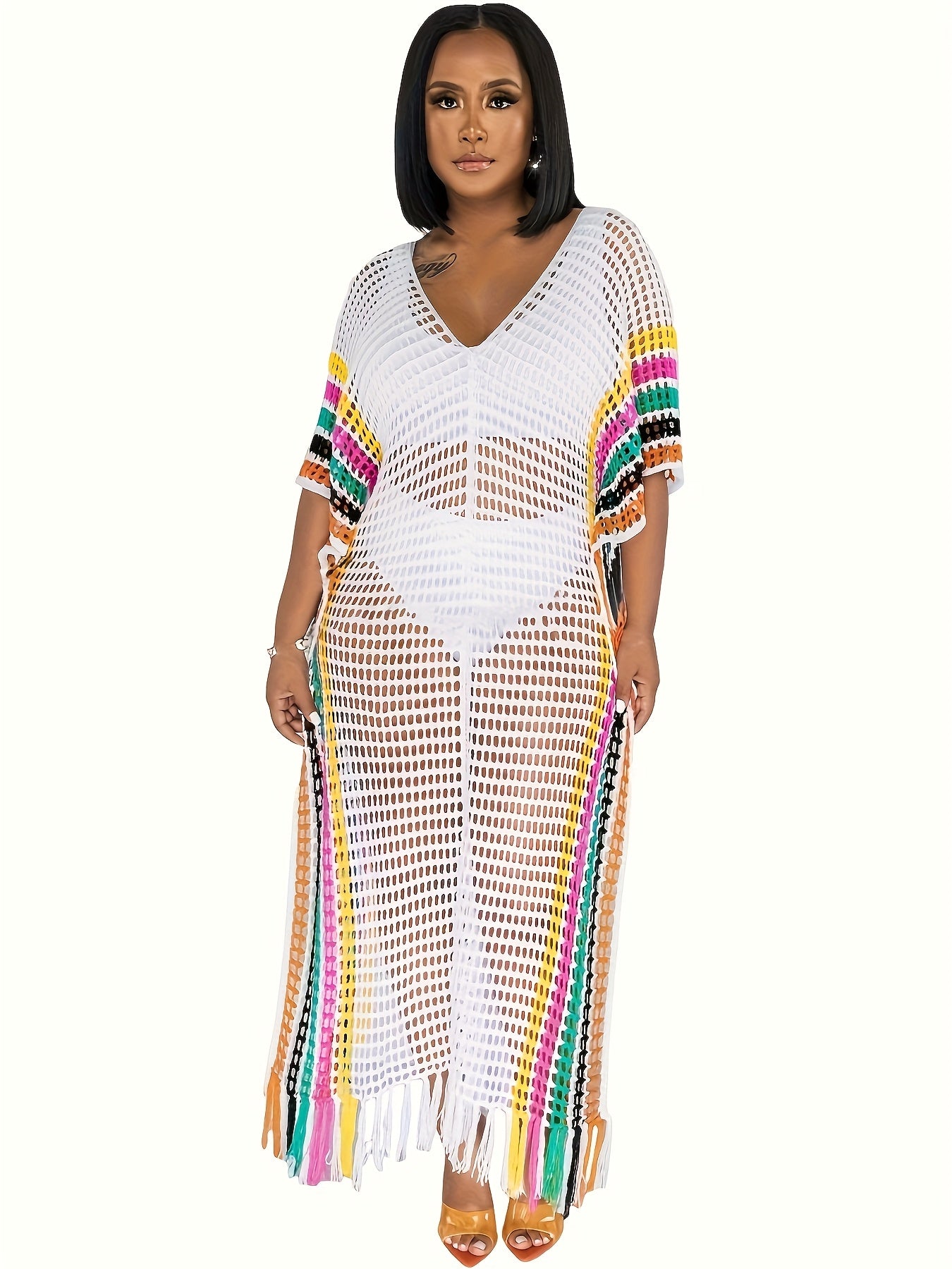 Плюс сайз женский вязаный пляжный свитер с бахромой и контрастными цветами
