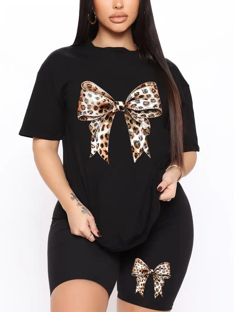 Plus Size Women's Leopard Print Bowknot Casual Sportswear Set