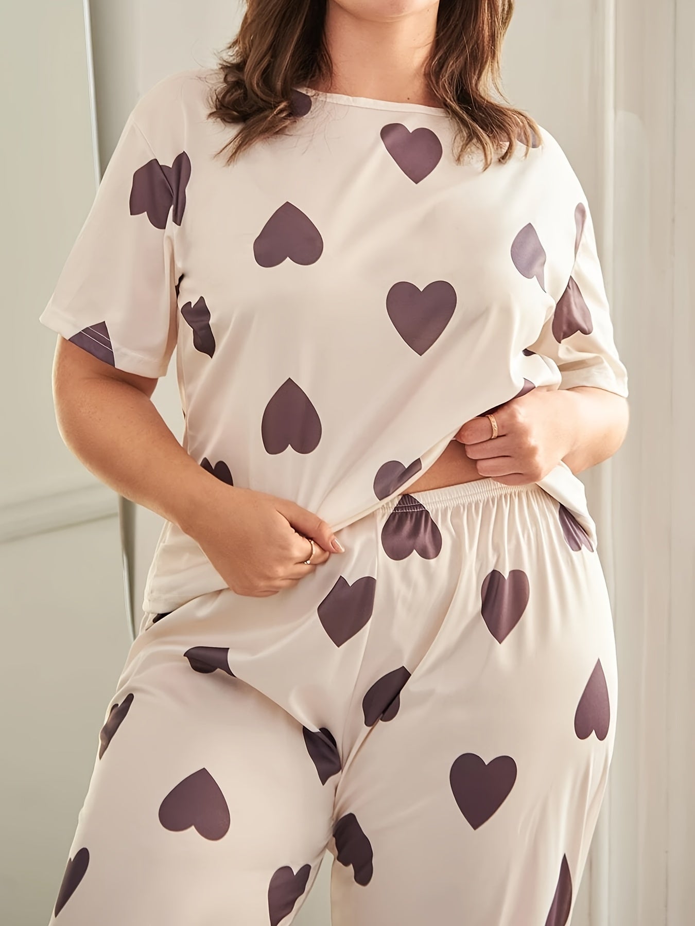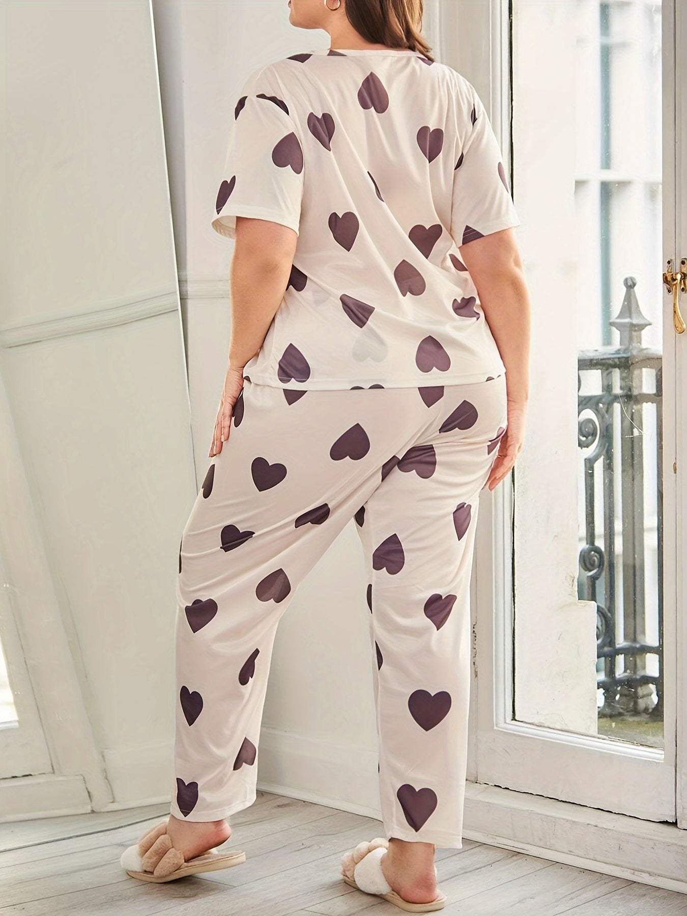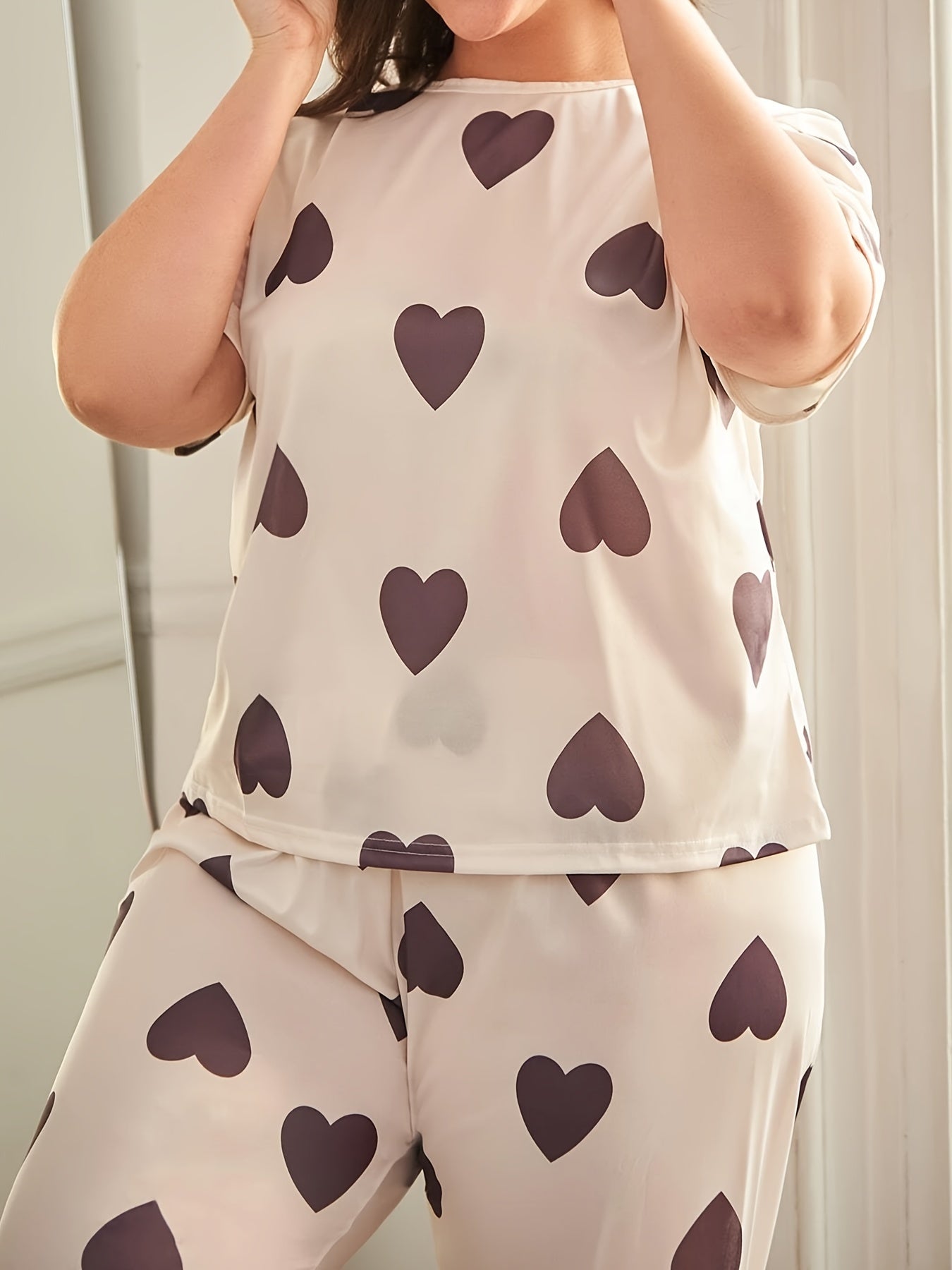 Пижама для женщин больших размеров с принтом сердечек, короткий рукав, топ и штаны, осень-зима, полиэстер