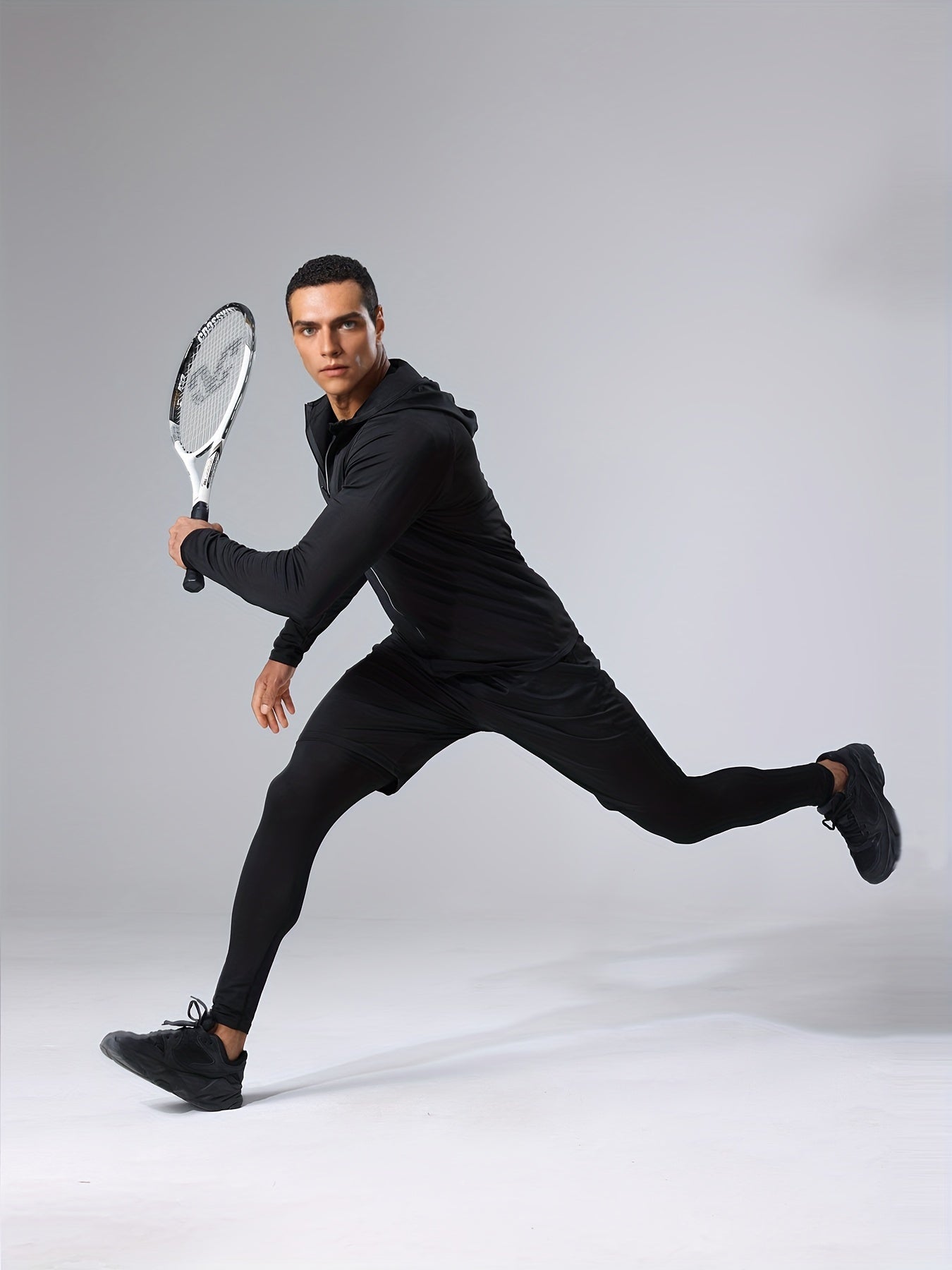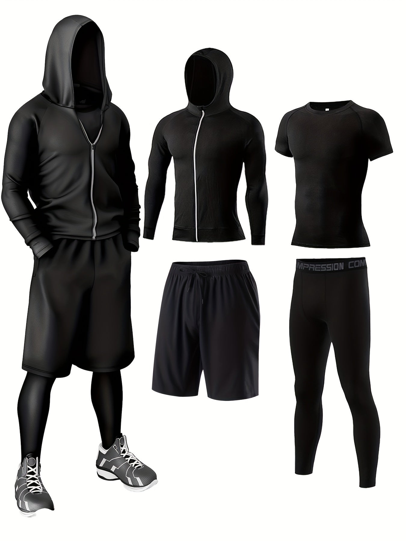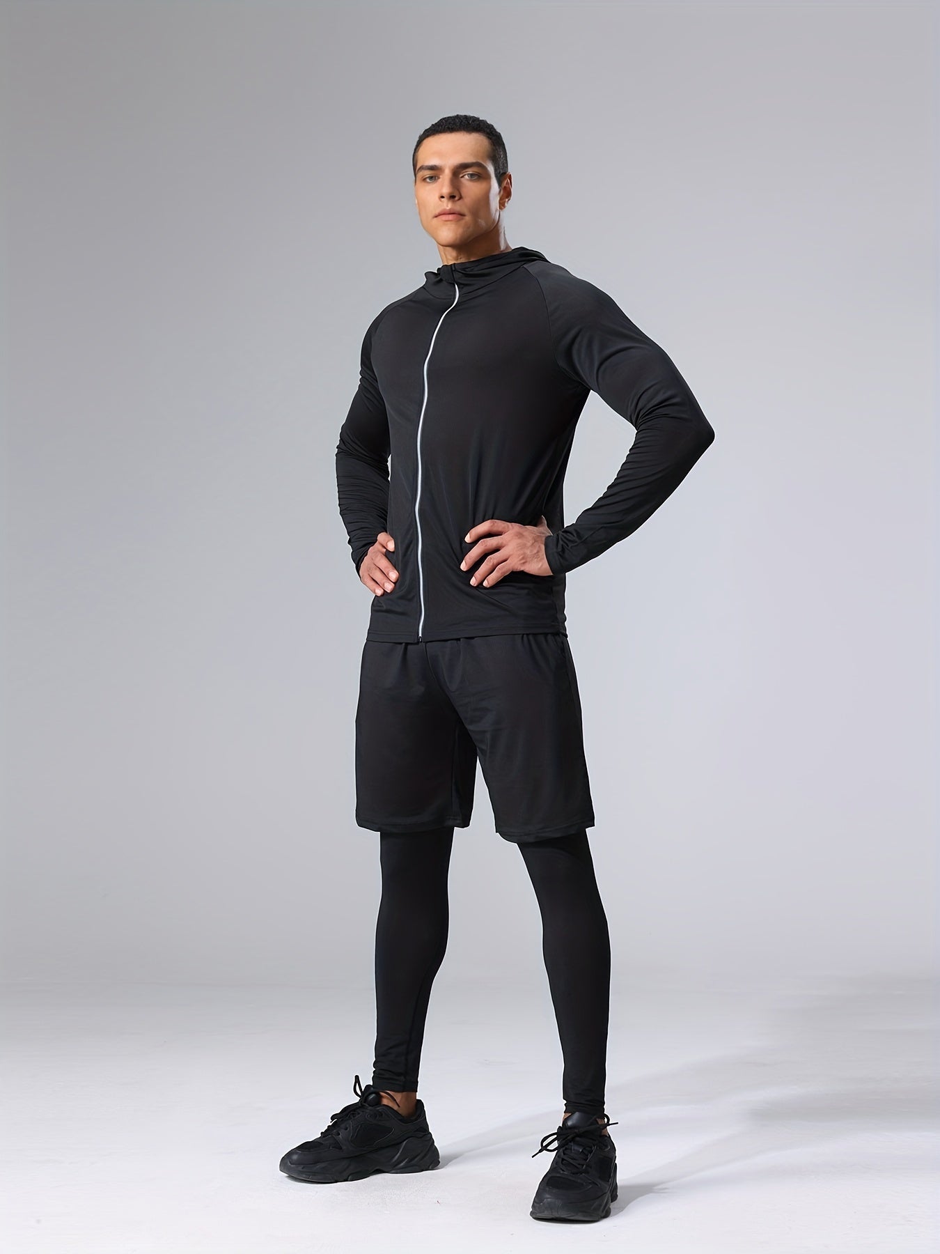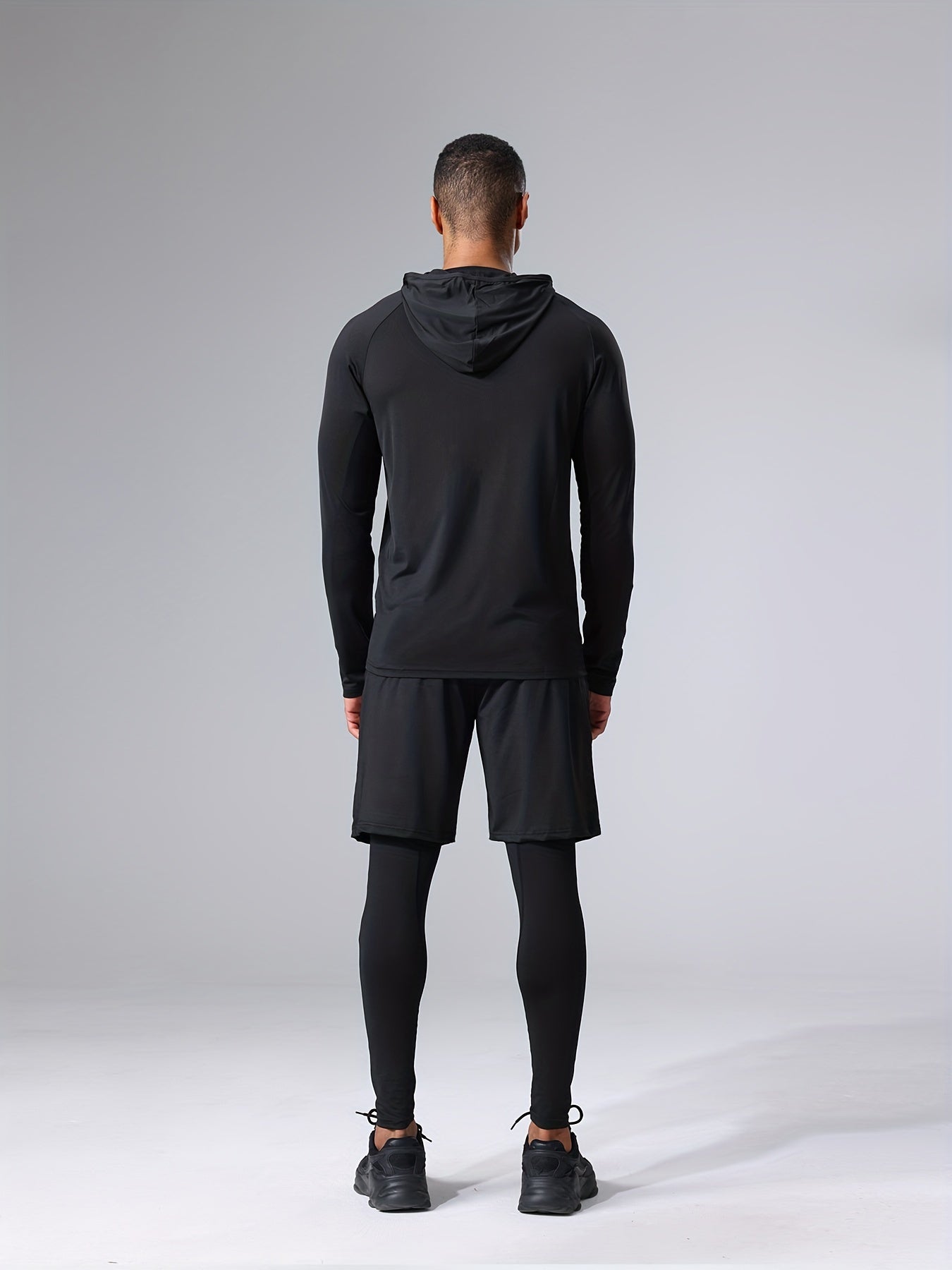 Комплект спортивной одежды из смеси полиэстера и эластана включает в себя худи с круглым вырезом и облегающие брюки для бега, фитнеса, велоспорта и активного отдыха.