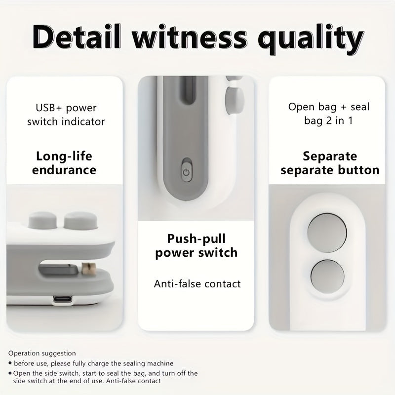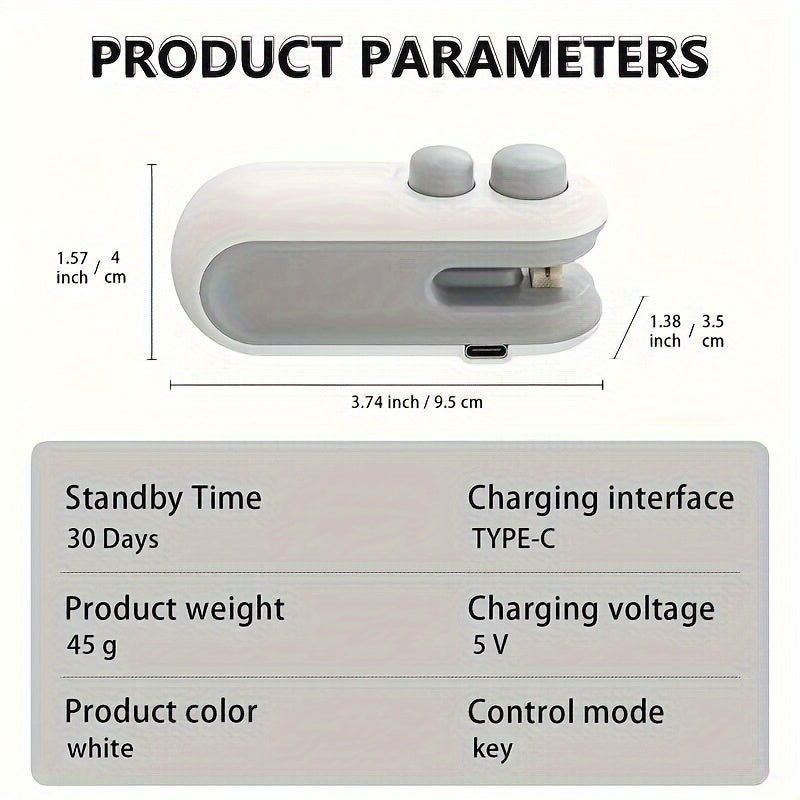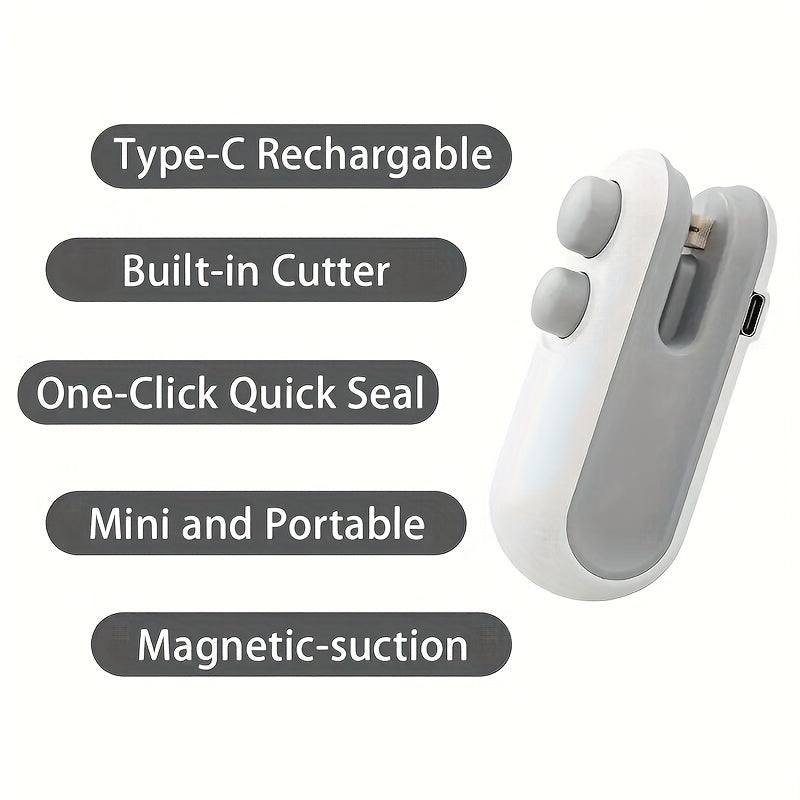 Портативный и удобный 2-в-1 мини-USB перезаряжаемый термоупаковщик и резак. Сохраняйте свои закуски и чипсы свежими с функцией вакуумной герметизации. Компактный дизайн со встроенным литиевым аккумулятором для удобства использования в дороге.