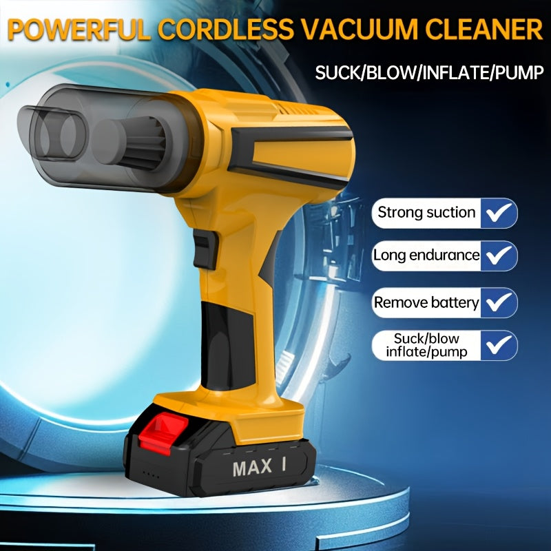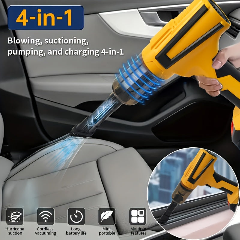 Портативный беспроводной пылесос с бесщеточным мотором мощностью 20000Па и множеством насадок, подходящий для интерьеров автомобилей, домов и офисов. Оснащен возможностью зарядки через USB и прочной конструкцией.