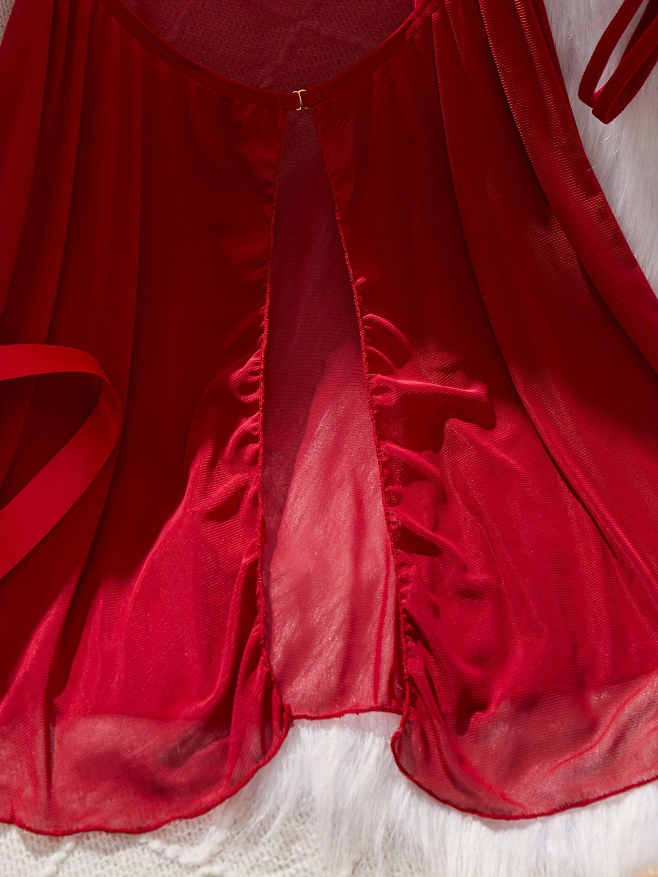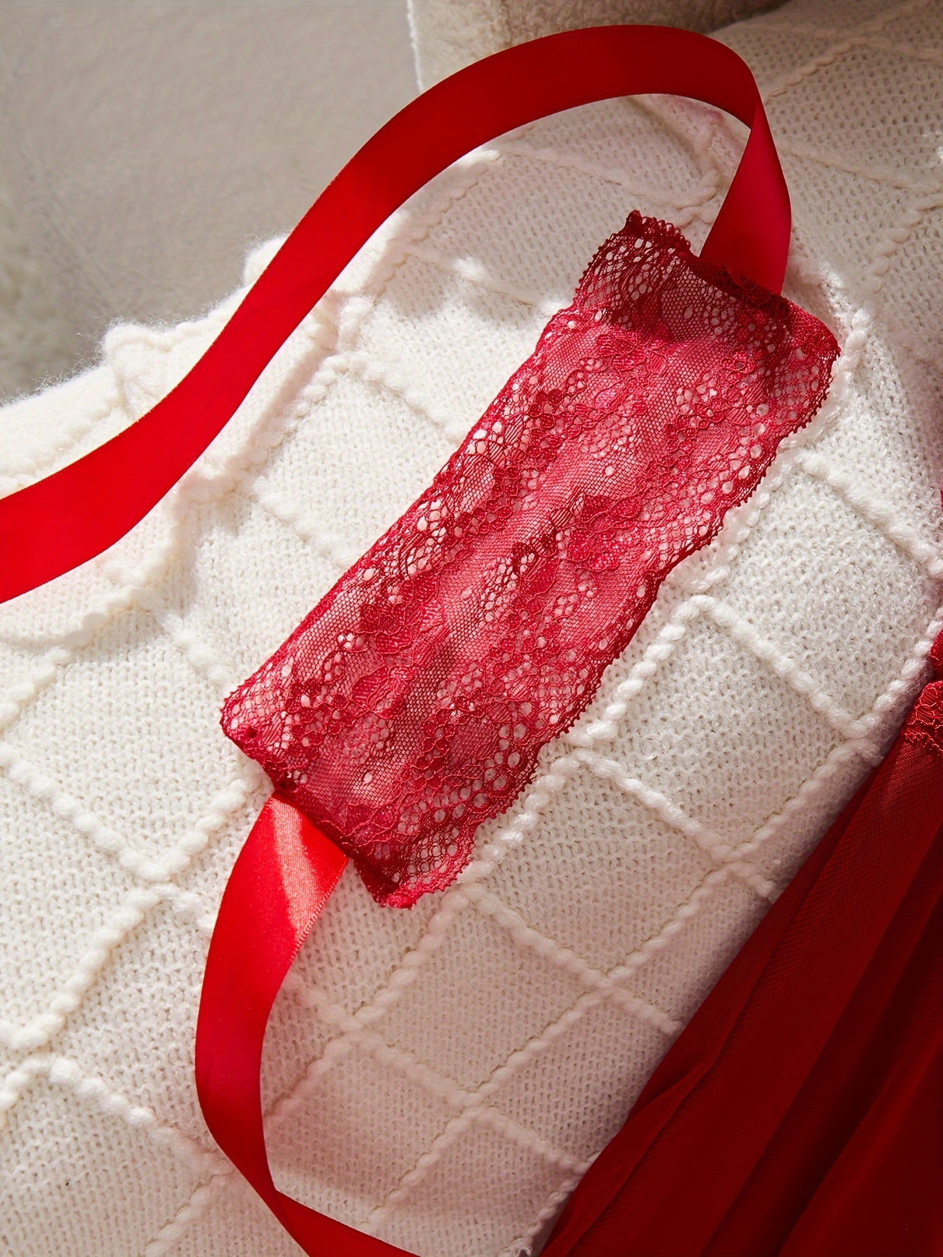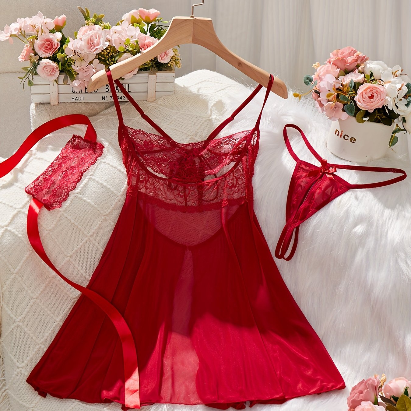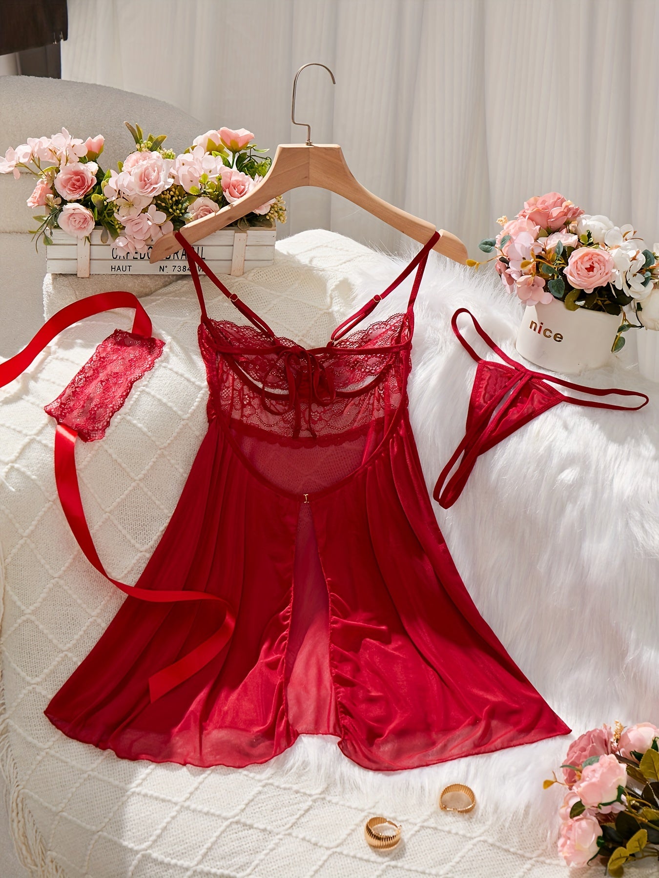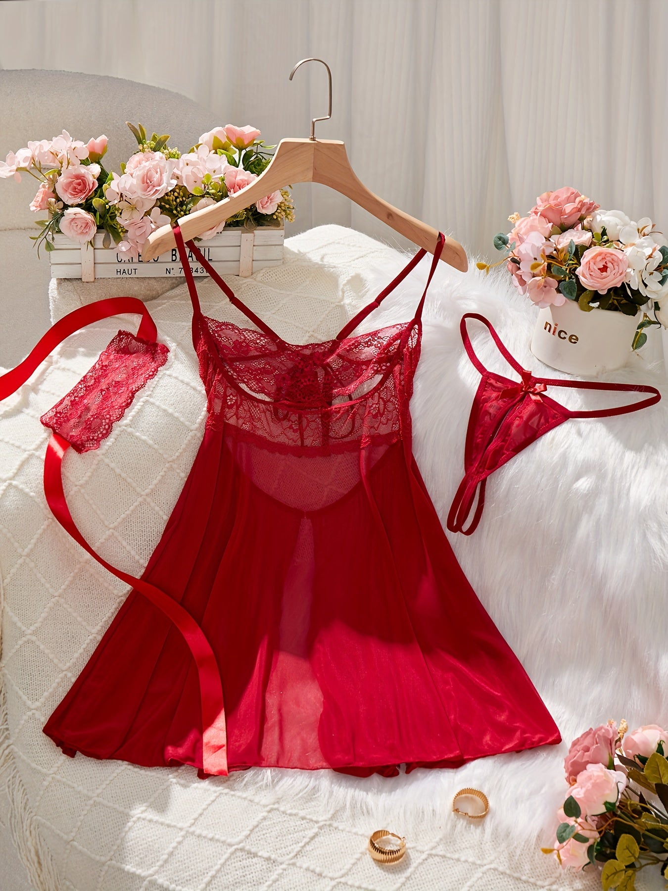 Красный комплект нижнего белья, включающий платье-бэбидол, стринги, маску для глаз, кружевные детали, атласные ленты - идеально подходит для соблазнительного бодуарного наряда.