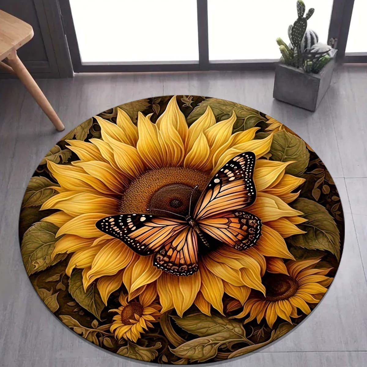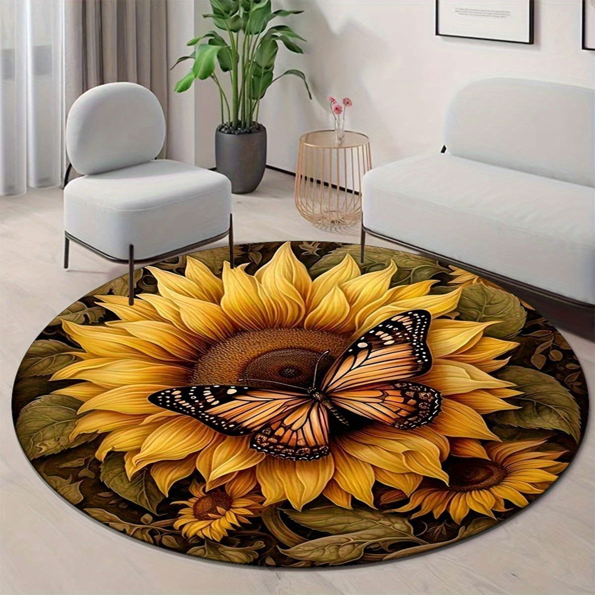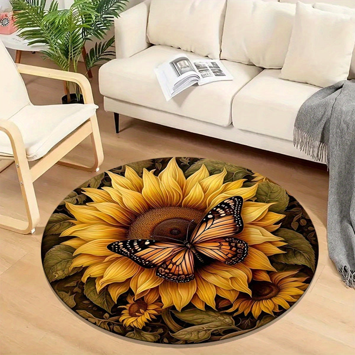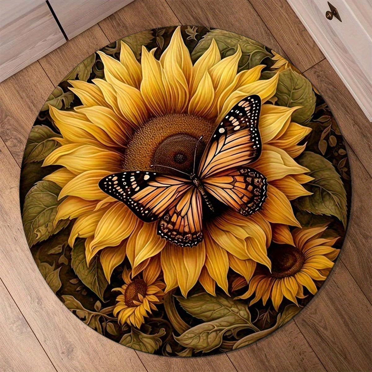 Круглый противоскользящий коврик с дизайном бабочки и подсолнуха - стойкий к пятнам, washable полиэстерный коврик для прихожей или декора спальни, яркие цветочные и бабочки детали