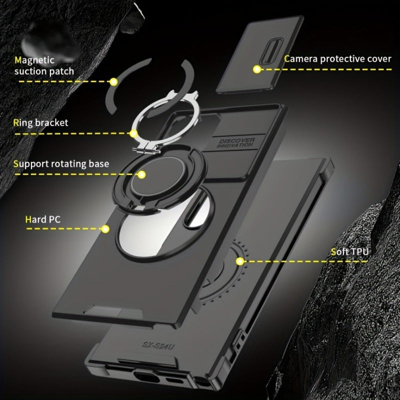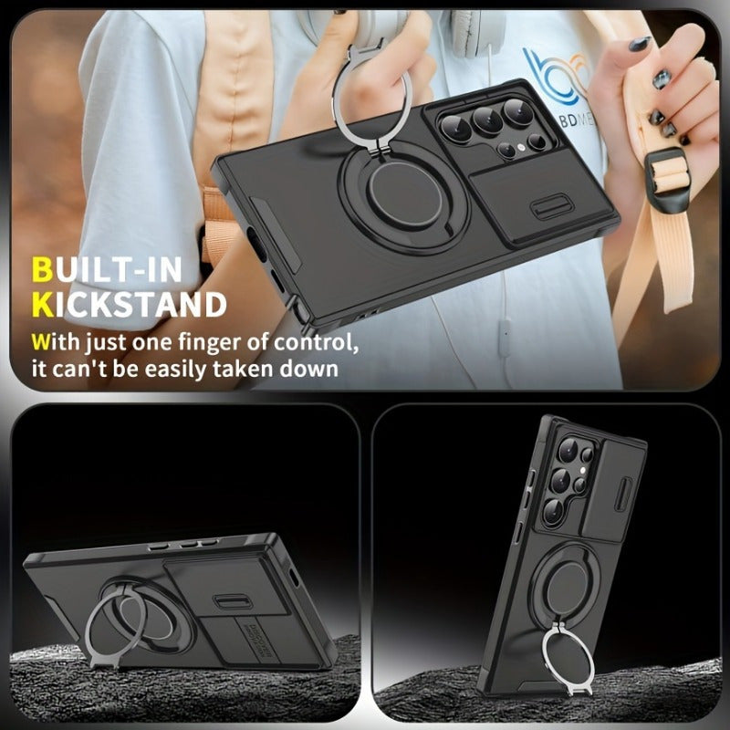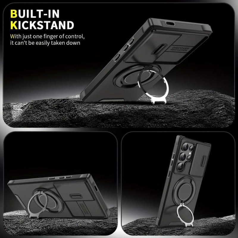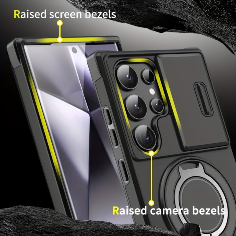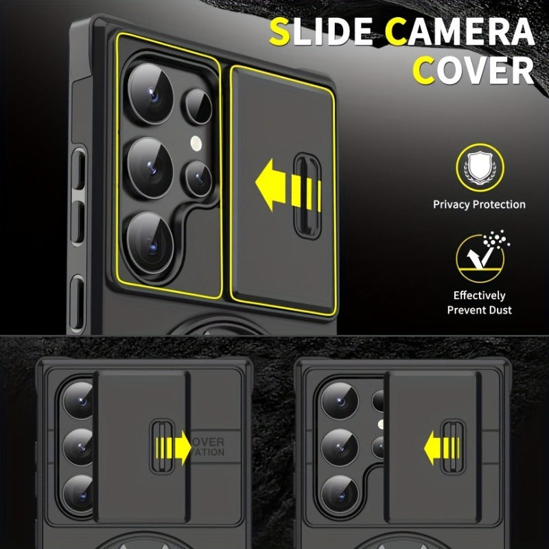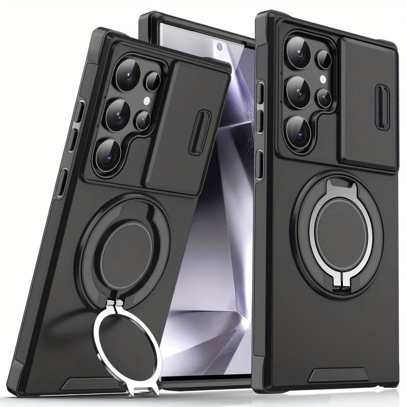 Чехол для телефона Samsung Galaxy с выдвижной крышкой для камеры, всесторонняя защита камеры, 360° вращающаяся круглая подставка, магнитный автомобильный держатель, матовая текстура, ударопрочный для моделей S25-S20 FE.