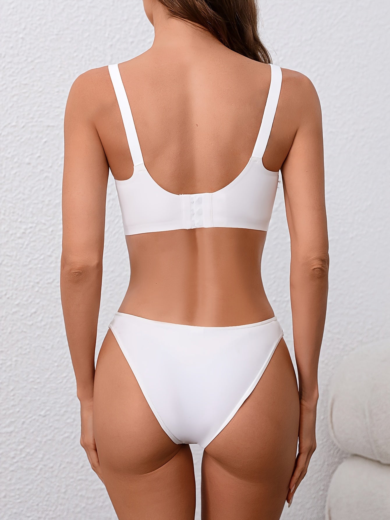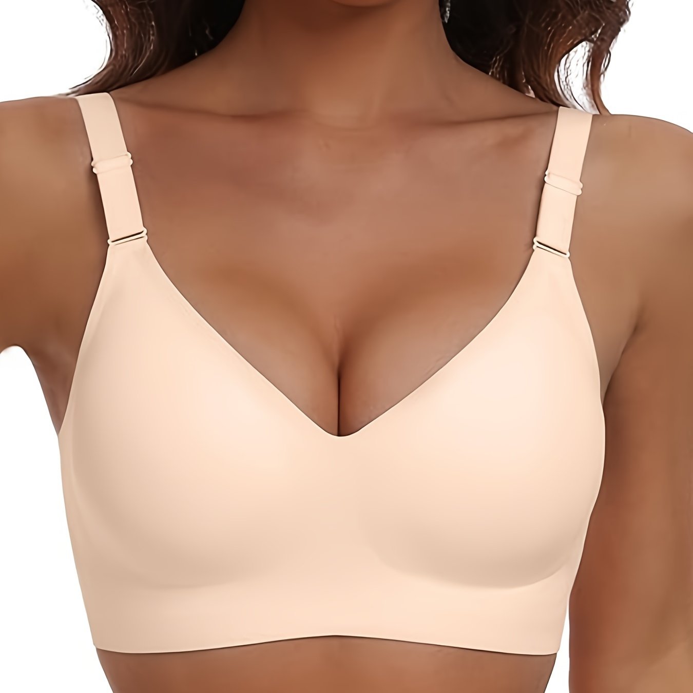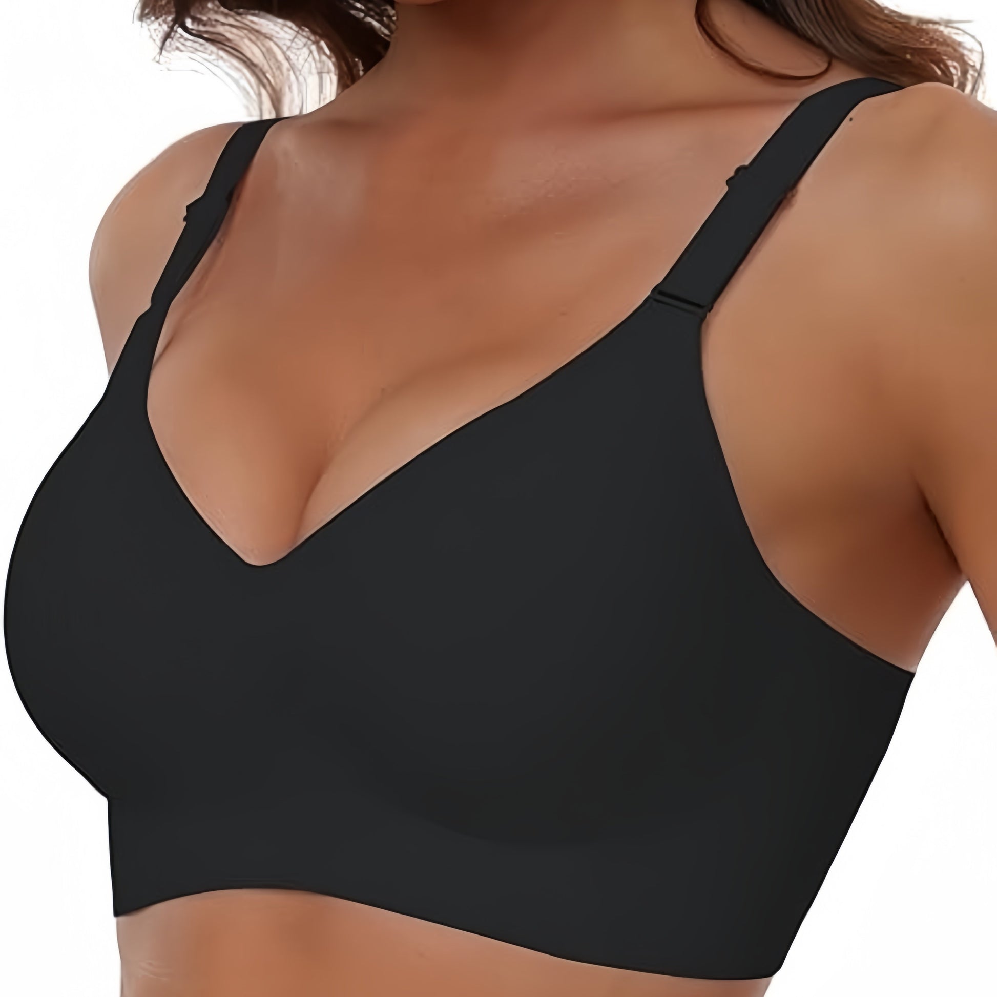 Бра с бесшовным V-образным вырезом, регулируемыми бретелями и беспроводной поддержкой, изготовленный из смеси нейлона и спандекса. Непрозрачная трикотажная ткань с съемными подушечками, идеально подходит для повседневной носки.