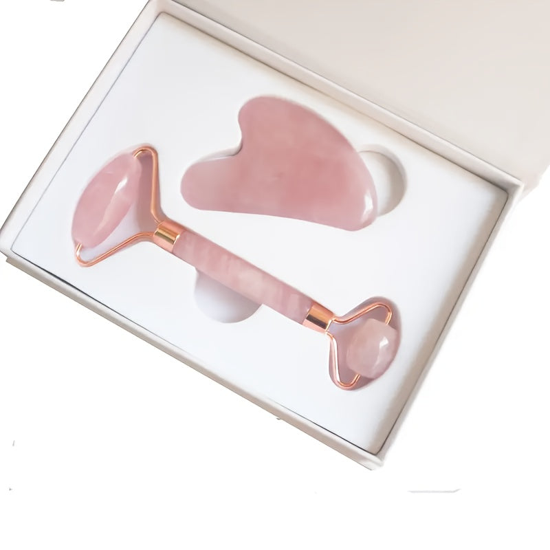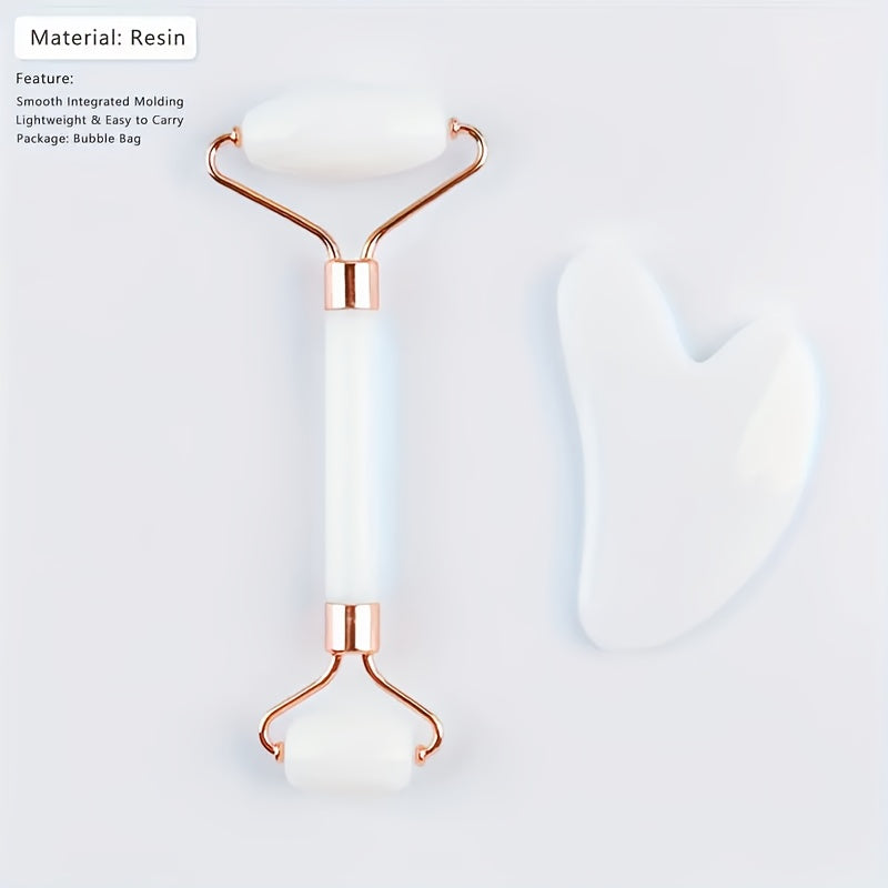 Набор инструментов для массажа лица: ролик с двумя головками и гуаша в форме сердца в розовом и белом