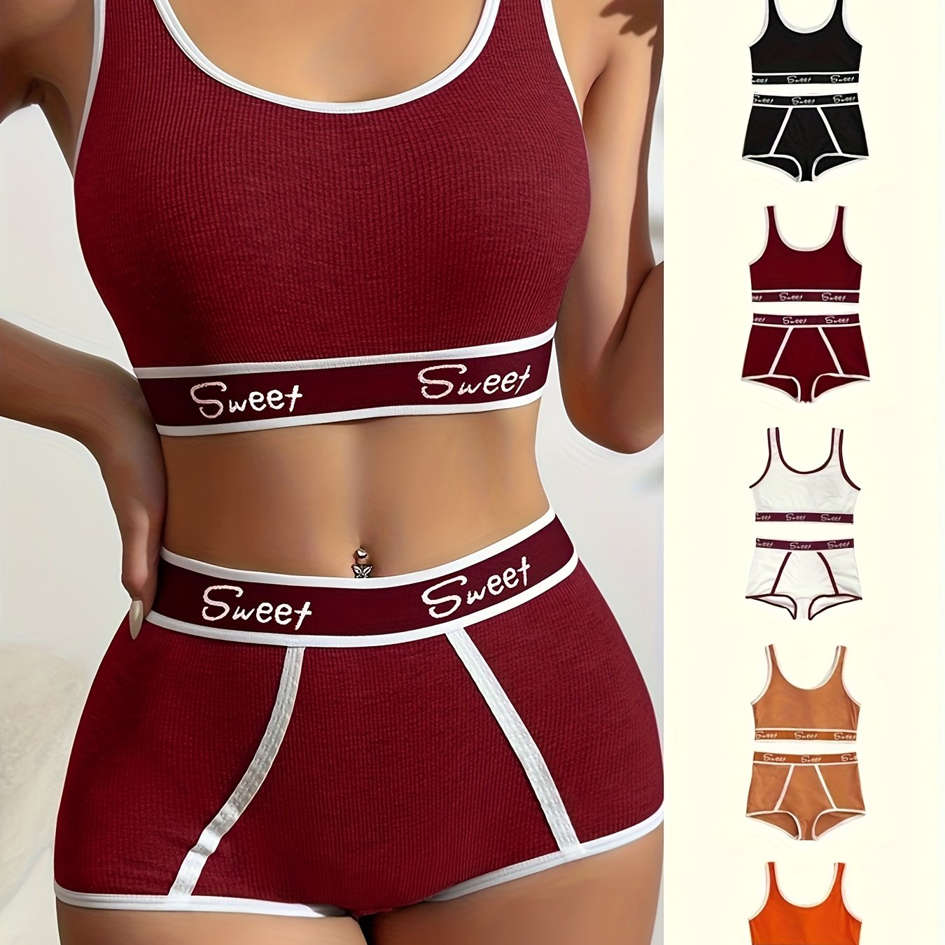 Комплект из 5 предметов женского нижнего белья с буквенным принтом, включает спортивный бюстгальтер и боксеры из комфортной, мягкой ткани. Оставайтесь стильными и уверенными каждый день с этим модным дизайном.