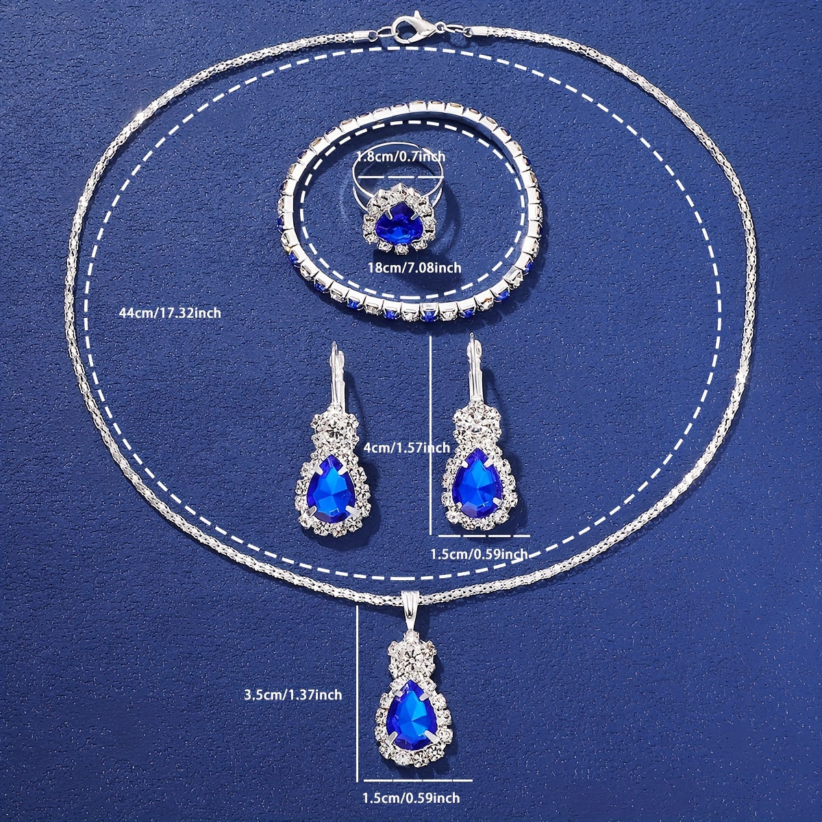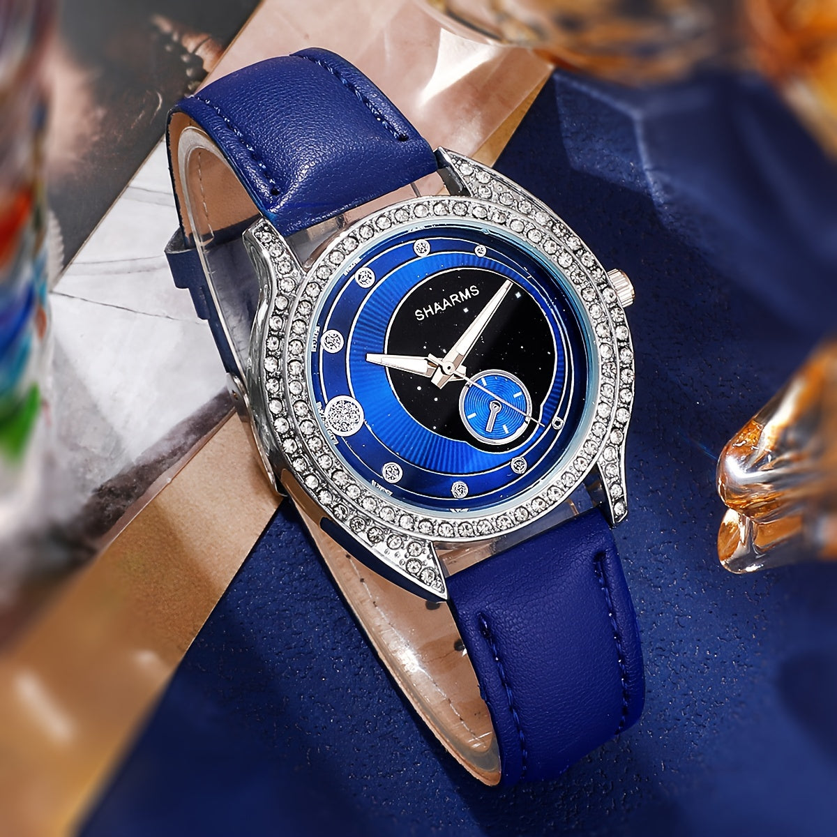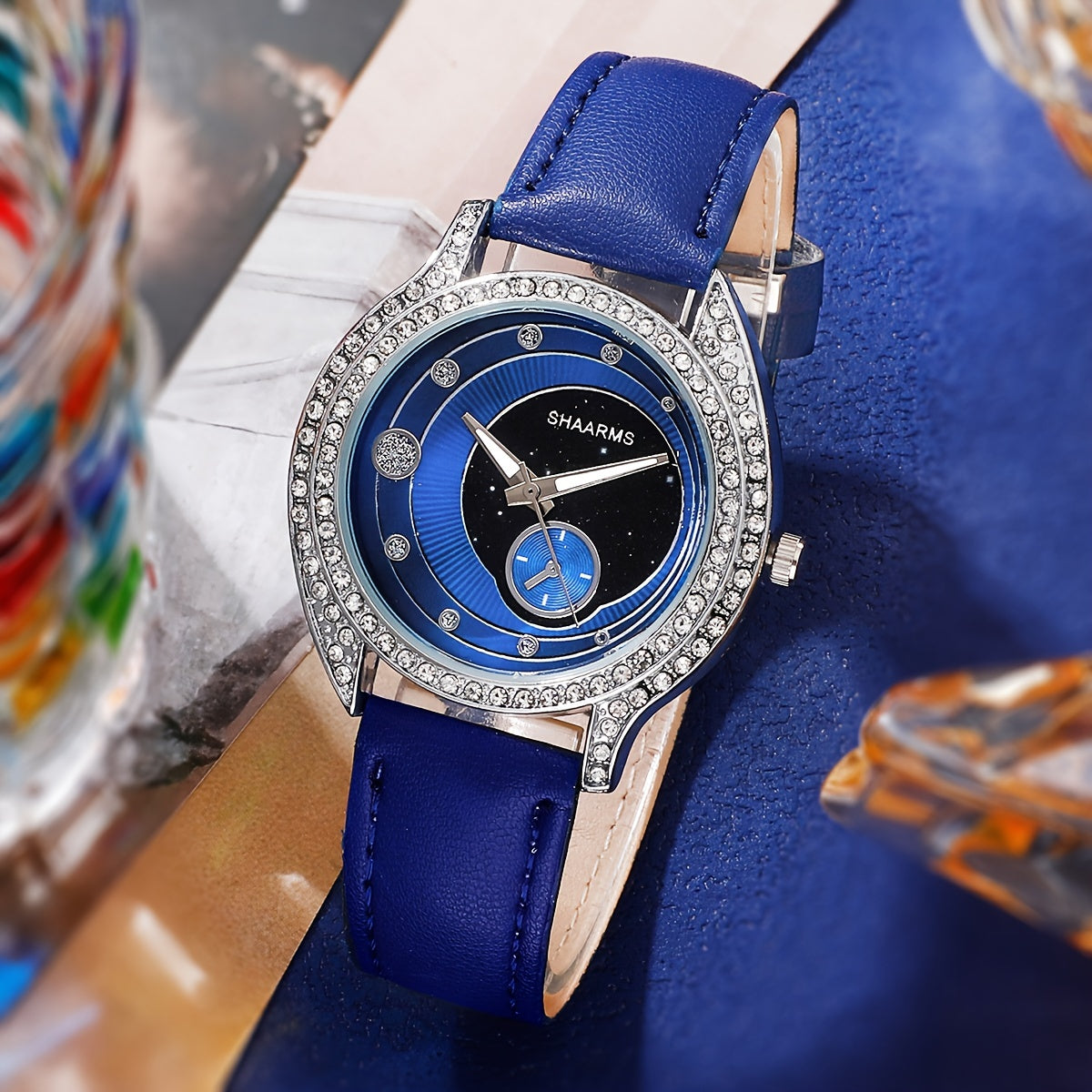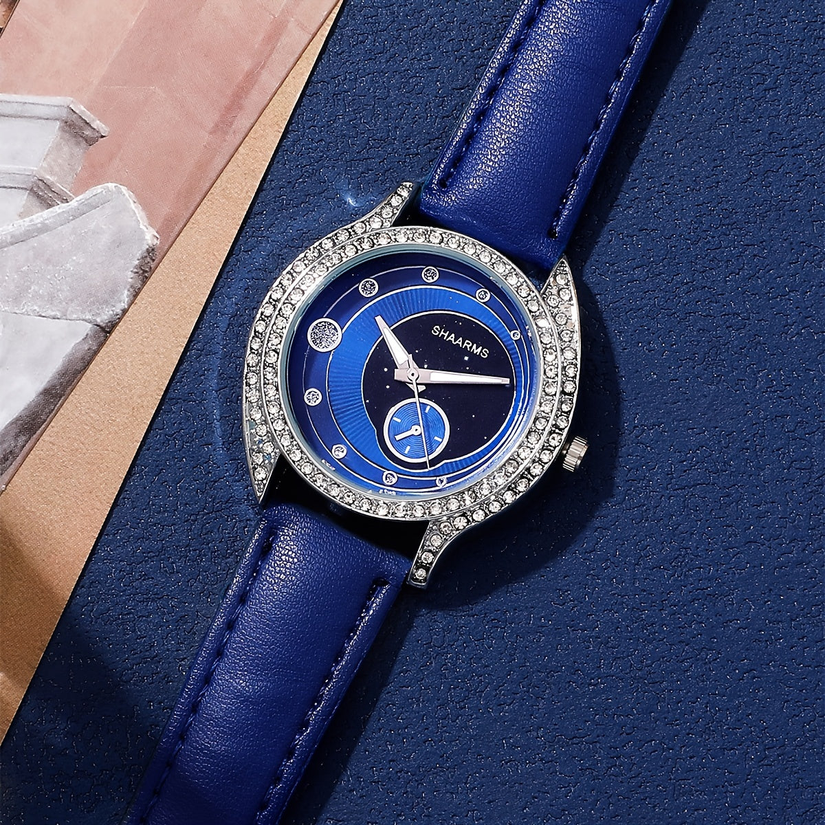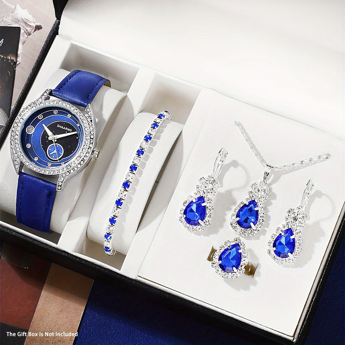 Набор из 6 женских элегантных кварцевых часов и украшений с синими ремешками и кристальными вставками