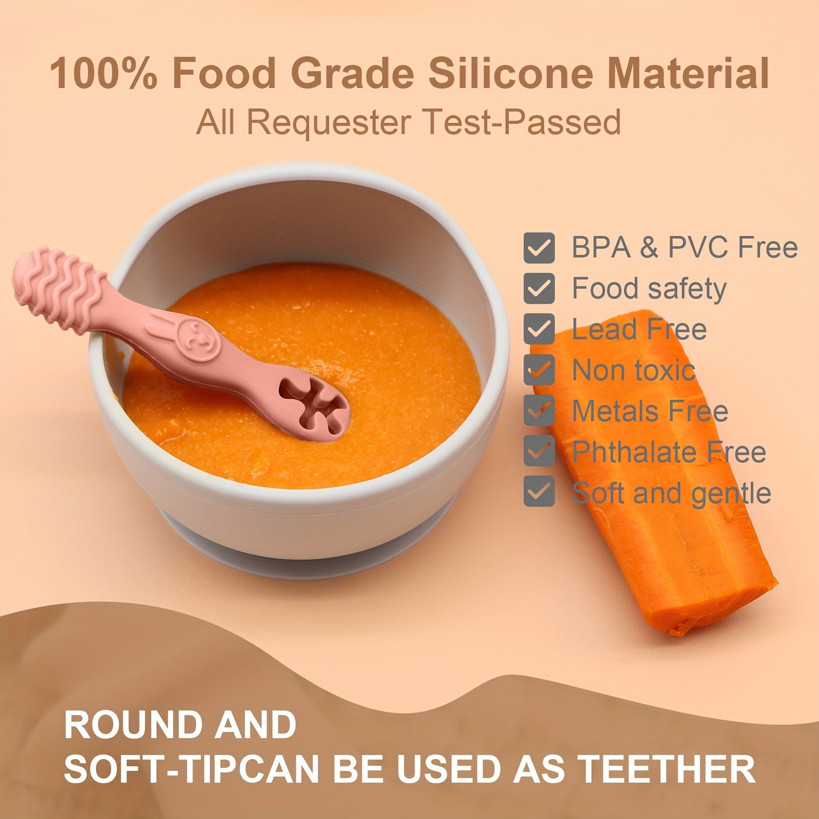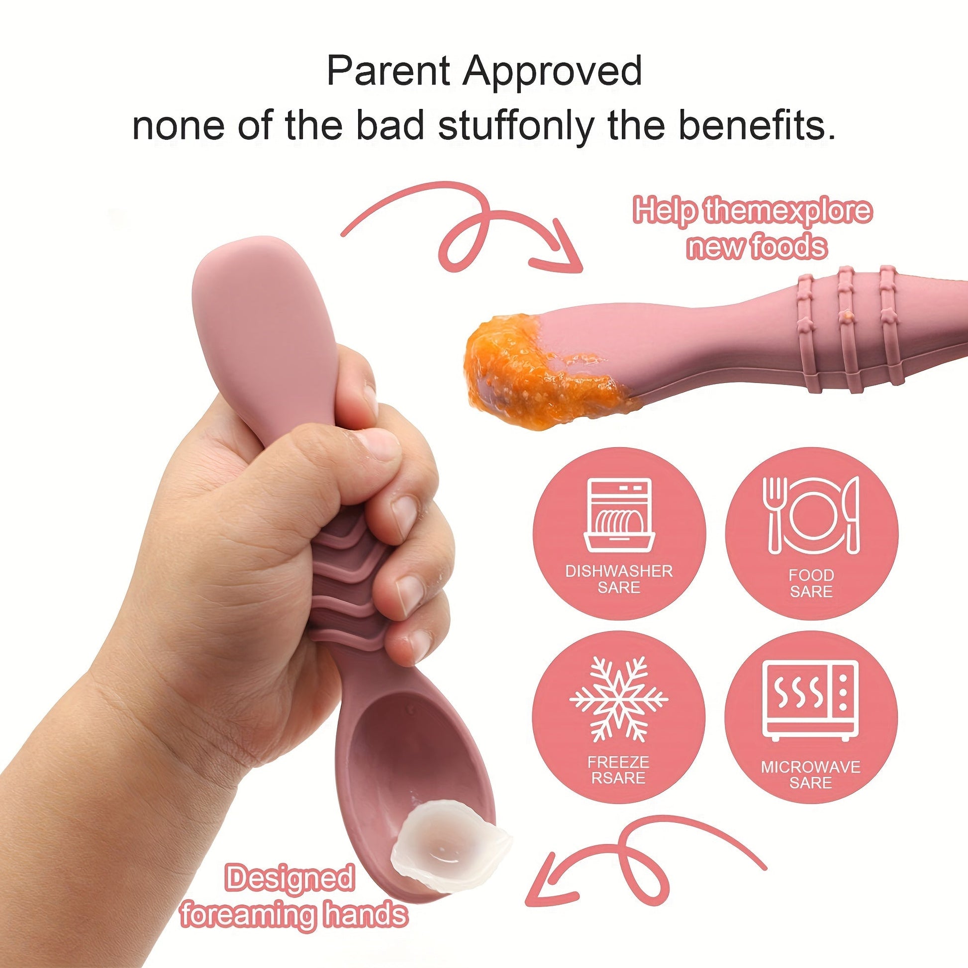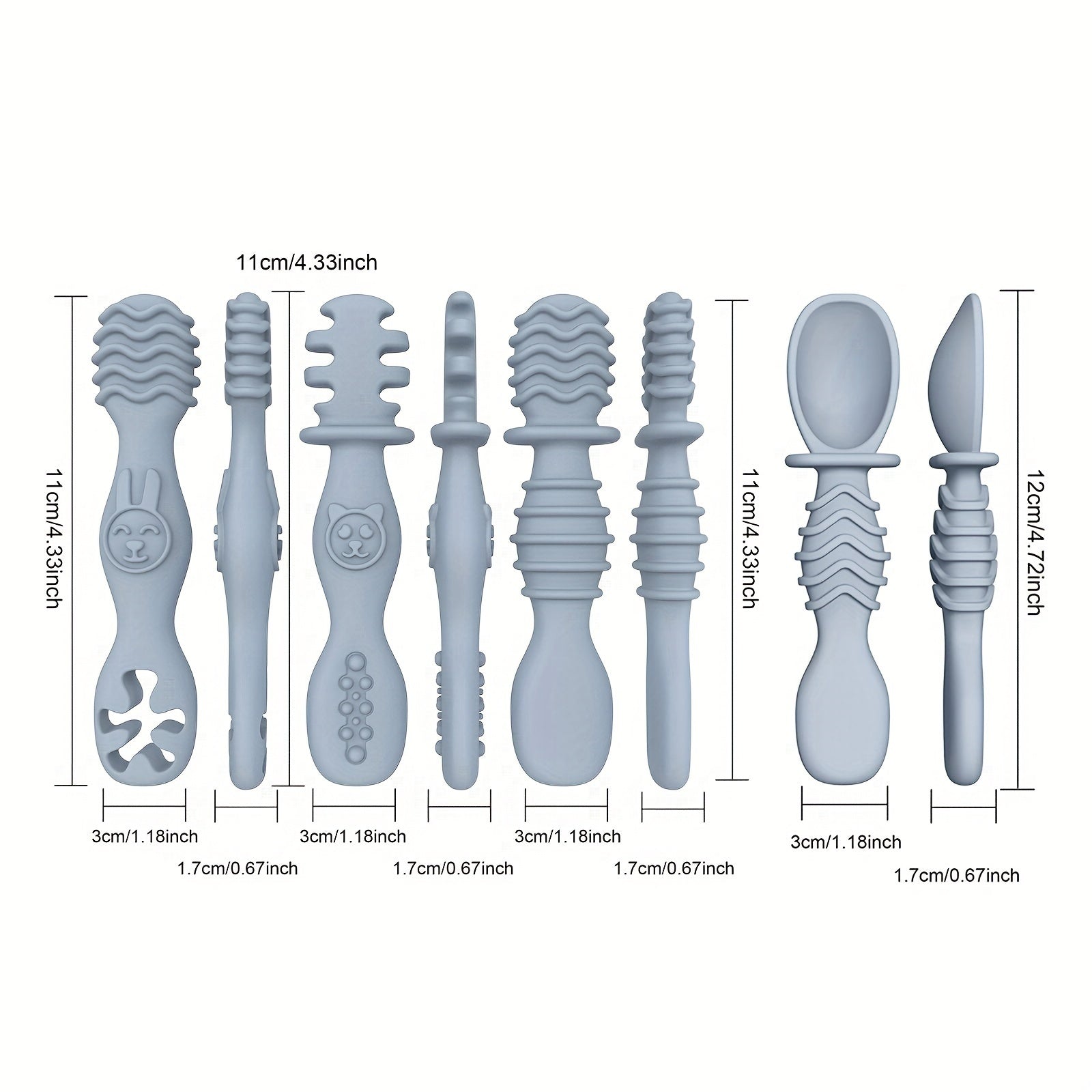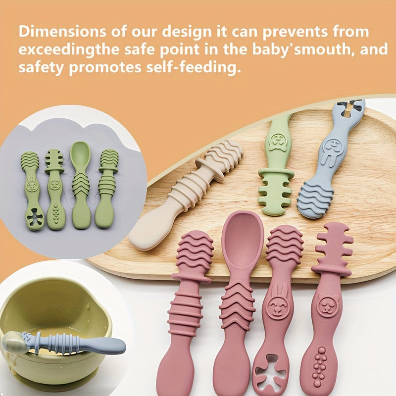 Набор из четырех силиконовых ложек для жевания для малышей, изготовленных из силиконового материала пищевого качества. В этот набор входят две ложки и две вилки, идеально подходящие для обучения и мягкого кормления для детей.