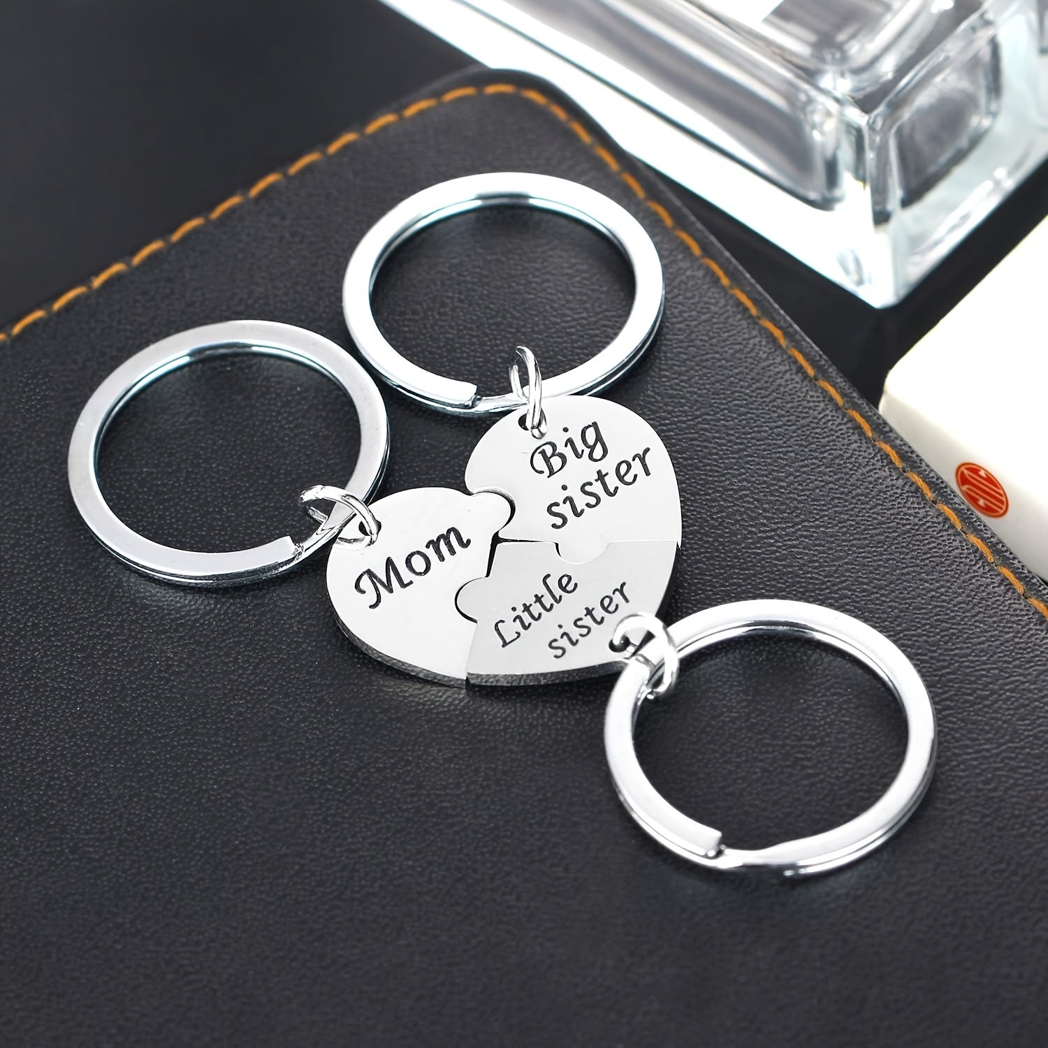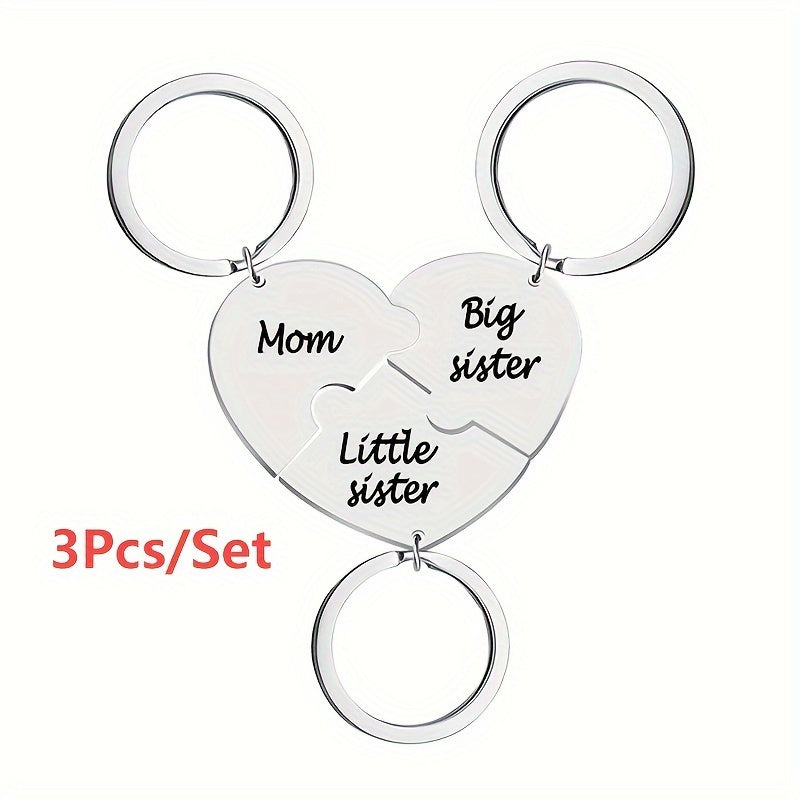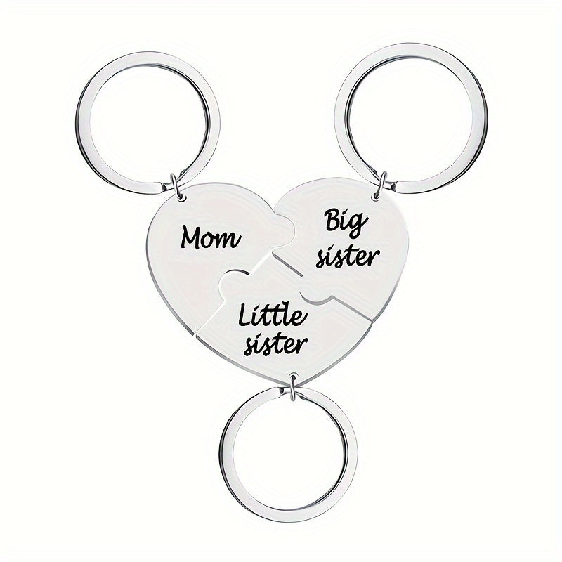 Набор из трех брелков в форме сердца для матерей и дочерей, выгравированных надписями "Мама", "Старшая сестра" и "Младшая сестра". Этот комплект аксессуаров-подвесок символизирует семейную связь.
