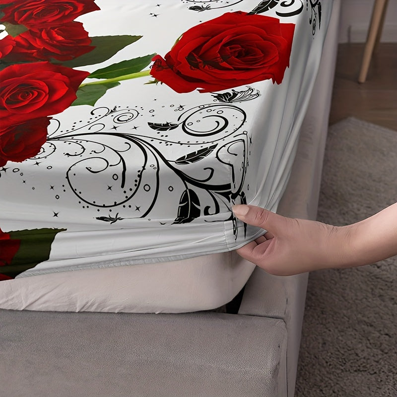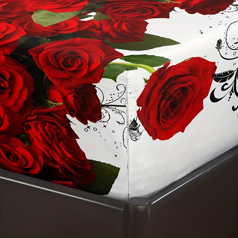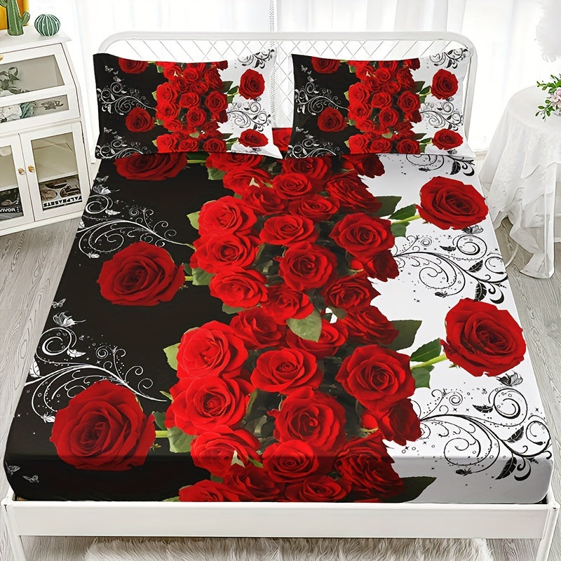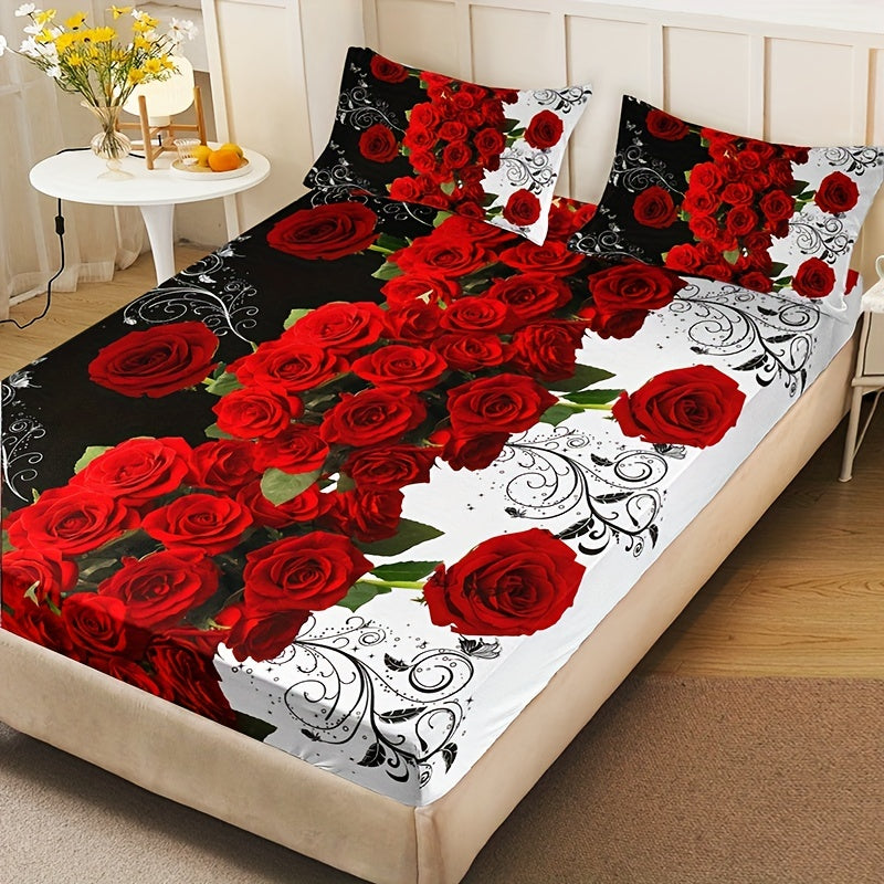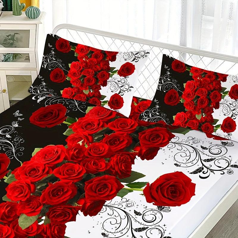 Комплект приталенных простыней с принтом красной розы, 3 предмета, мягкое дышащее постельное белье для спальни
